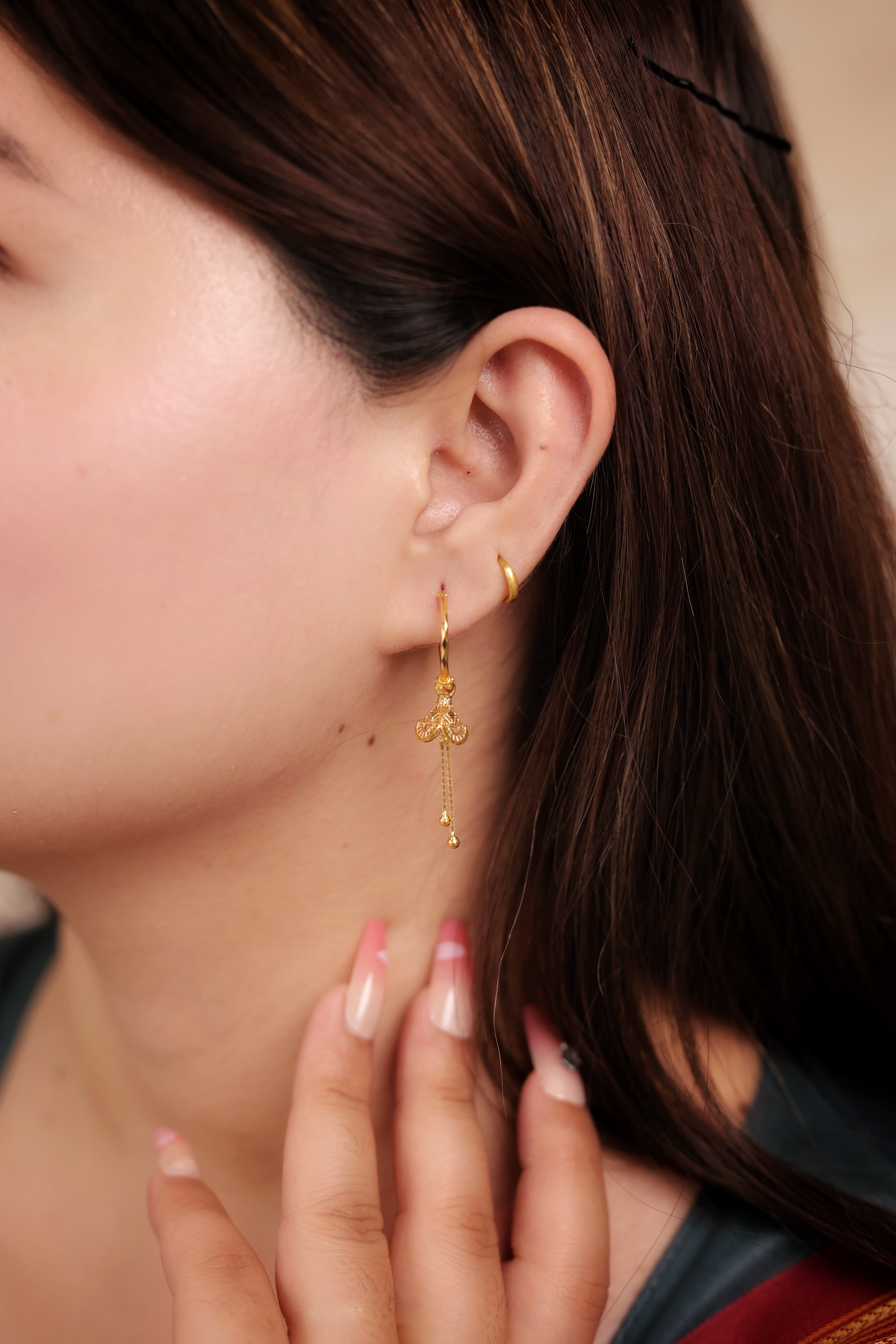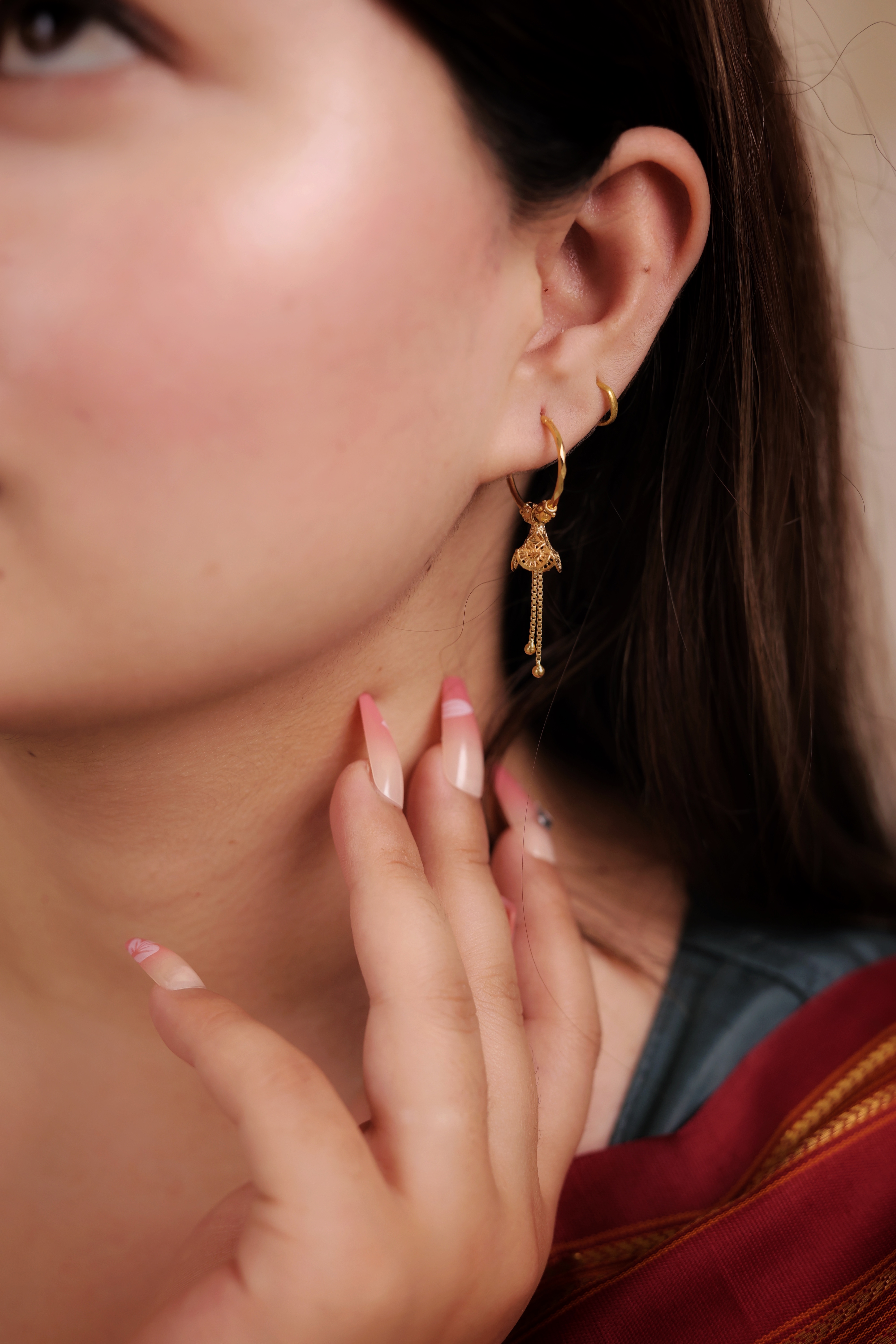 Elegant and detailed, these Gold-Plated Bali Hoops feature a small, intricately designed cutout motif (such as a petal or paisley) attached to the base, finished with tiny drop chains. They offer a refined ethnic look with beautiful movement. Lightweight