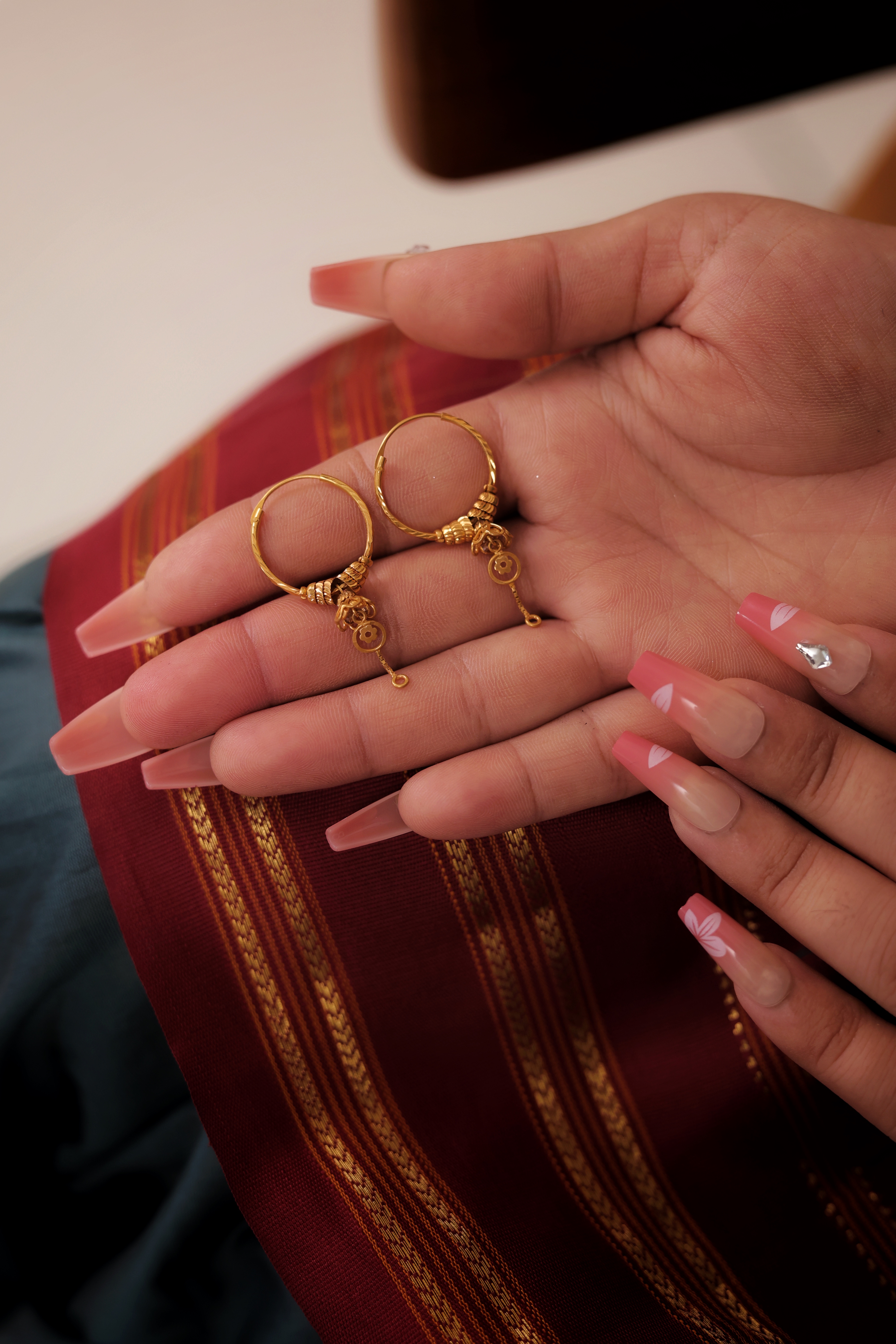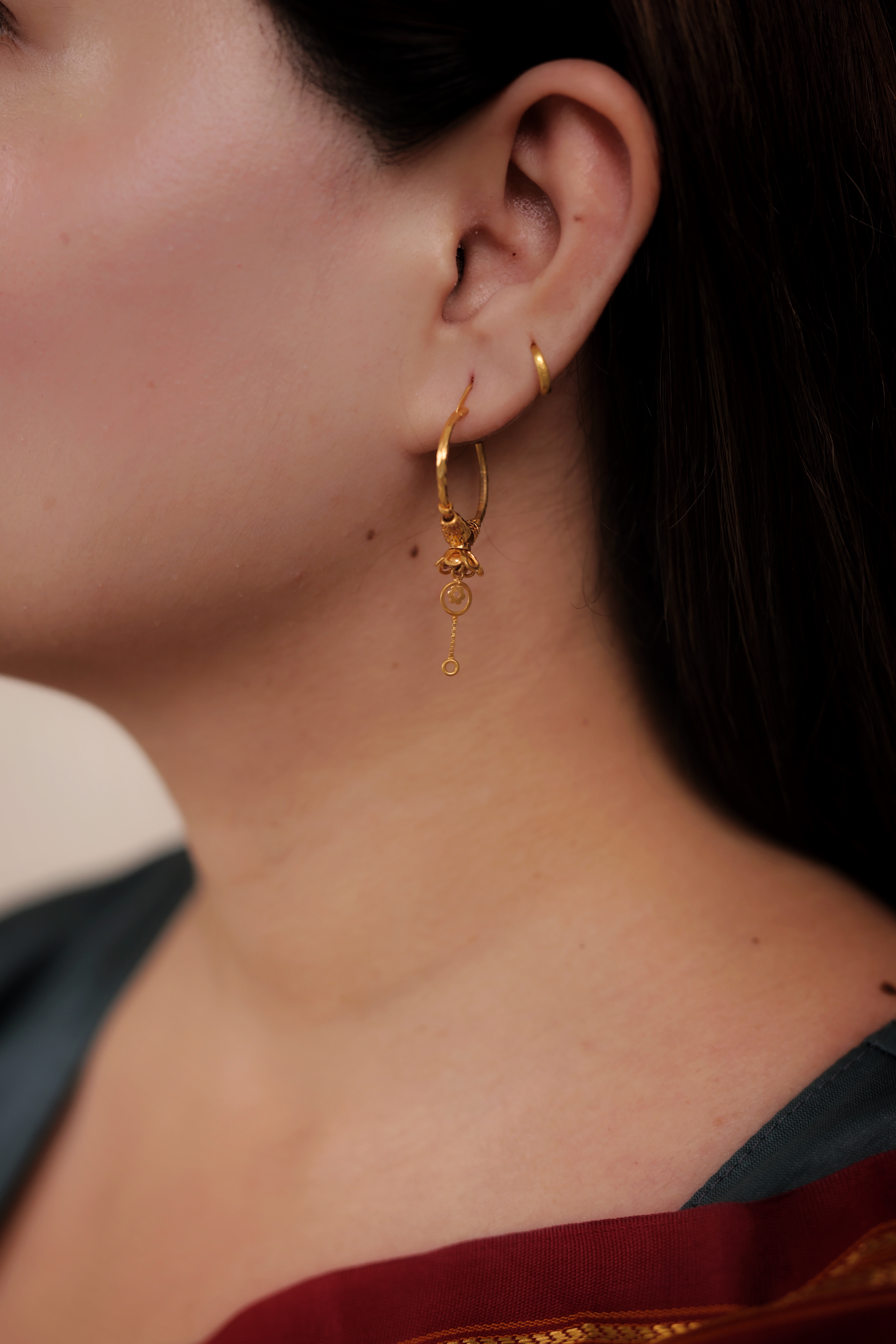 These Gold-Plated Bali Hoops are adorned with an intricately detailed, semi-circular or floral motif at the base, followed by elegant, articulated loop drops. This design offers a richer, more festive look than a simple hoop. Ideal for special occasions a