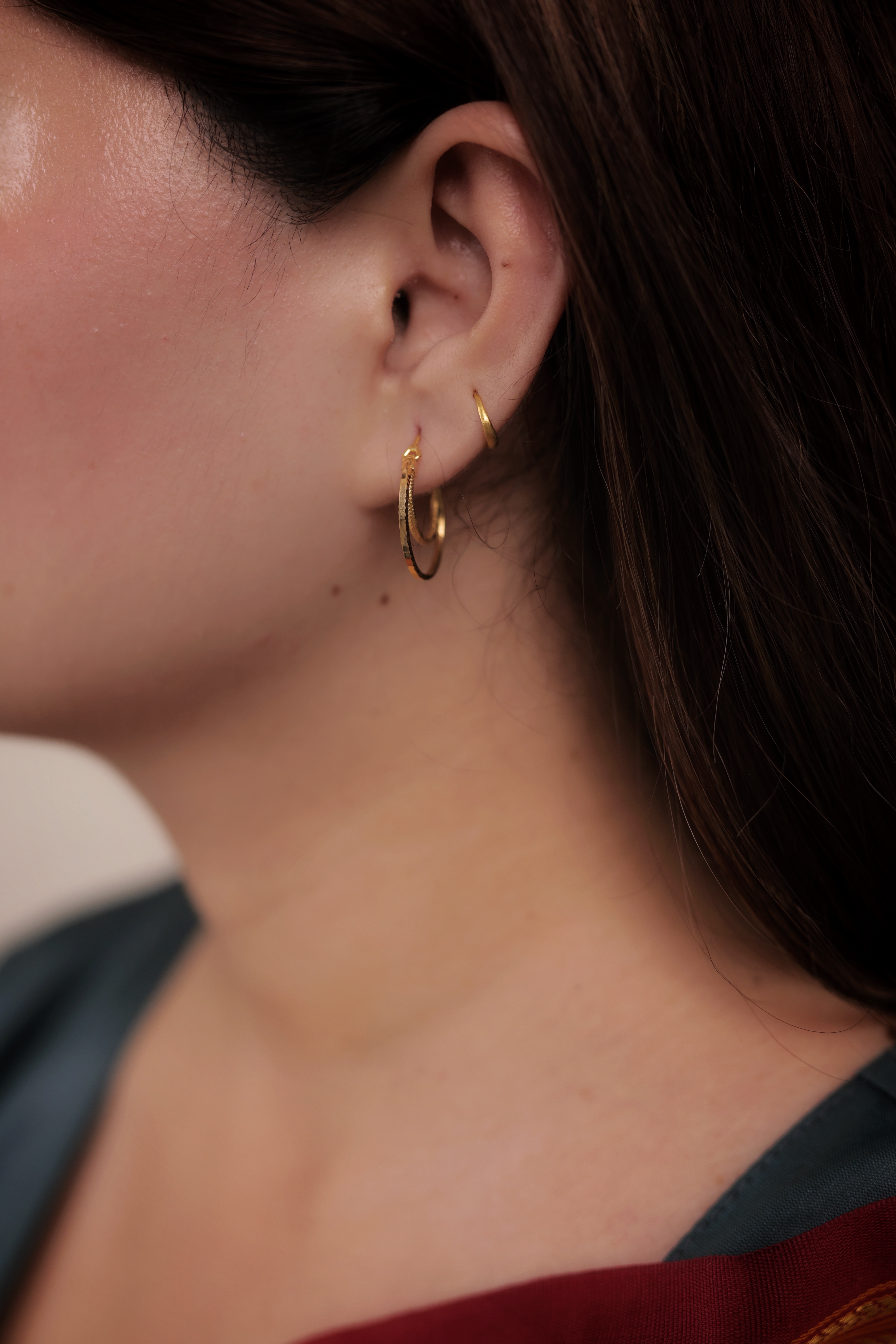 Key Design Features: (Key Features)Unique Double Hoop Design: Features two rings nested together, creating a fashionable stacked or layered appearance. Dimensional Texture: The slightly differing textures (if present) between the rings enhance light reflection and depth. Single Piercing Solution: Offers the complex look of stacking without the need for multiple ear piercings. Secure and Seamless: Designed with a reliable closure that keeps the detailed layers perfectly aligned. Skin Safety: Crafted using a Nickel-free and Lead-free base metal for sensitive skin.