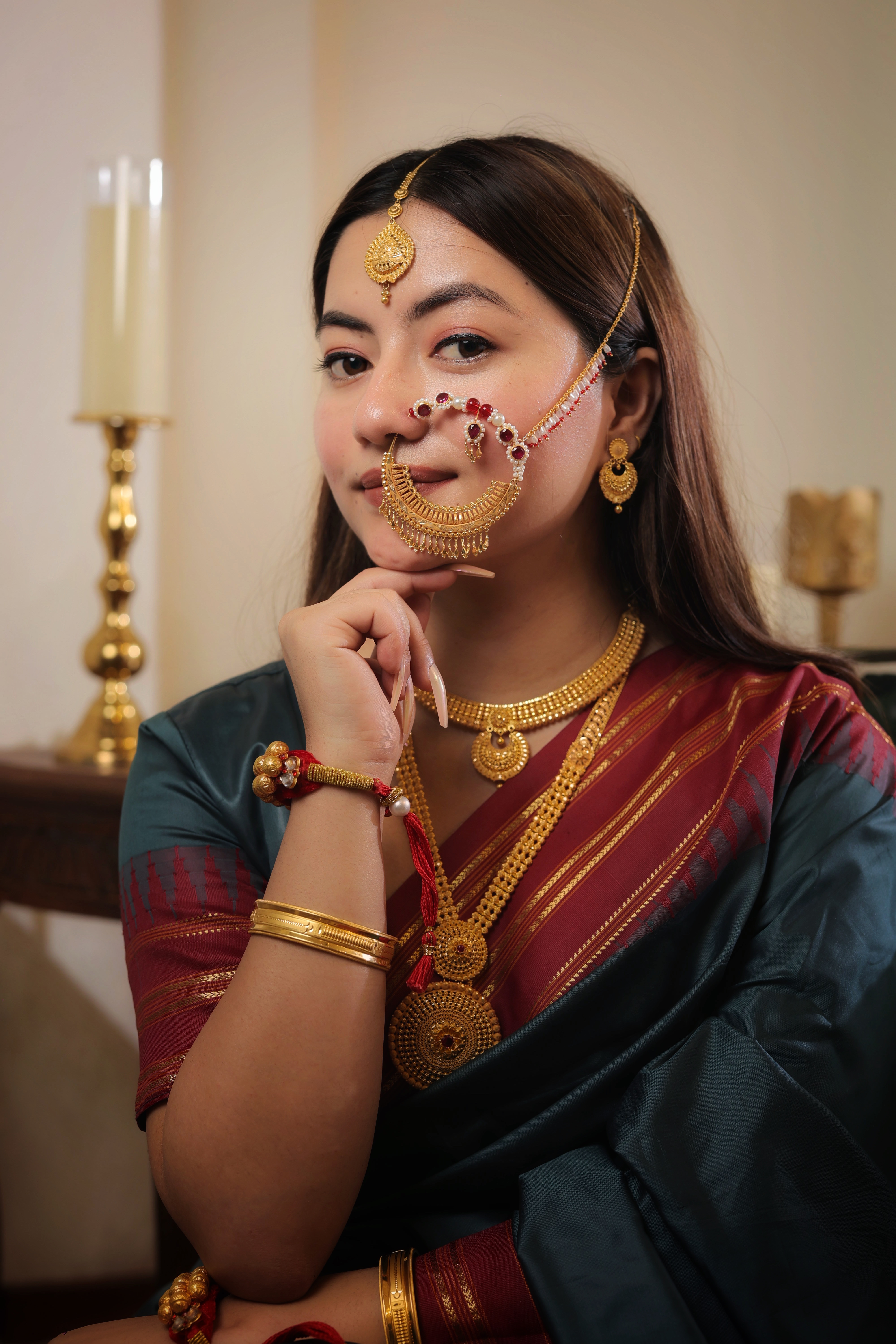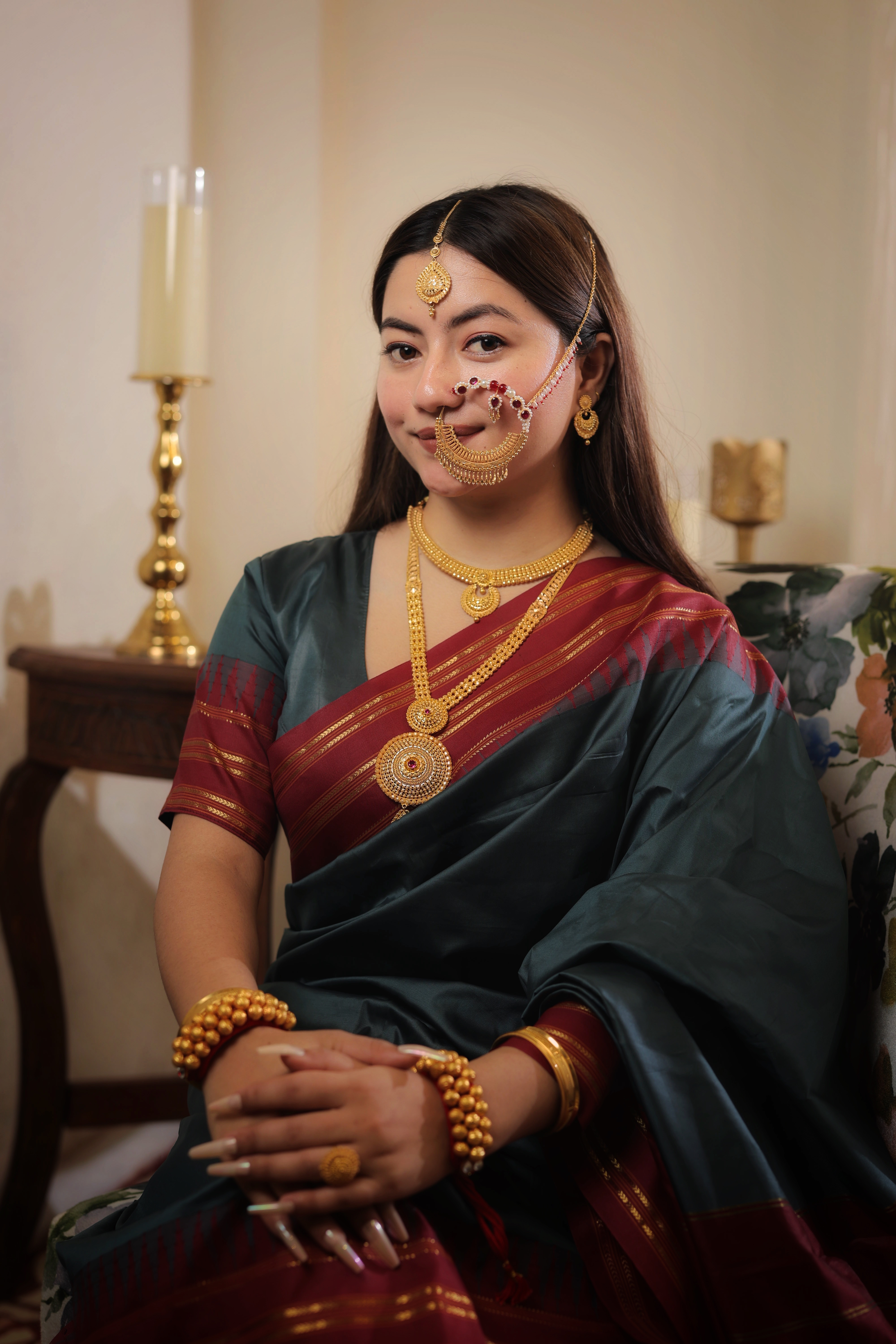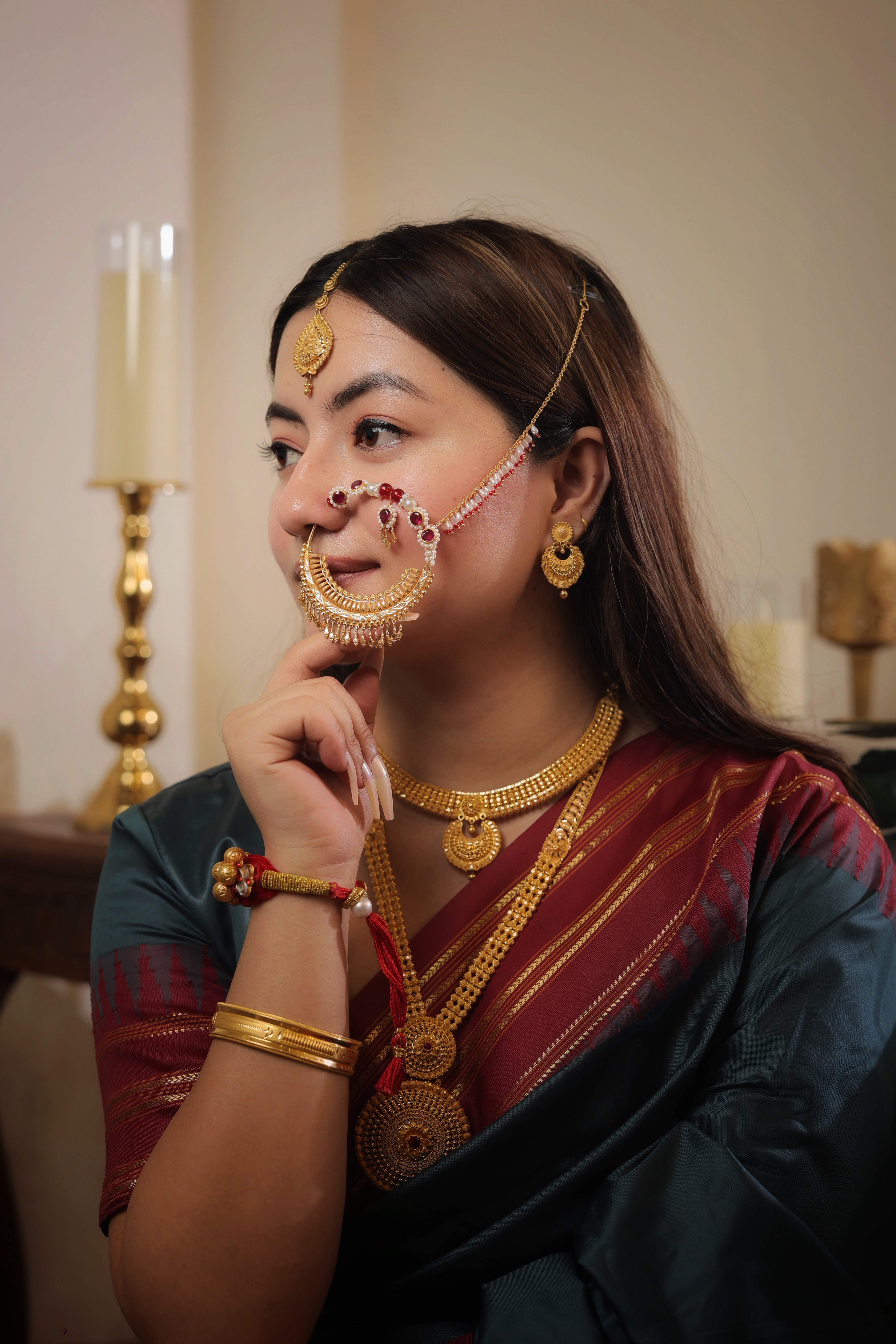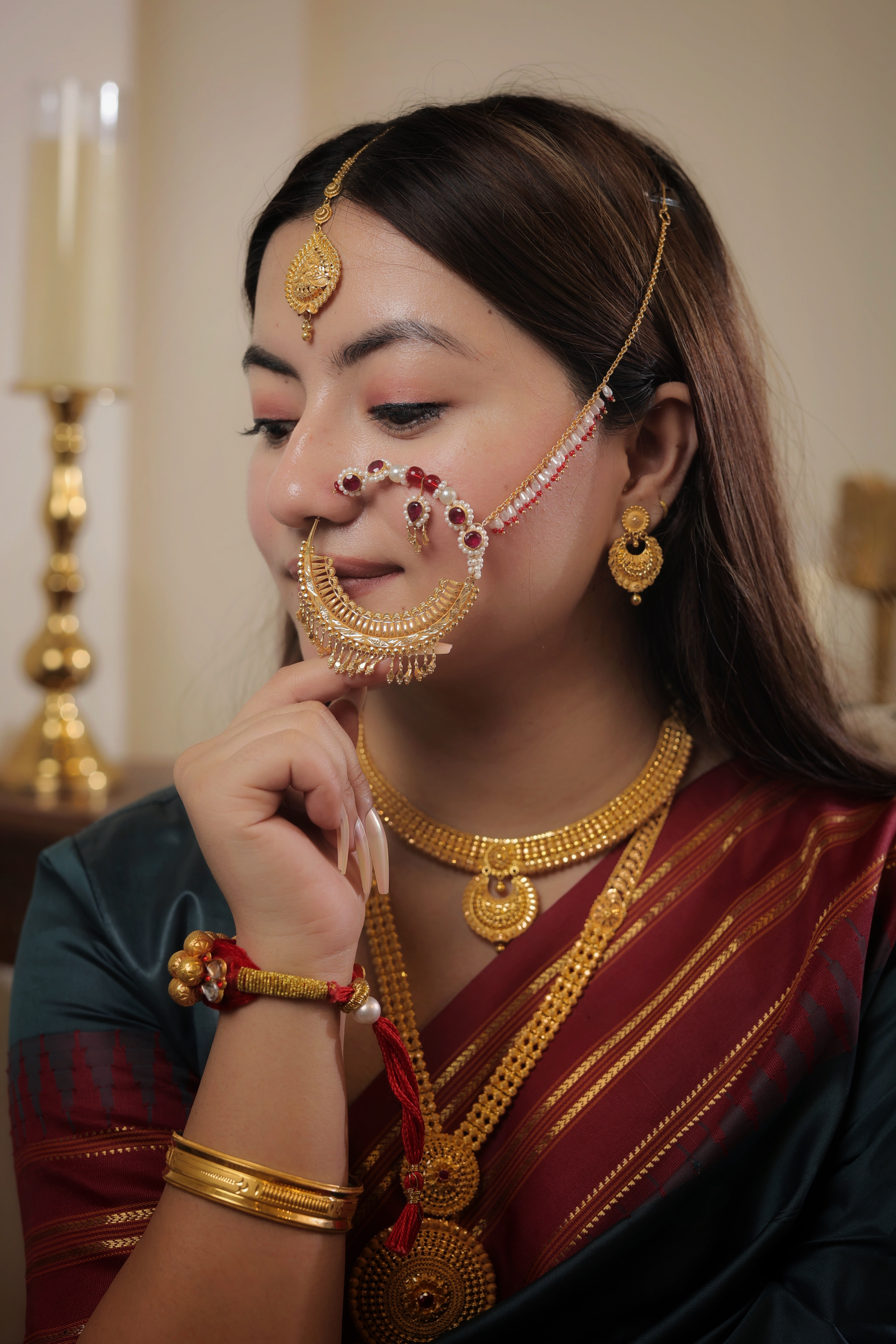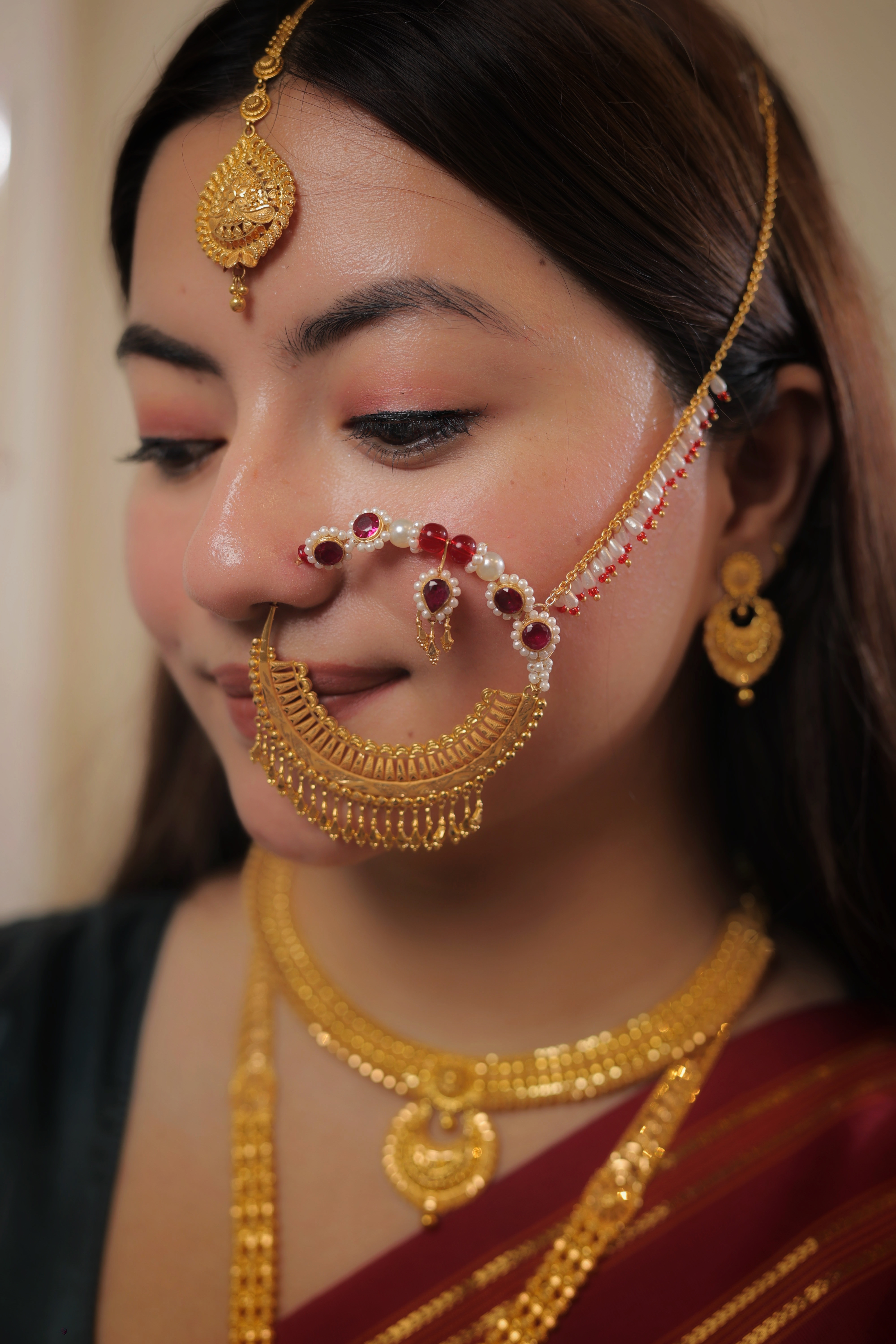 This Nath is handcrafted from Genuine Solid Gold, guaranteeing its status as a piece of supreme value and cultural significance. The rich Gold tone is perfect for complementing the most elaborate traditional attire.