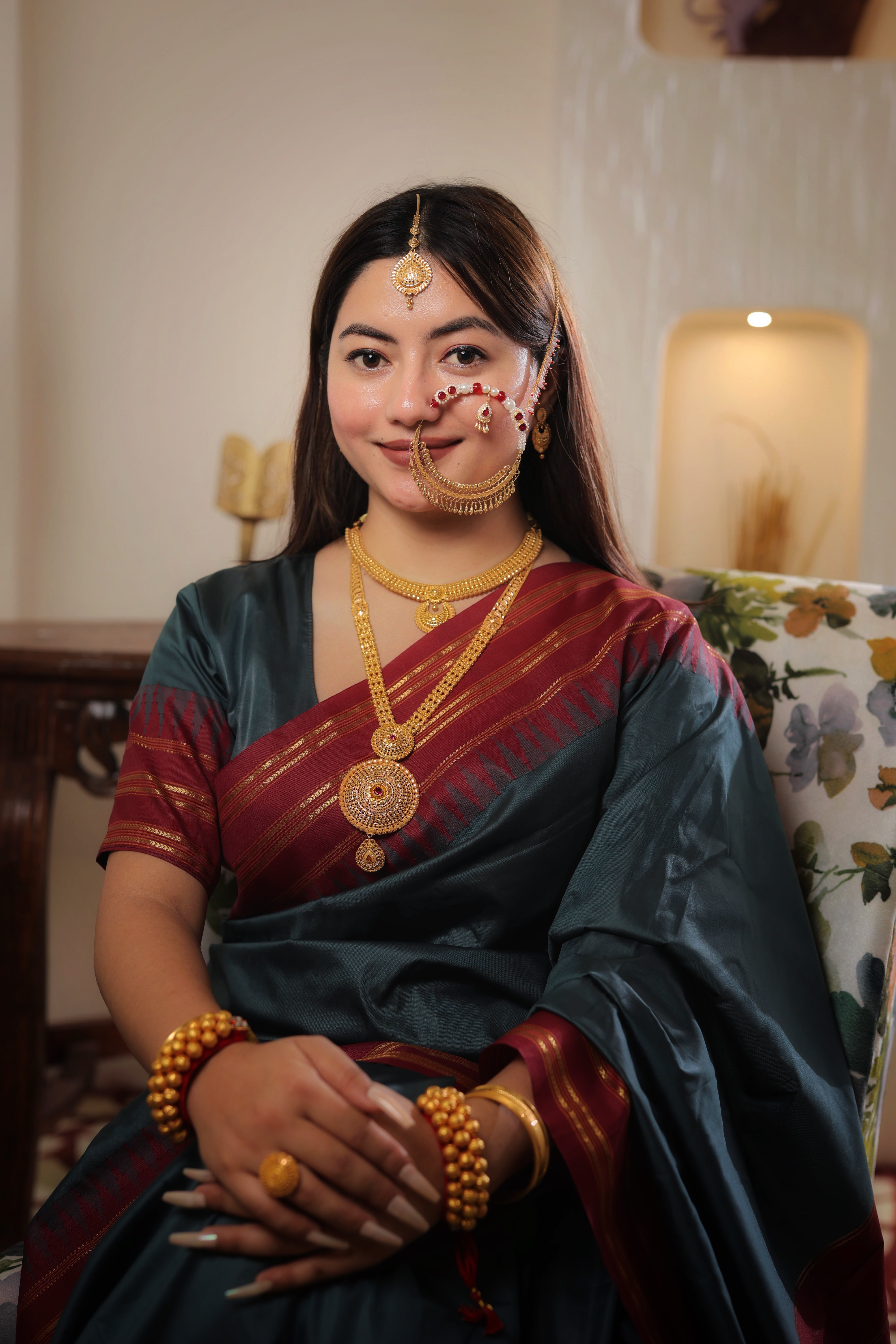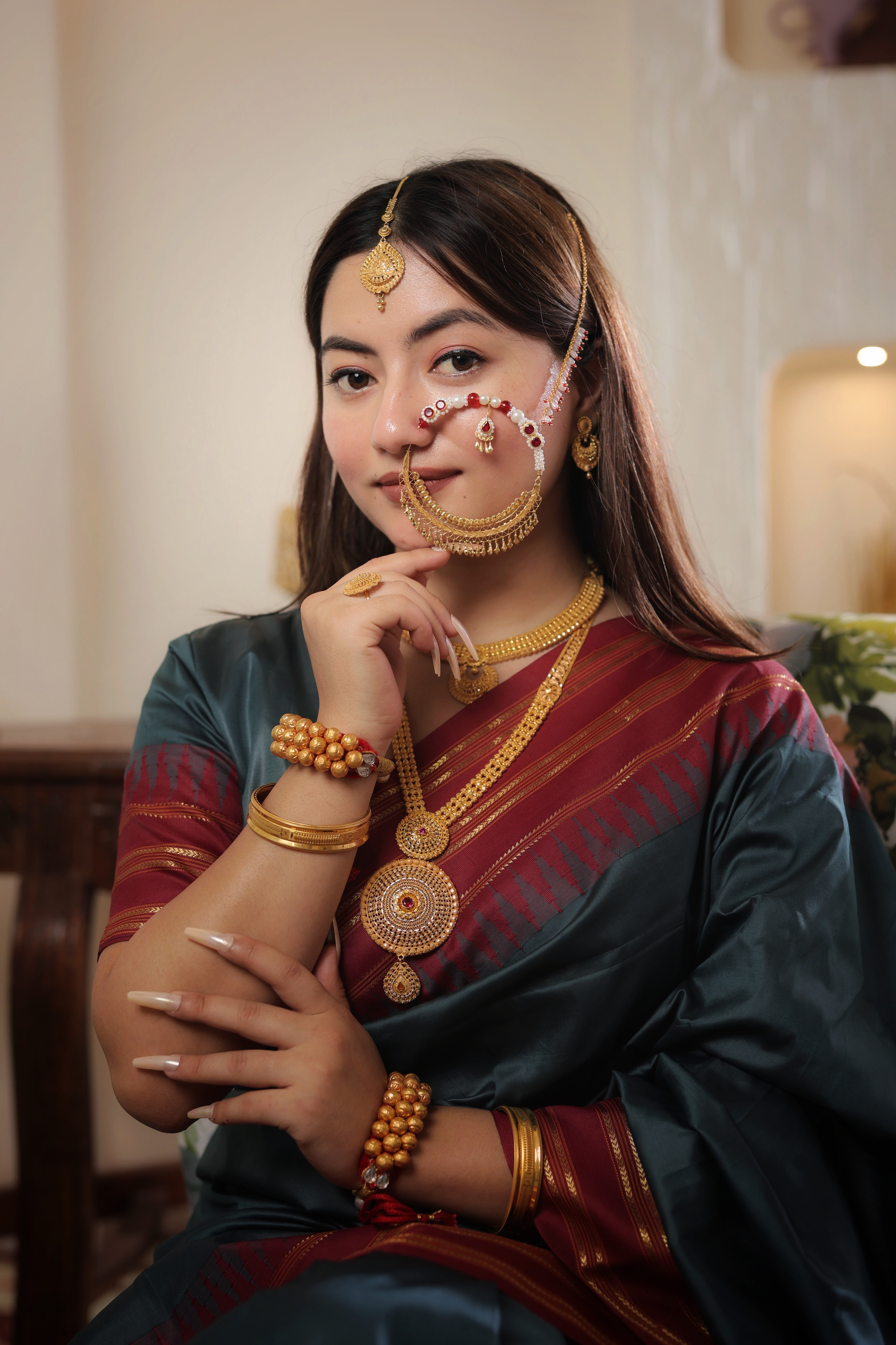 This grand piece is secured by a fine gold chain (Sankli) that connects to the hair, and it is a key component of many traditional wedding ensembles.