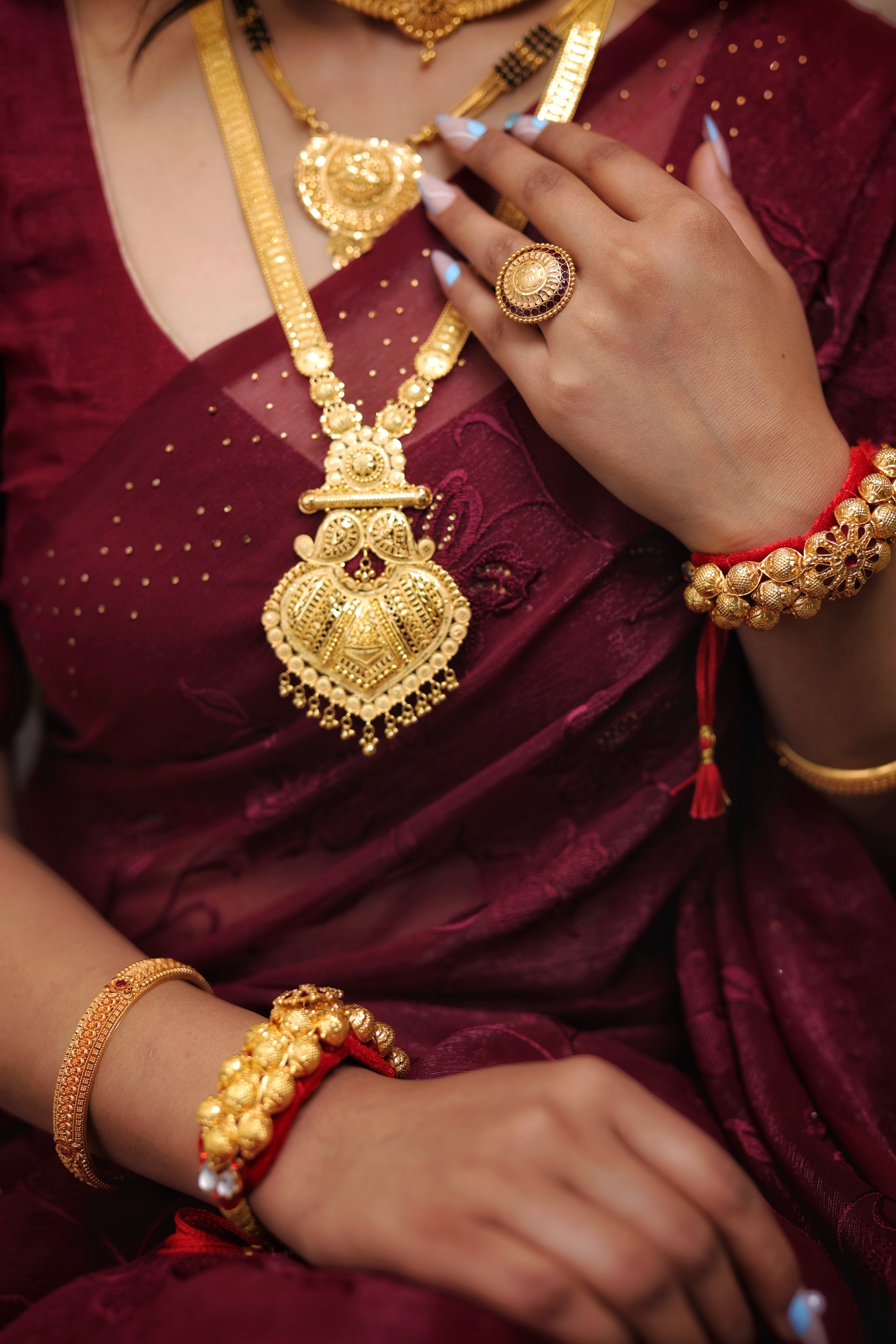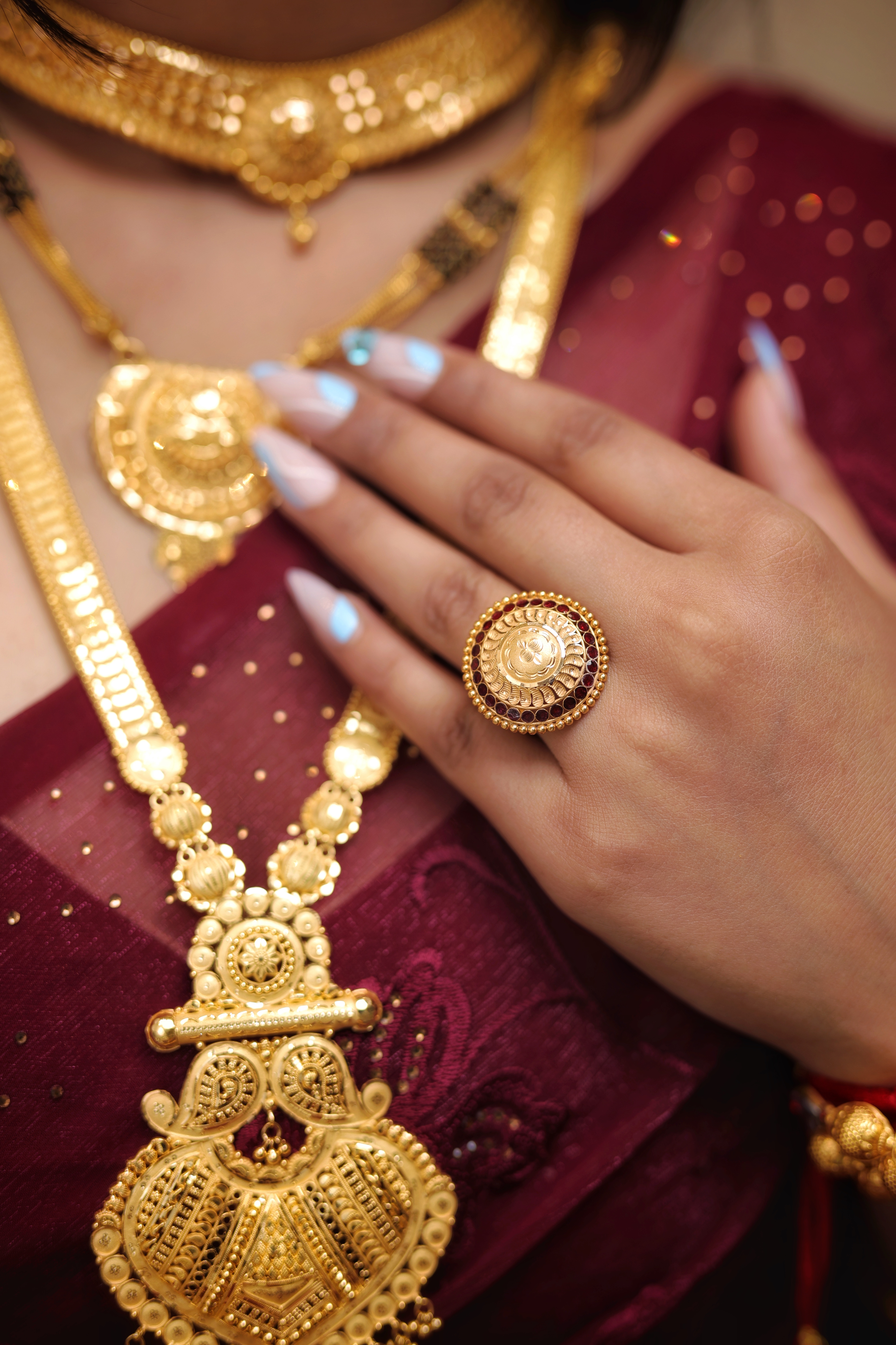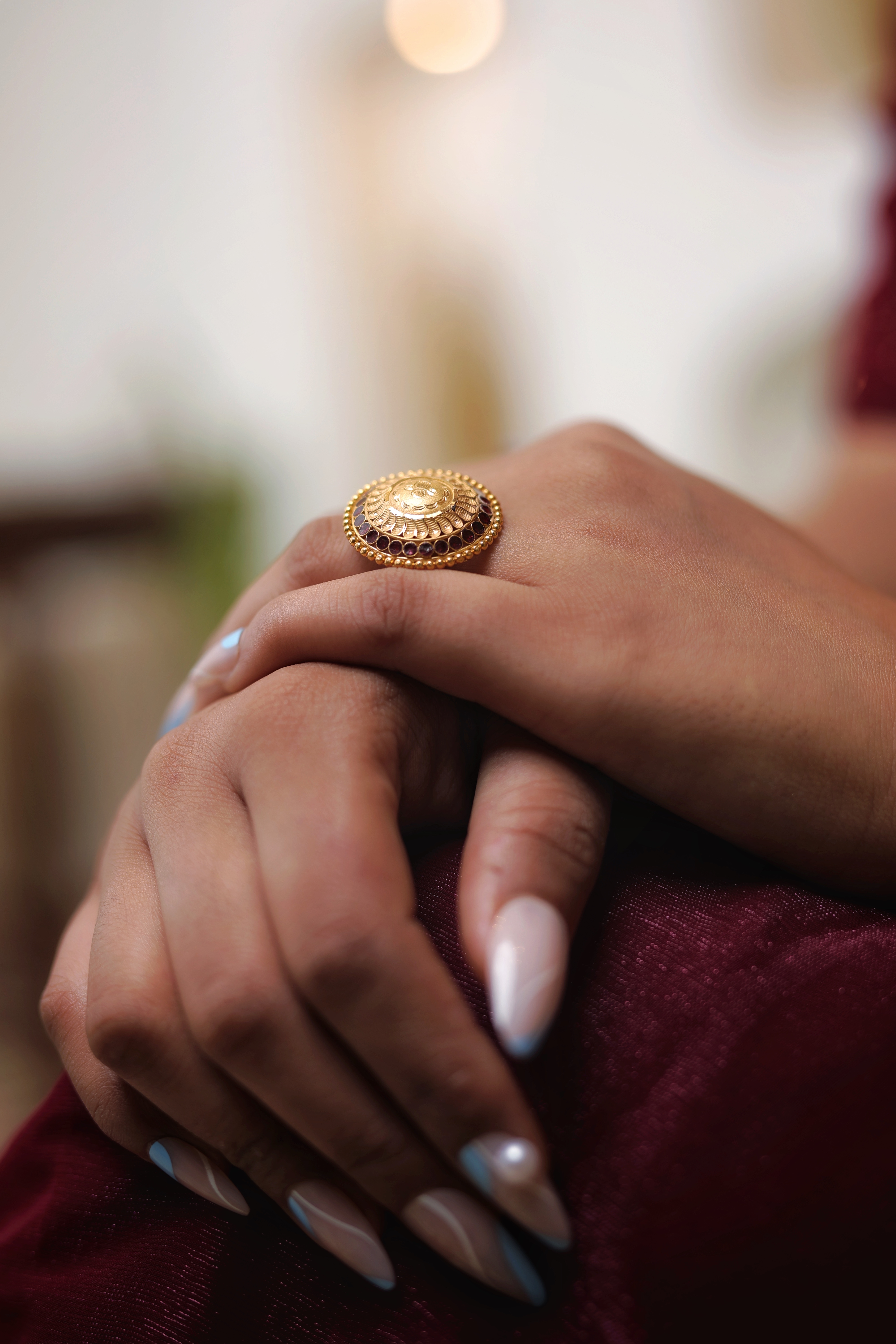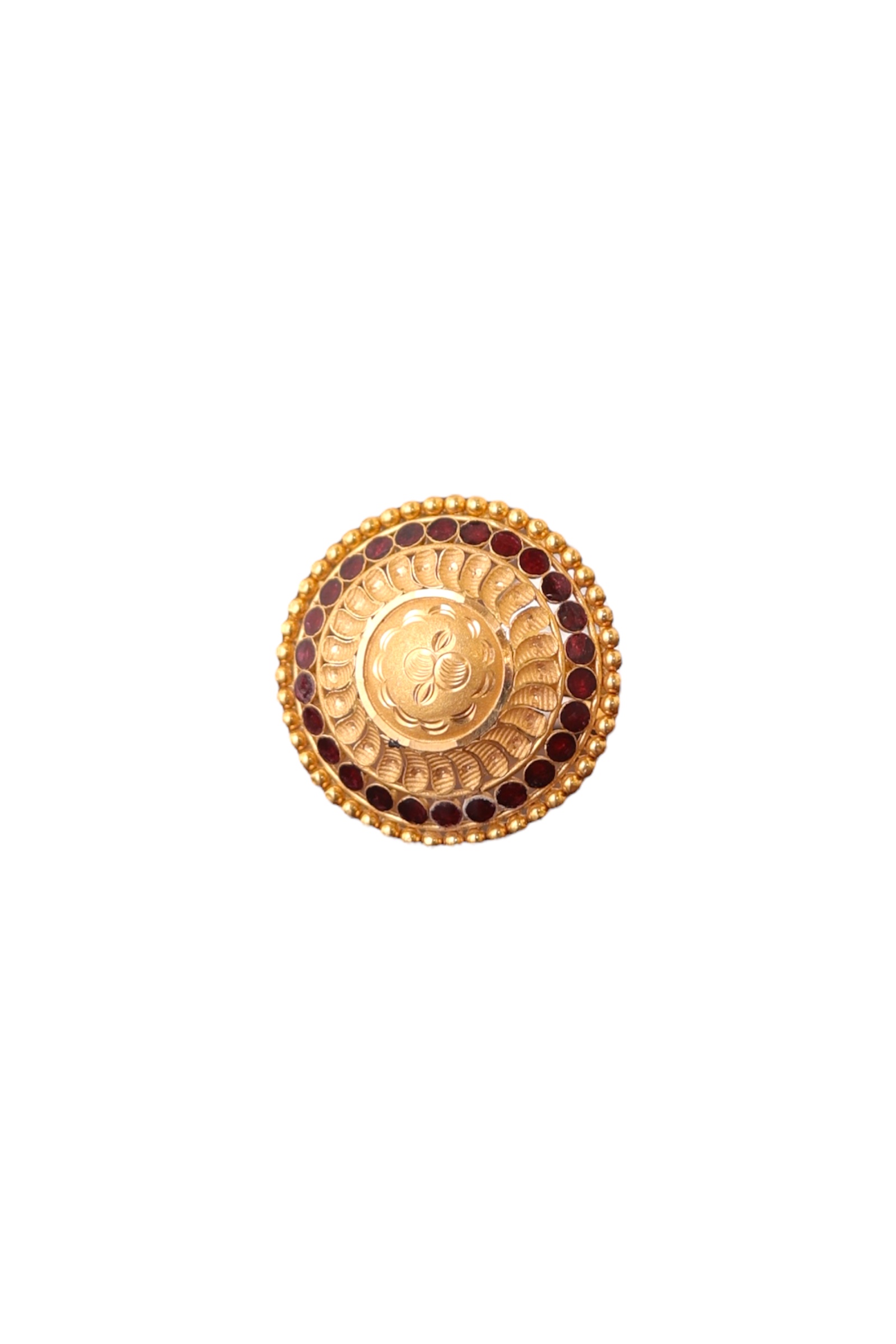 Key Features:Design: Large, circular cocktail ring with a highly textured face. Embellishments: Prominent gold granulation bordering the main disc. Craftsmanship: Detailed traditional metalwork for a bold, dimensional look. Metal Purity: Assumed 22 Carat Yellow Gold (916 purity). Usage: Ideal for ceremonies, festivals, or as a high-impact accessory.