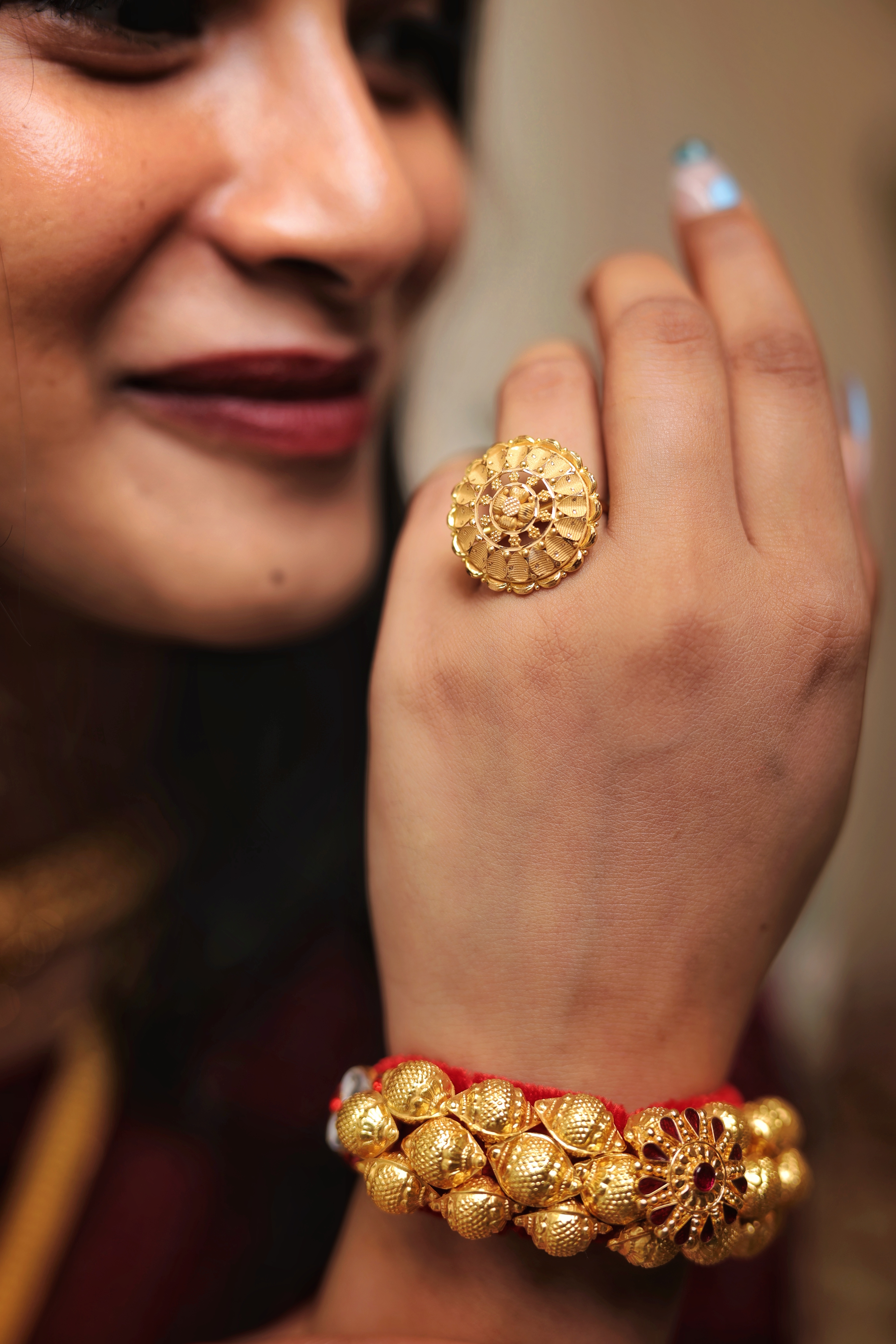 Key Features:Design: Large, circular cocktail ring with a pronounced, multi-layered floral motif. Central Detail: Features a central flower cluster built with granulation (No ruby/stone visible). Craftsmanship: Detailed traditional metalwork for a bold, dimensional look. Metal Purity: Assumed 22 Carat Yellow Gold (916 purity). Usage: Ideal for ceremonies, festivals, or as a high-impact accessory.
