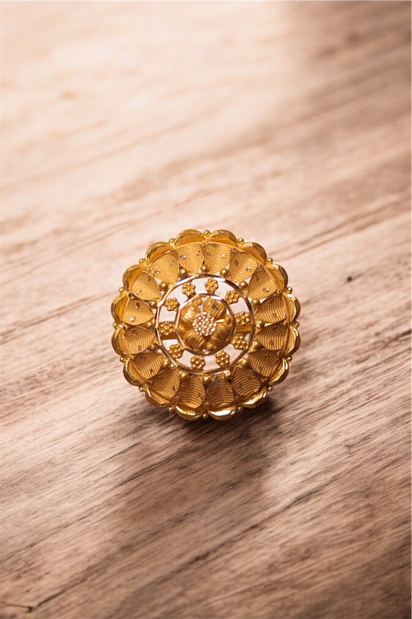 This magnificent cocktail ring is designed to be a luxurious, highly visible statement piece, crafted in rich 22-carat yellow gold. The ring features a large, prominent circular face detailed with intricate layered goldwork to create a dimensional floral or sunburst motif. The outer border consists of finely detailed, overlapping gold petals, while the center showcases a complex flower cluster created using fine granulation and filigree. This high-volume design catches the light beautifully, highlighting the exceptional craftsmanship and purity of the gold.