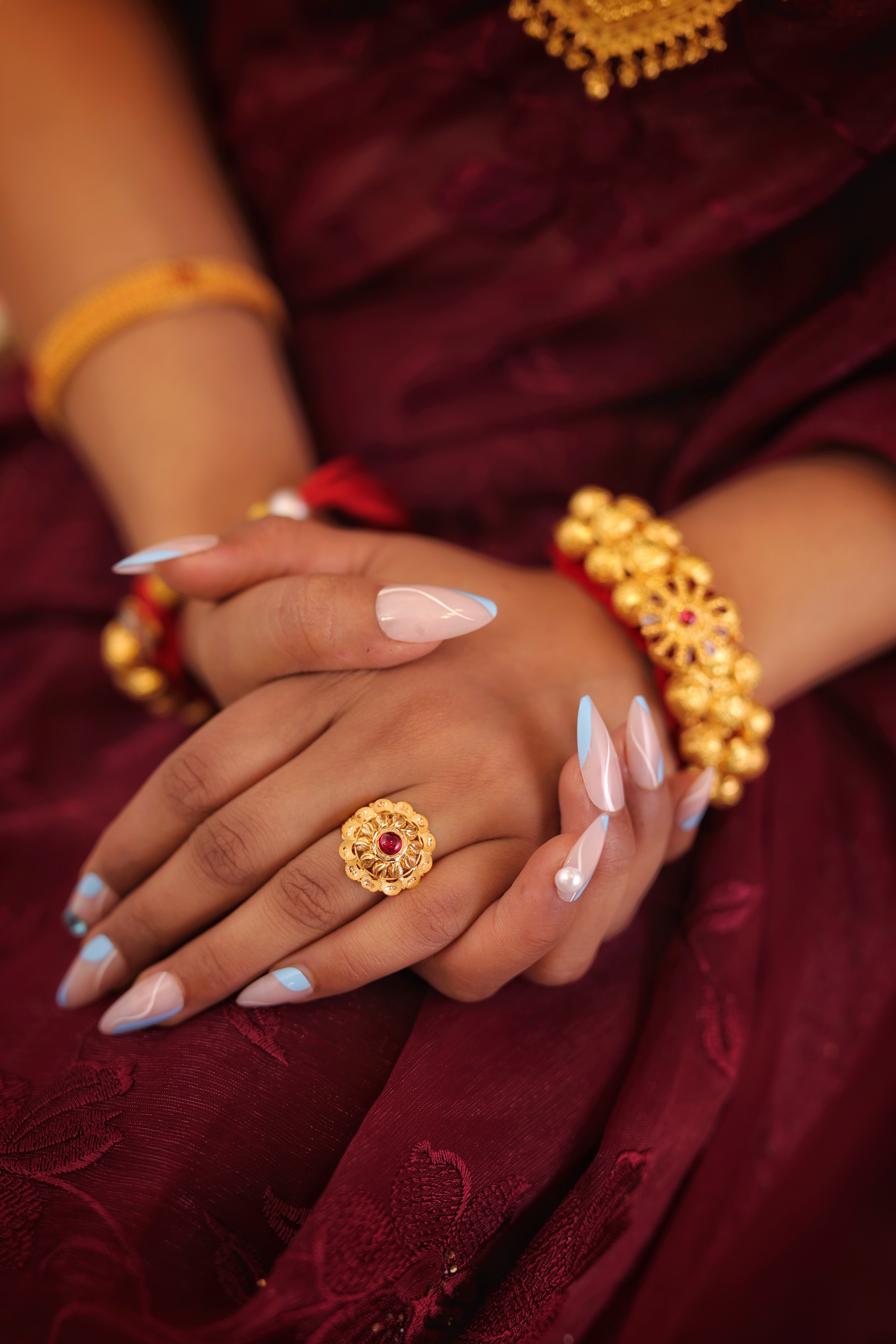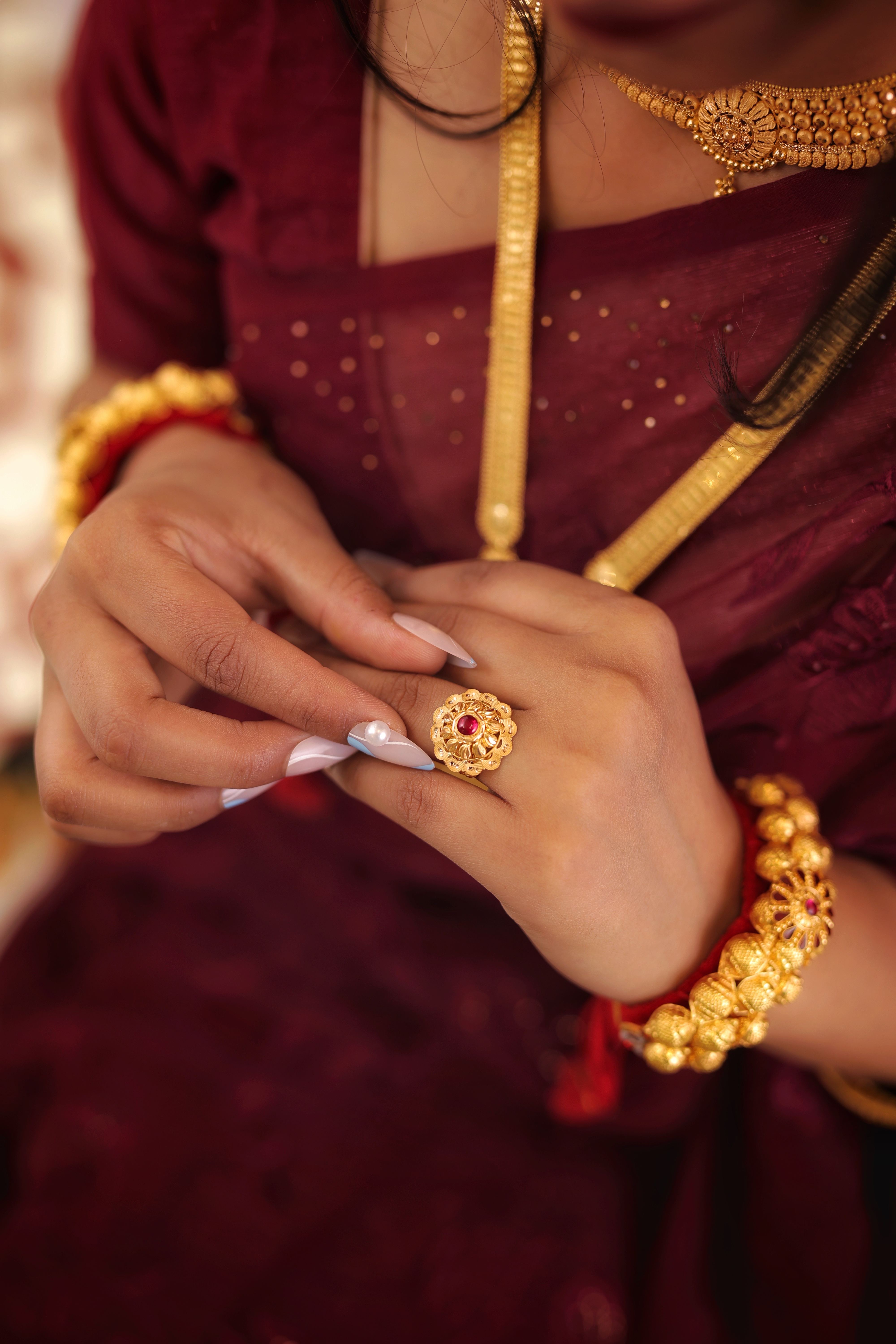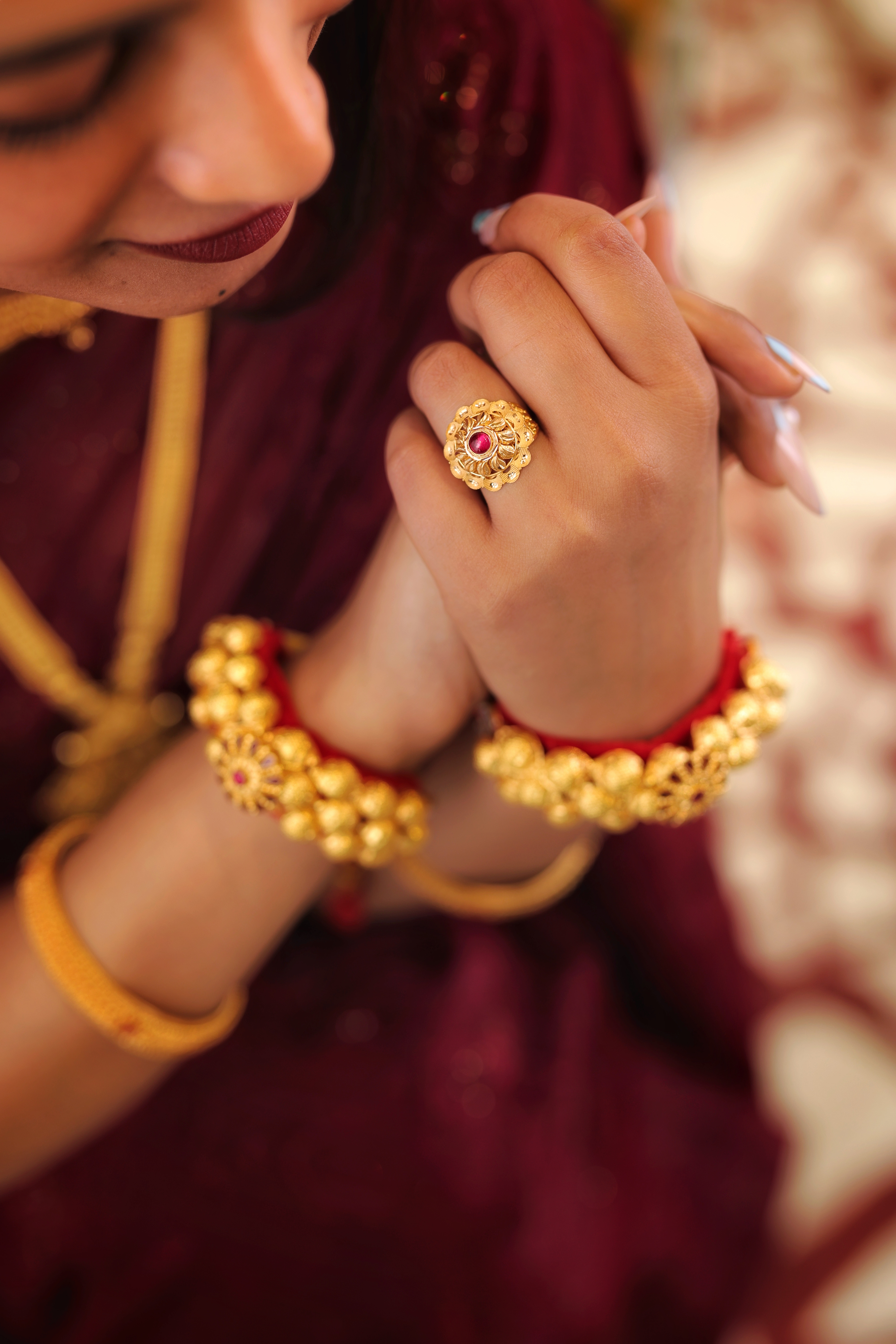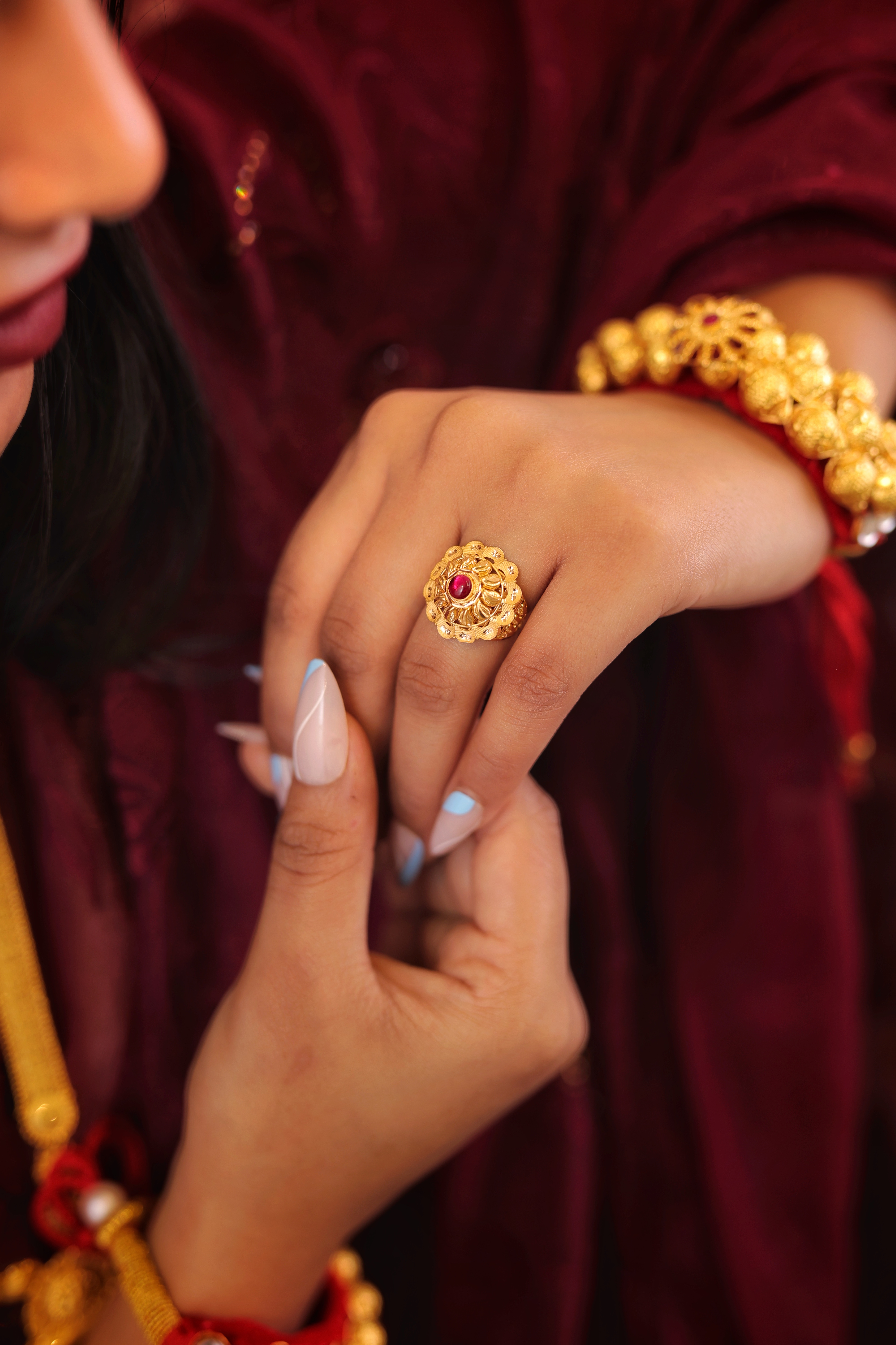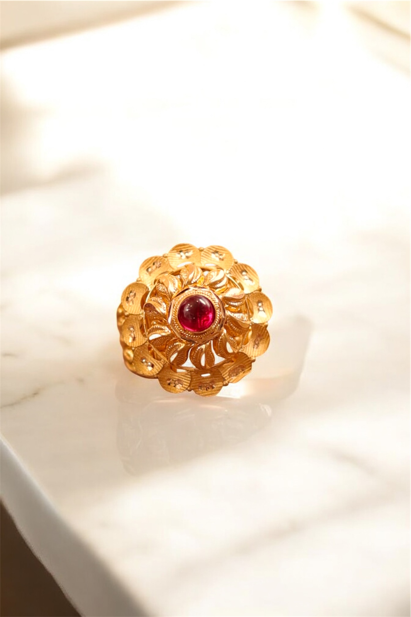 Key Features:Design: Large, circular dome cocktail ring with a prominent red central stone. Embellishments: Central red stone surrounded by intricate, layered gold petals and filigree. Craftsmanship: Detailed traditional metalwork for a bold, three-dimensional look. Metal Purity: Assumed 22 Carat Yellow Gold (916 purity). Usage: Ideal for ceremonies, festivals, or as a signature traditional accessory.