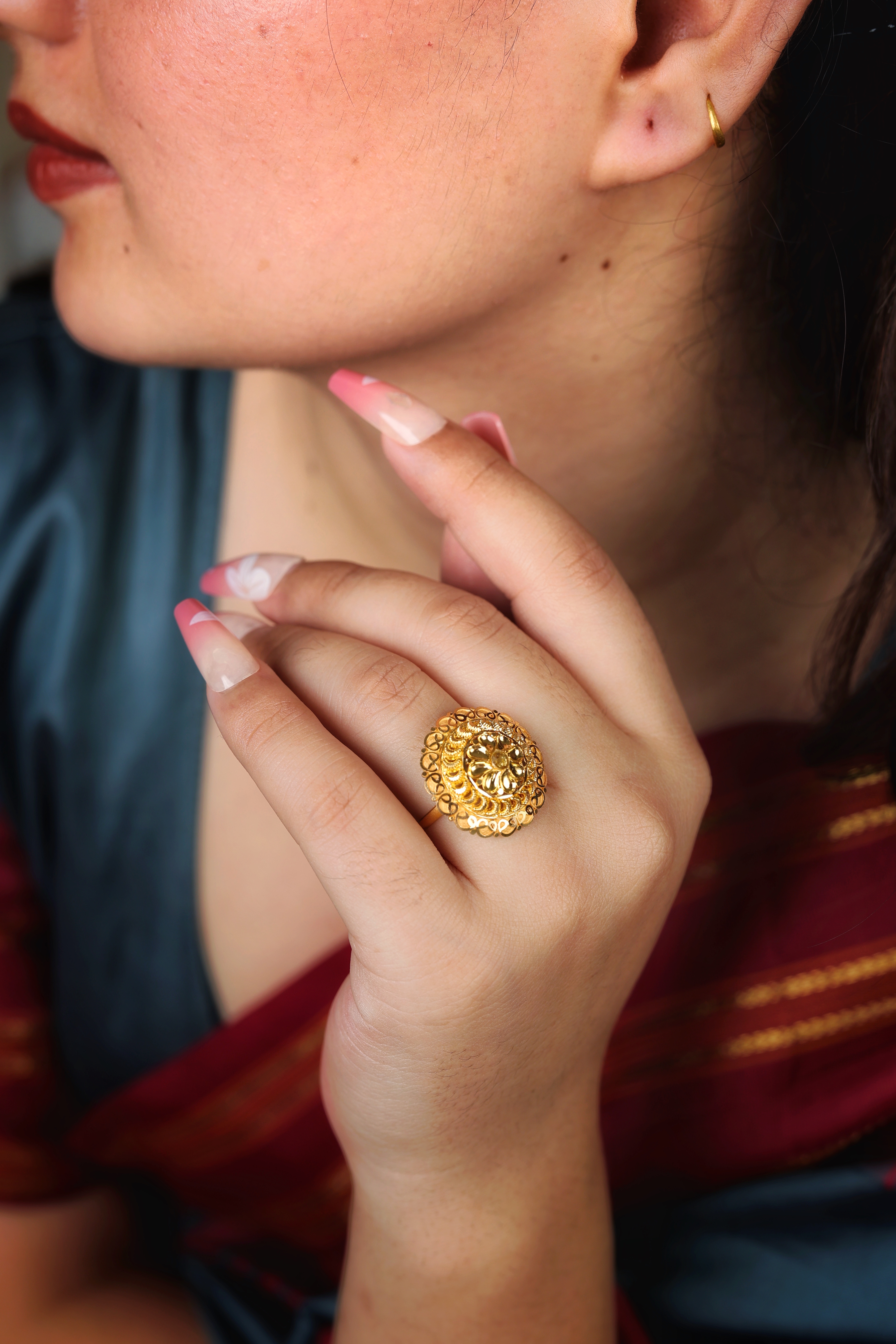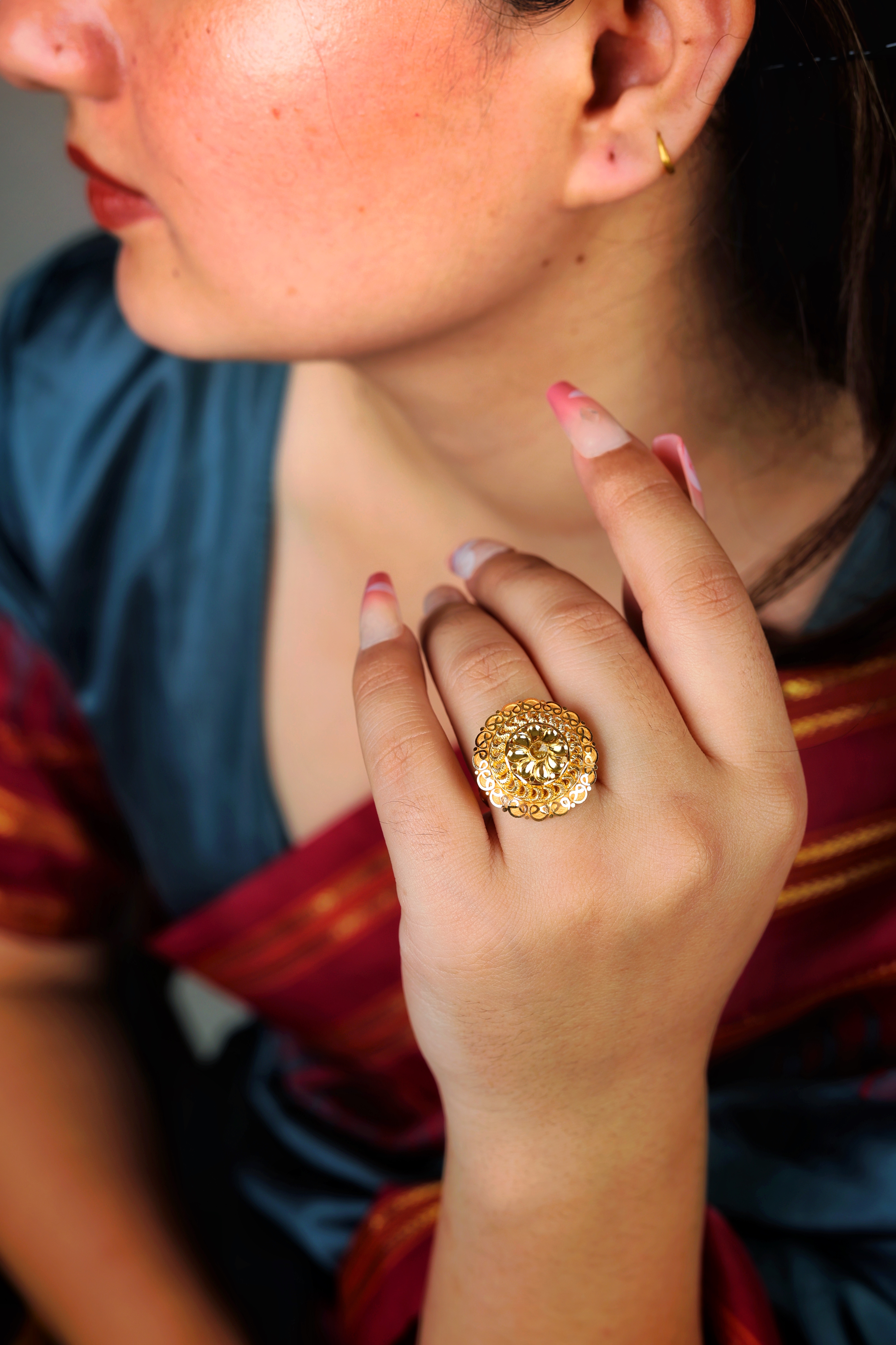 This magnificent cocktail ring is designed to be a grand statement piece, crafted in rich 22-carat yellow gold (assumed purity). The ring features a large, prominent circular dome face with exceptional height and volume. The entire surface is densely covered in the ancient technique of granulation (tiny gold beads) and fine metalwork, arranged into small floral and circular motifs. The design features layered concentric circles of goldwork. This highly textured and dimensional structure ensures the ring catches the light beautifully, making it a luxurious focal point.