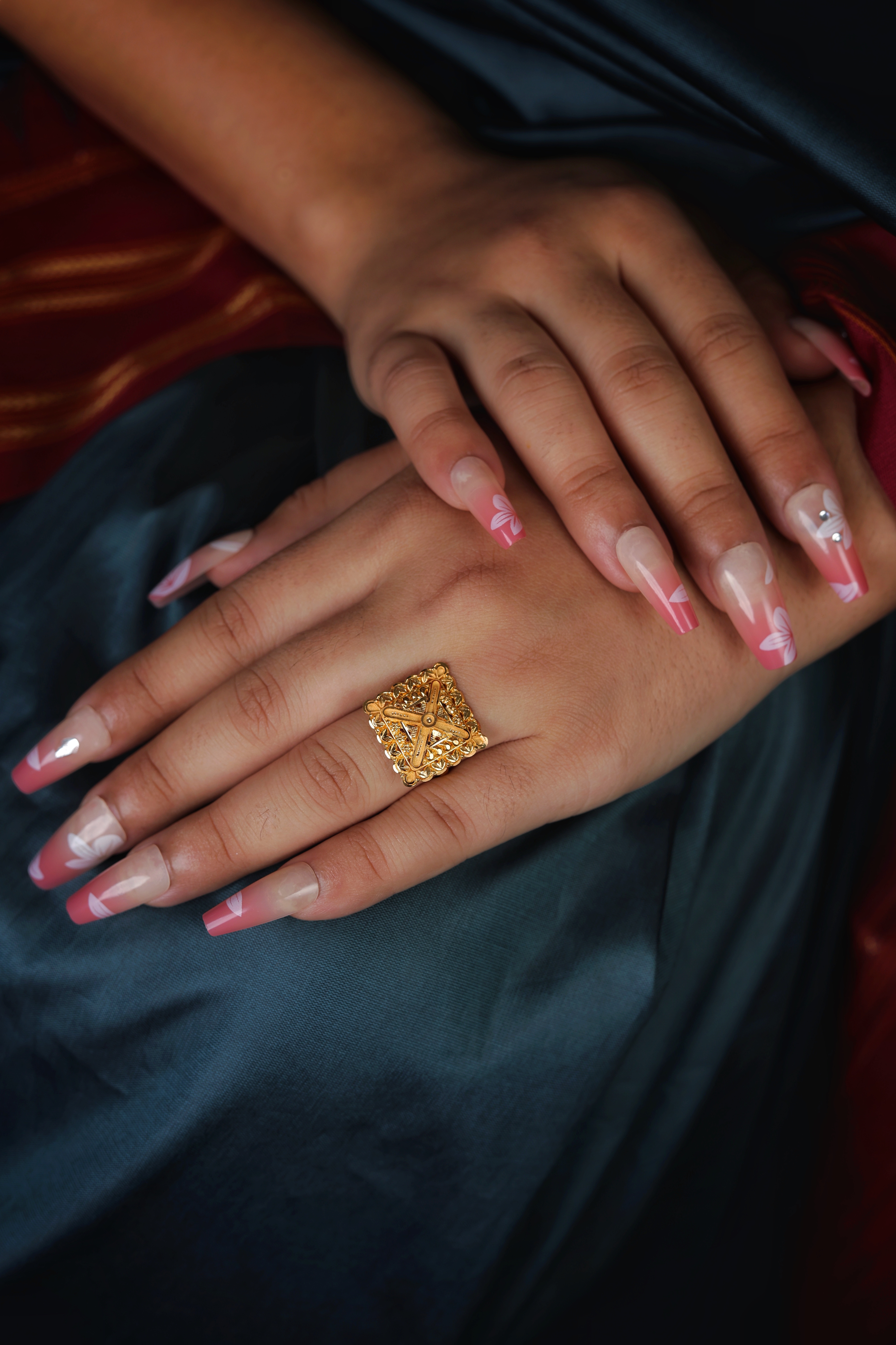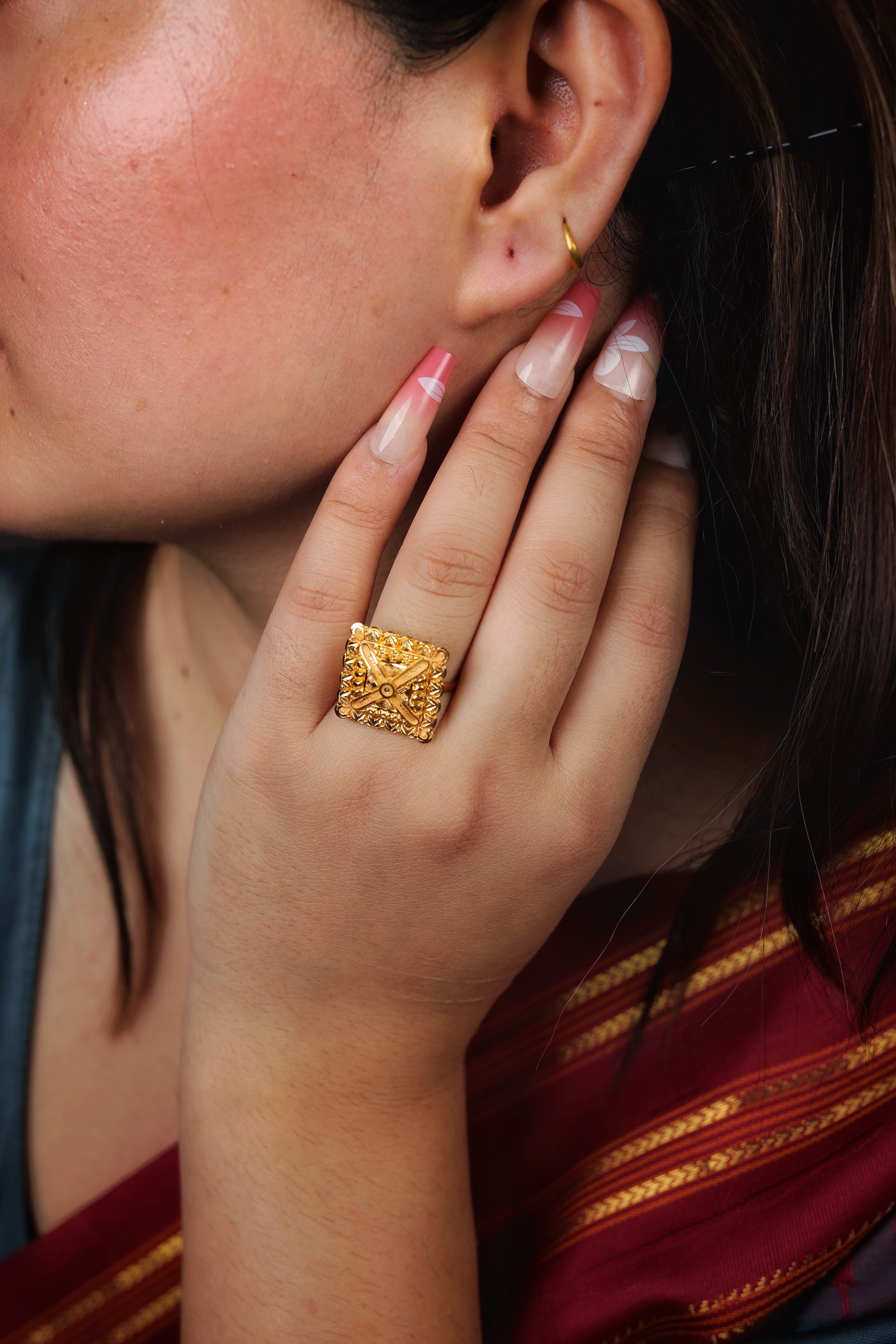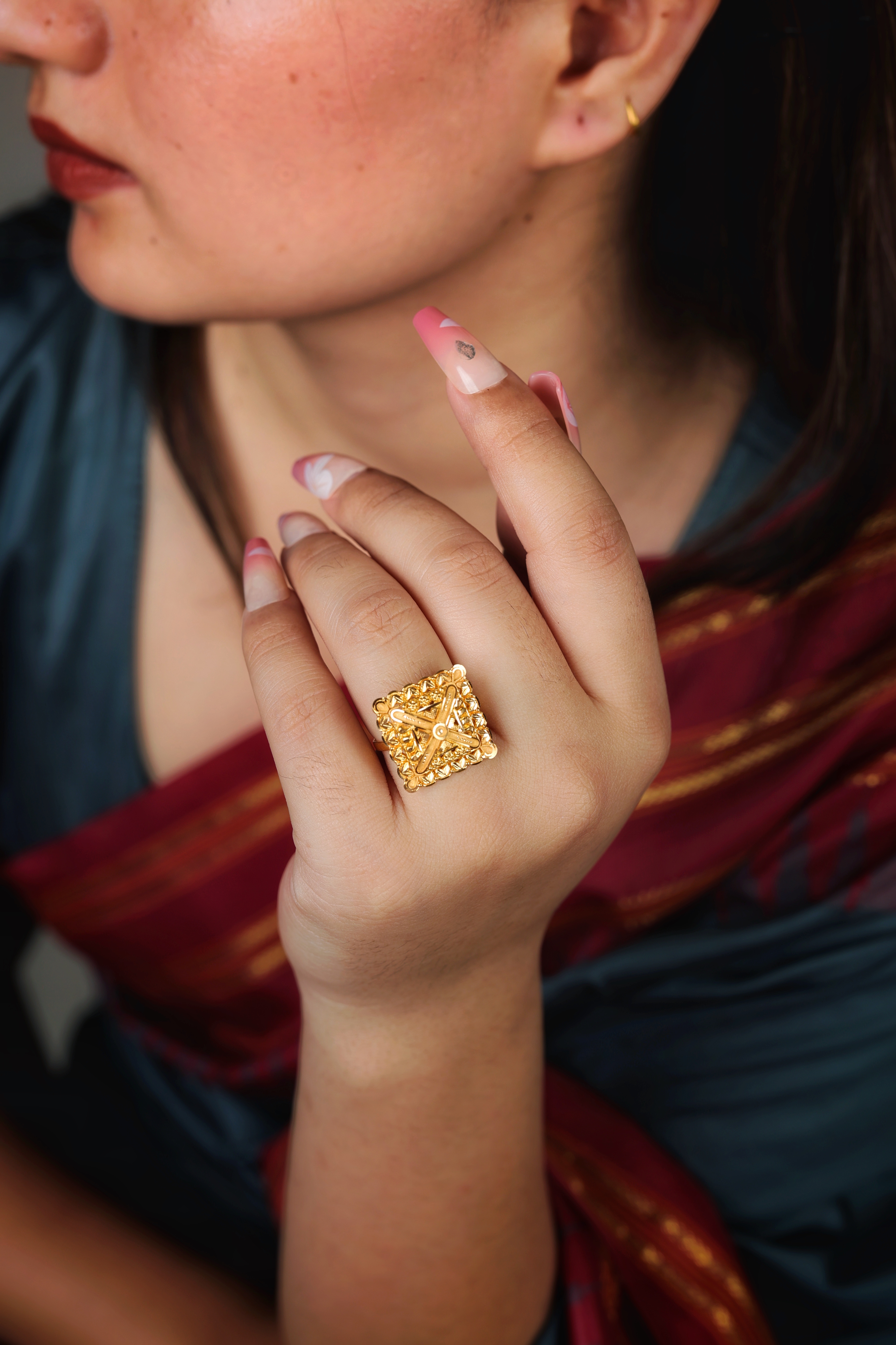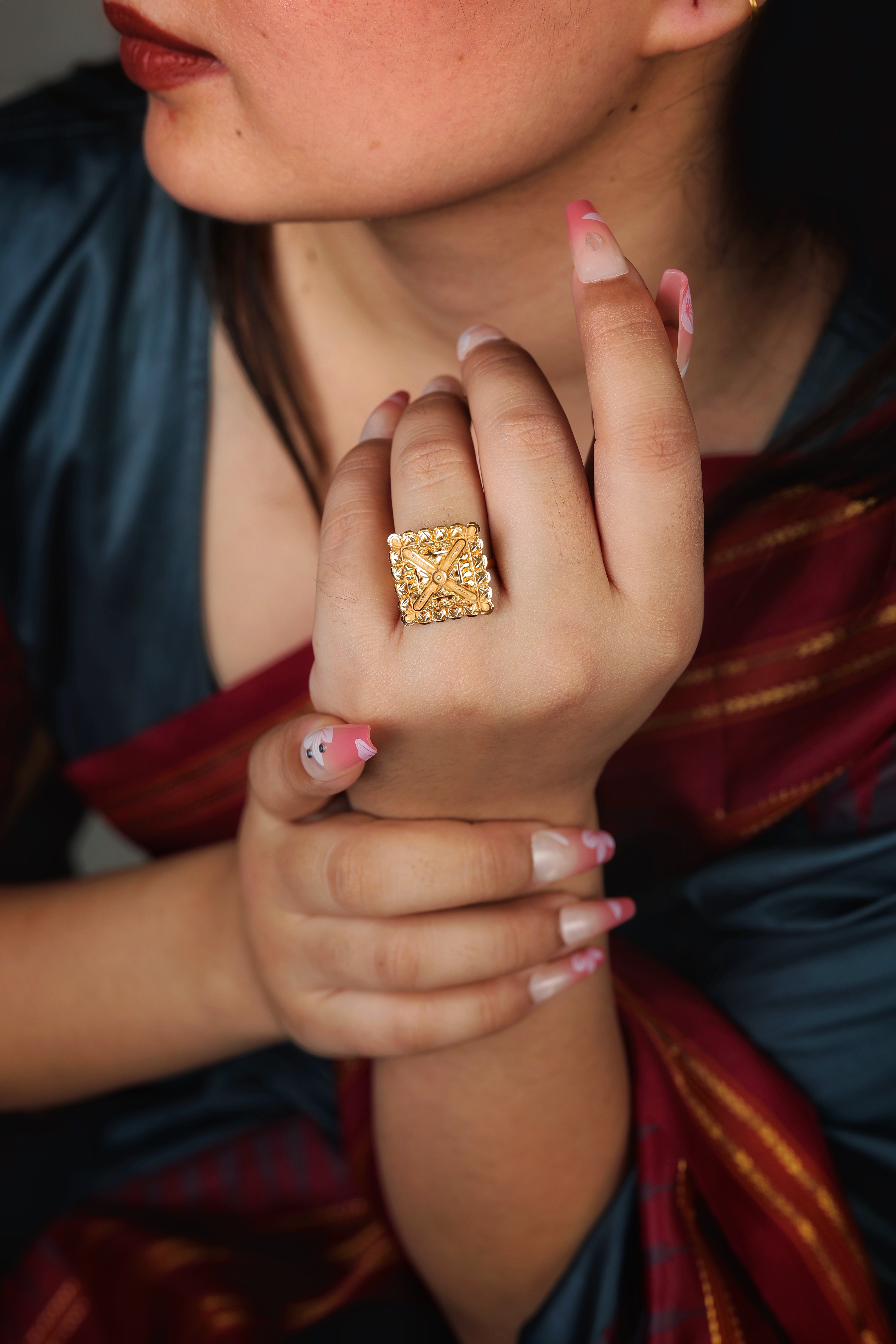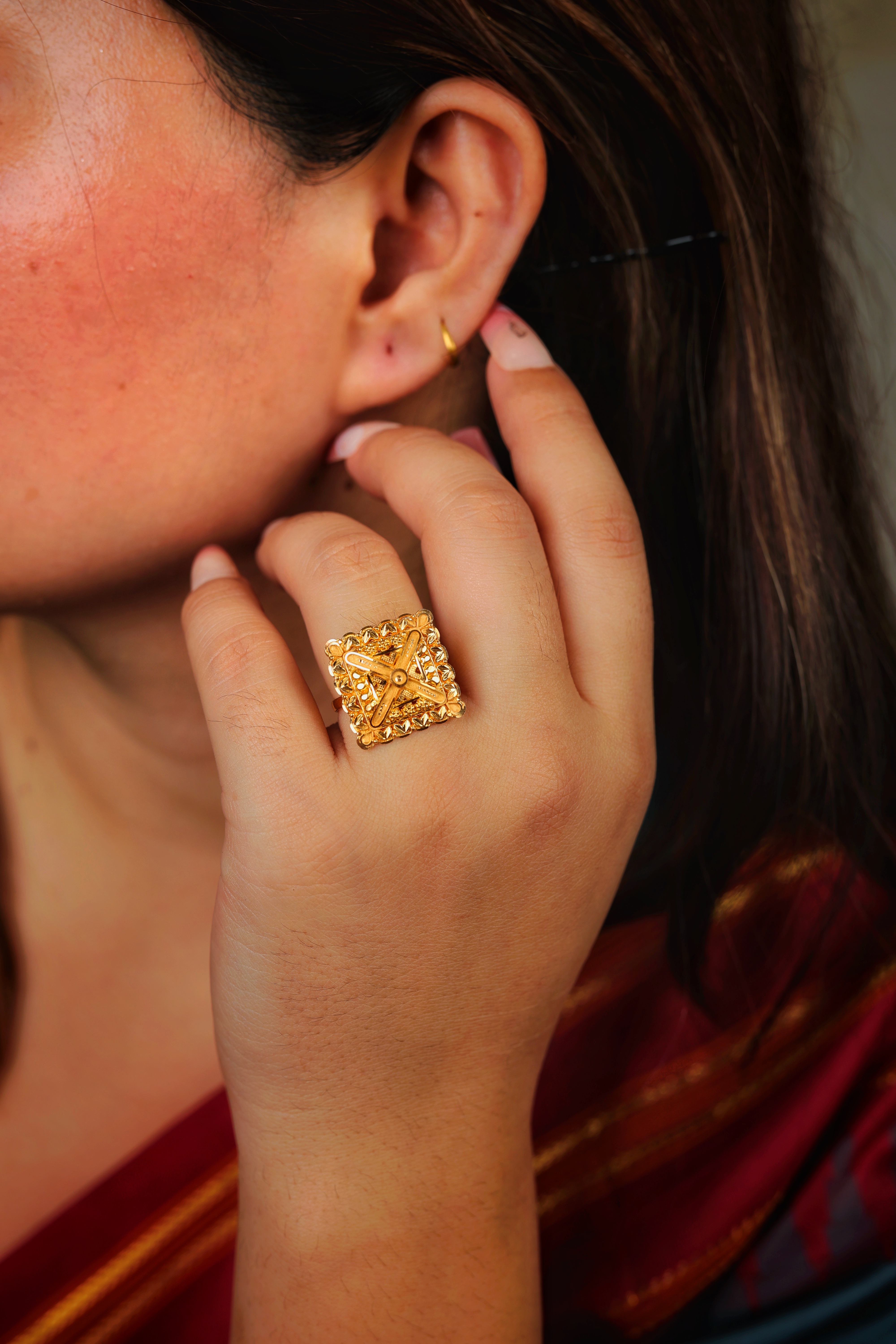 Key Features:Design: Extra-large, square dome cocktail ring with a geometric profile. Embellishments: Dense all-over textured goldwork, including granulation and patterned metal. Craftsmanship: Highly detailed traditional metalwork for a bold, three-dimensional look. Metal Purity: Assumed 22 Carat Yellow Gold (916 purity). Usage: Ideal for ceremonies, festivals, or as a signature traditional accessory.
