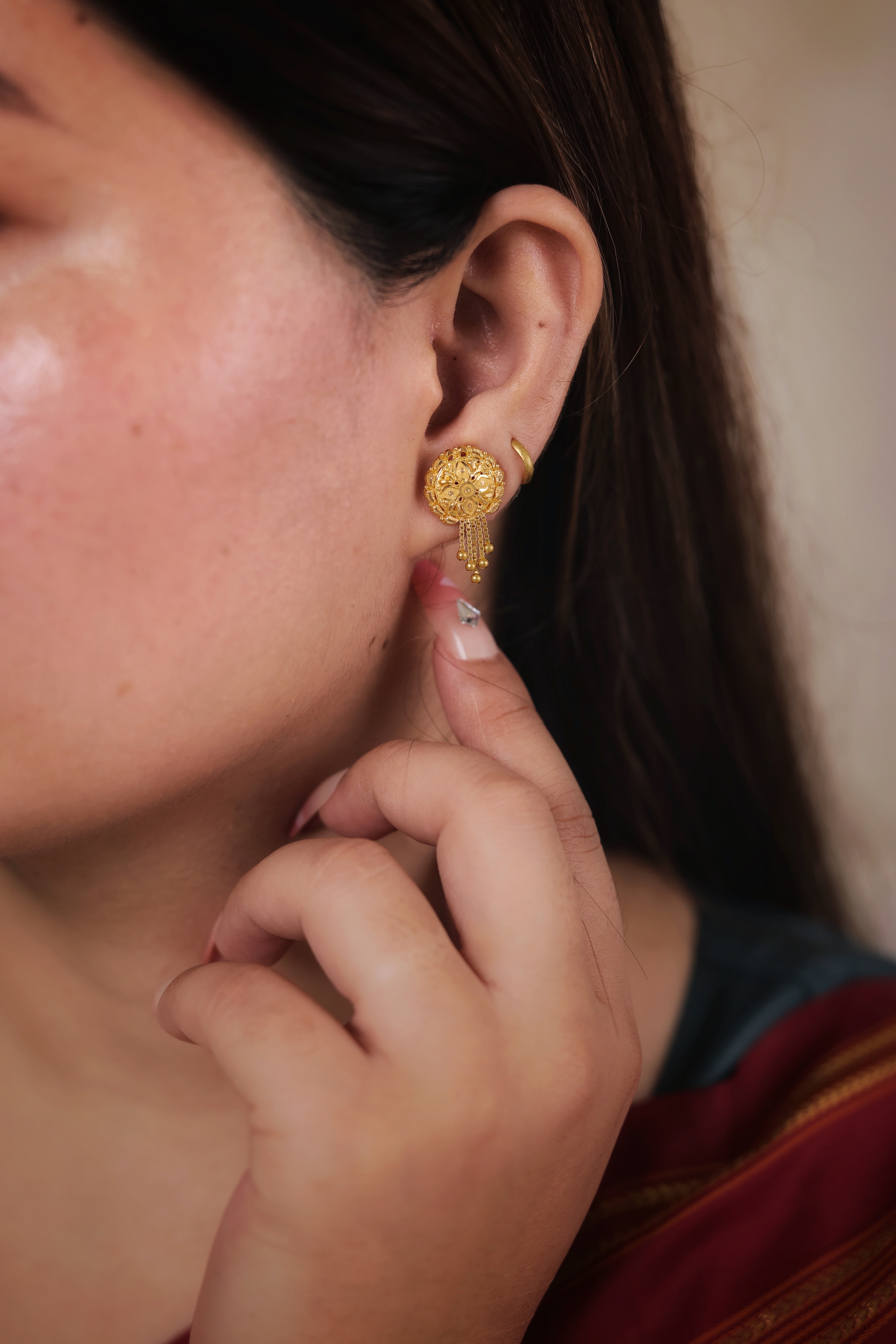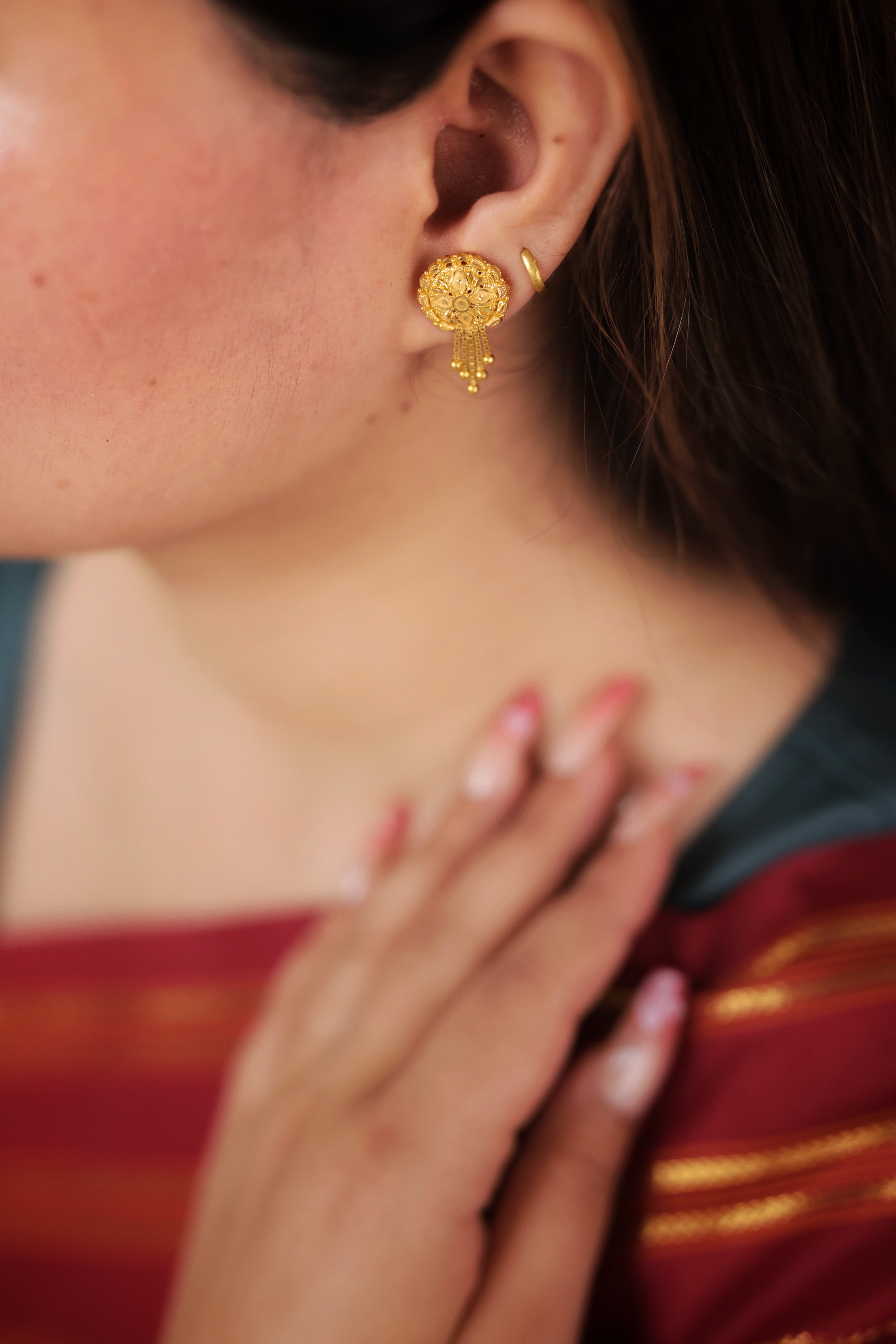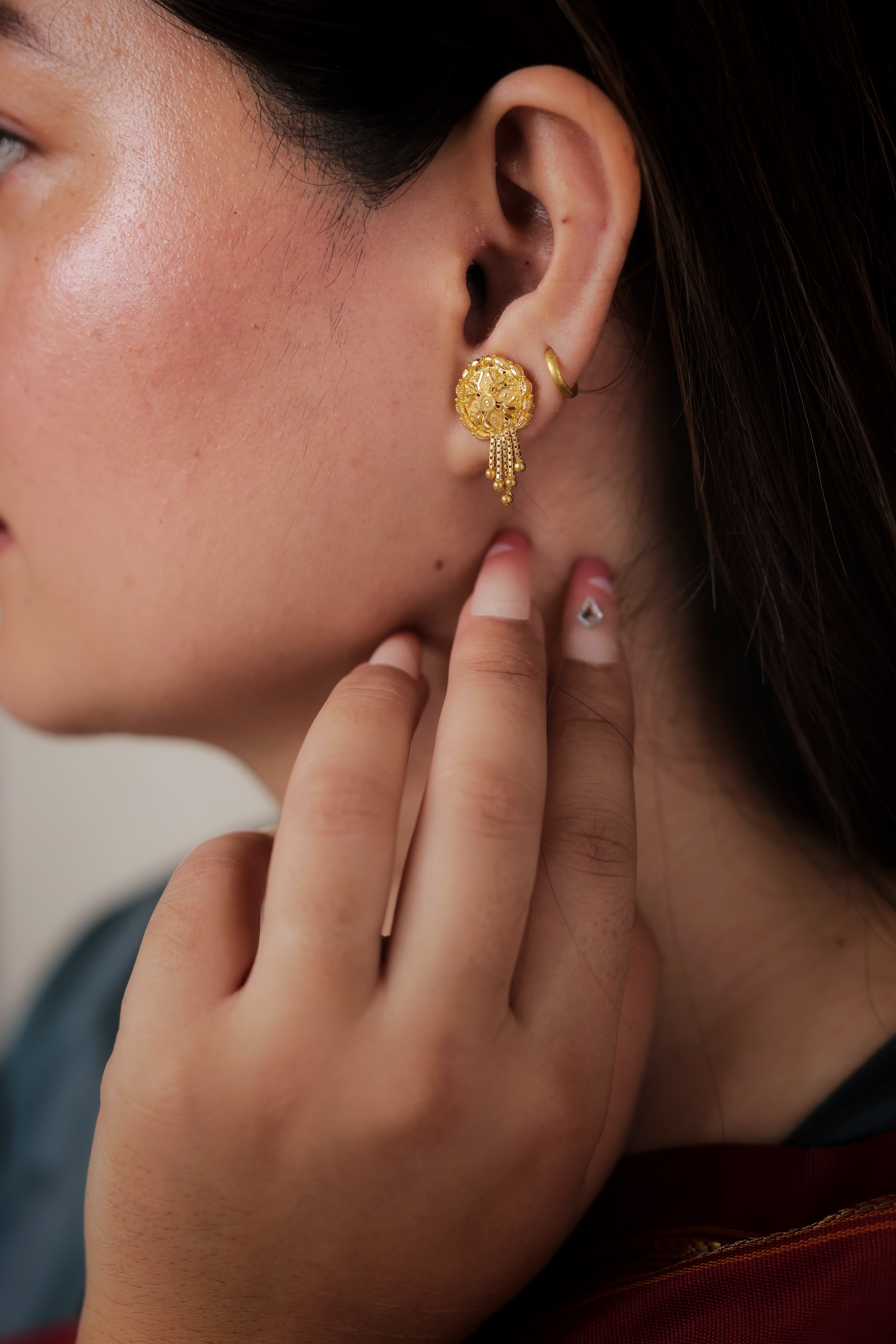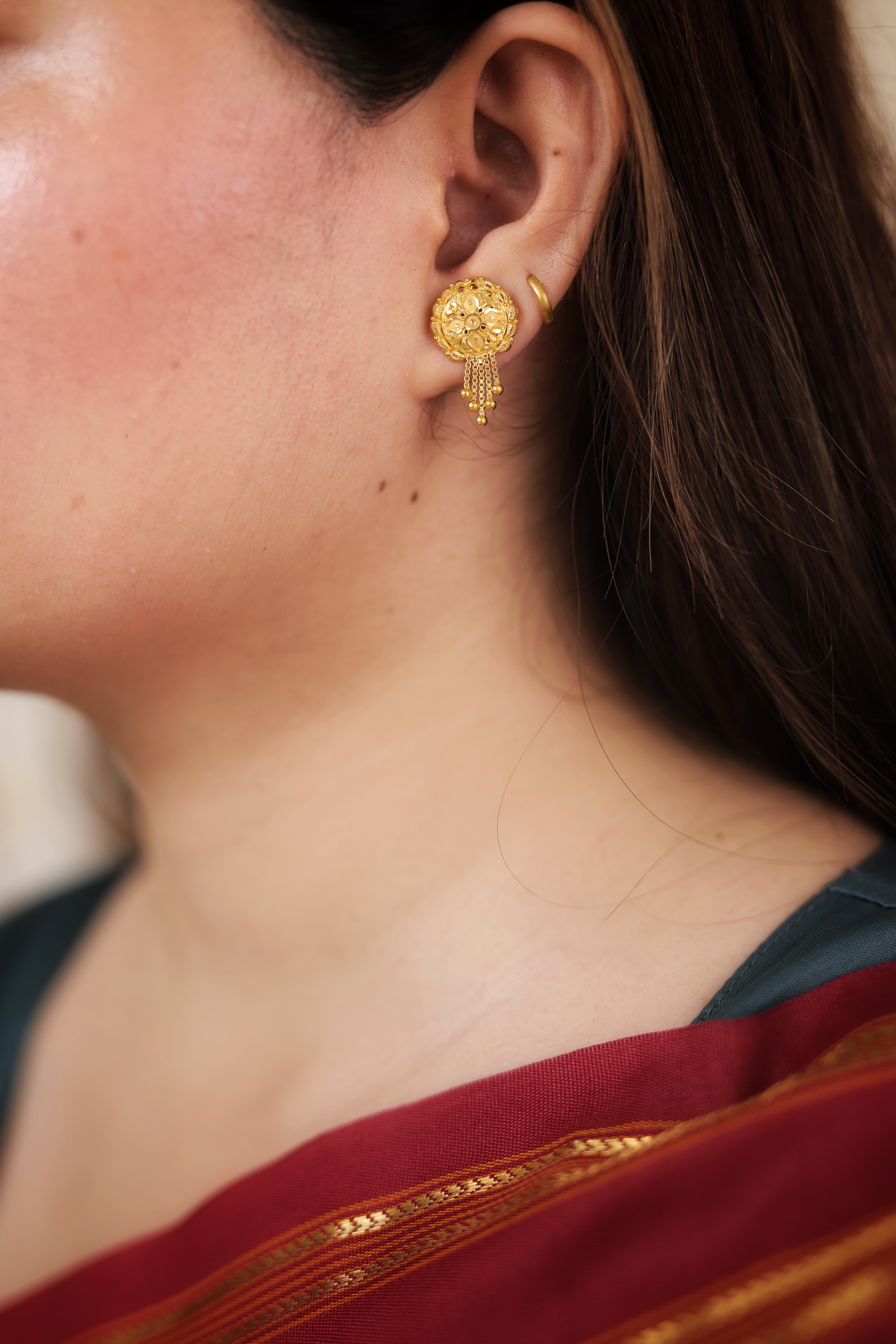 Key Features:Design: Circular dome stud with a highly textured face. Embellishments: Features delicate, dangling gold drops for movement. Craftsmanship: Detailed traditional gold granulation and metalwork. Metal Purity: Assumed 22 Carat Yellow Gold (916 purity). Usage: Ideal for daily wear, small ceremonies, or as a timeless gold accessory.