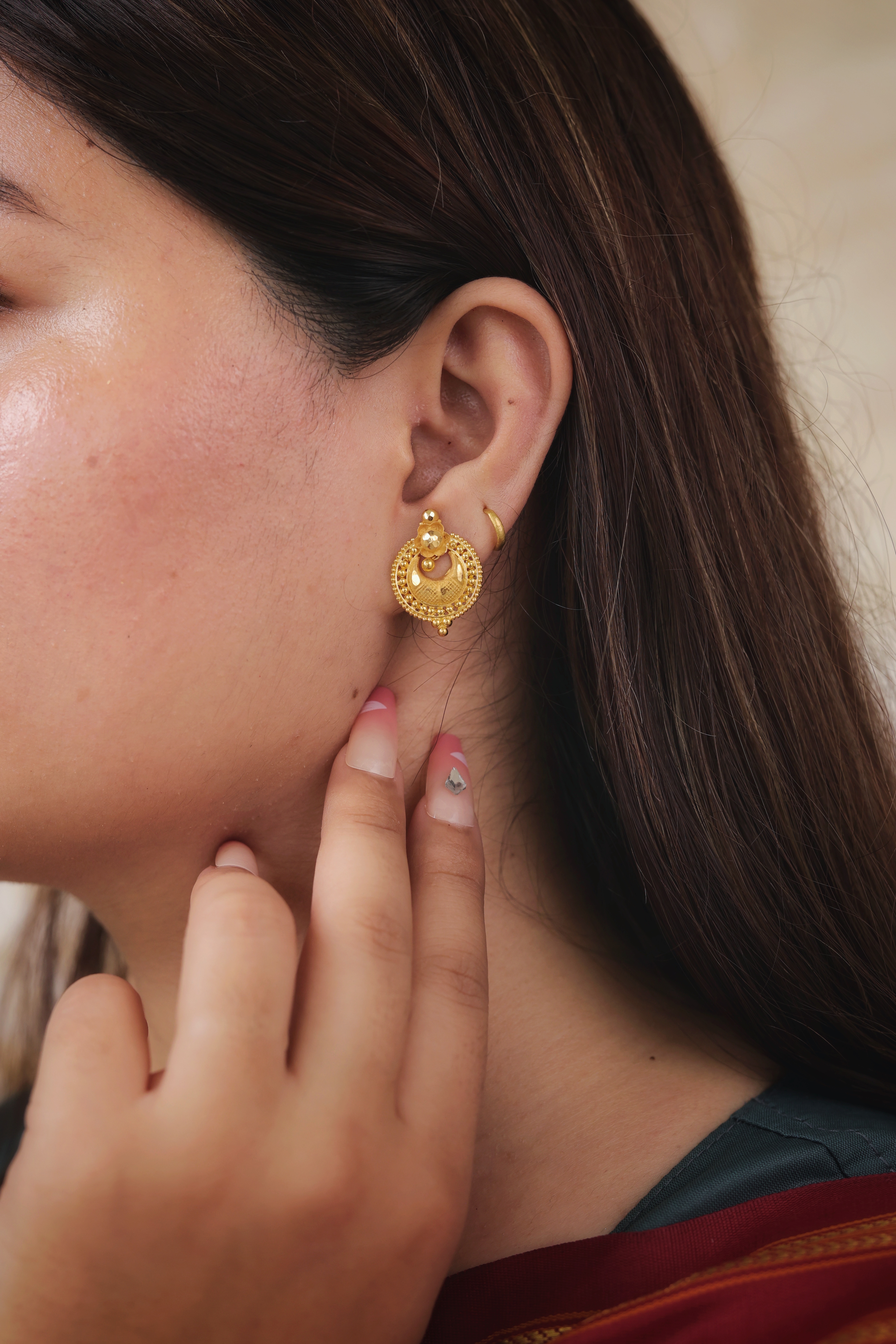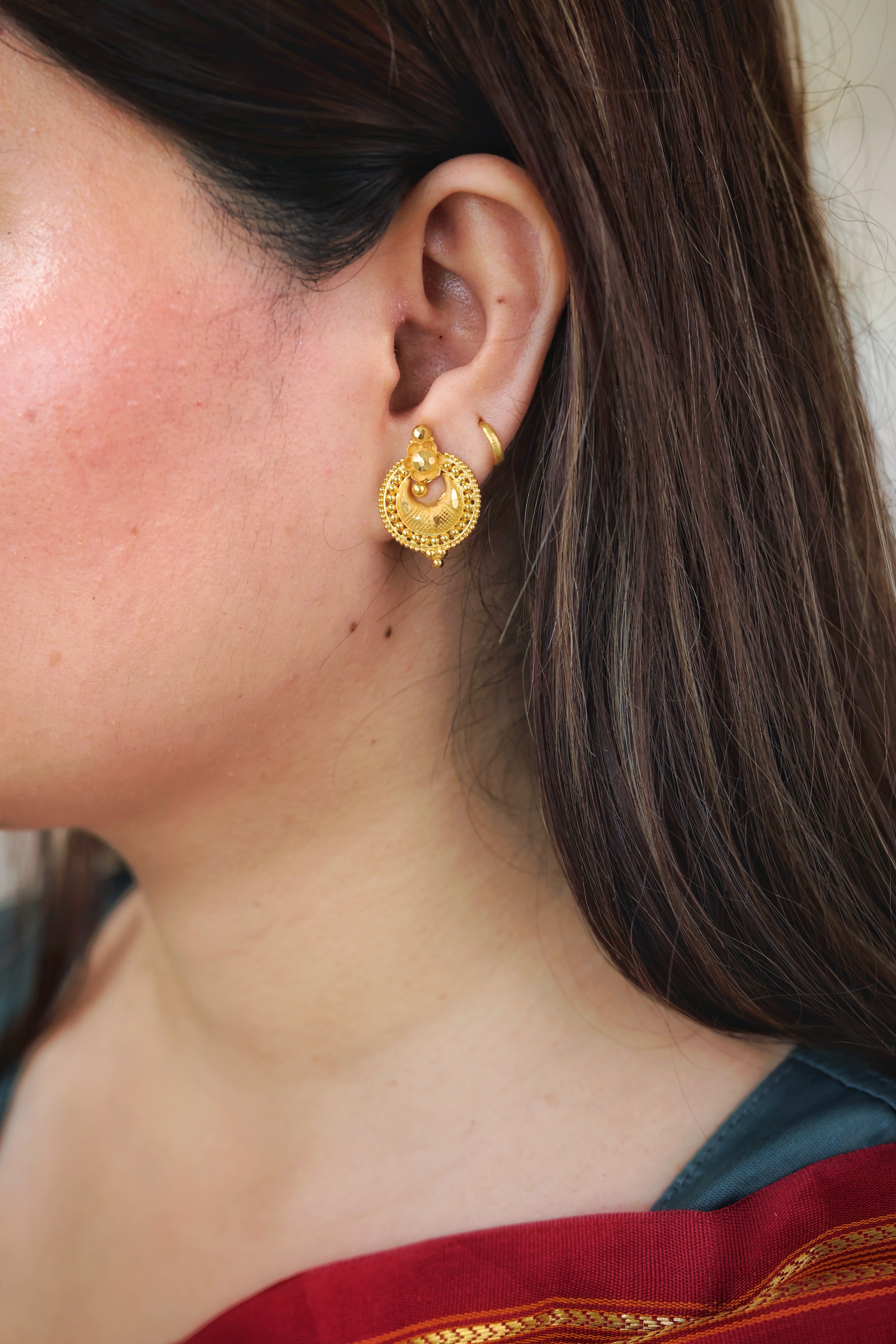 These classic gold ear tops are beautifully crafted in rich 22-carat yellow gold (assumed purity). The design features an unusual curved or semi-circular shape that is partially domed. The central element of the stud is a small, textured dome surrounded by fine granulation (beadwork) and stylized gold wirework, resembling a simplified traditional motif. The shape is unique for a stud, offering a flattering, slightly elongating look without the weight of a full dangle.