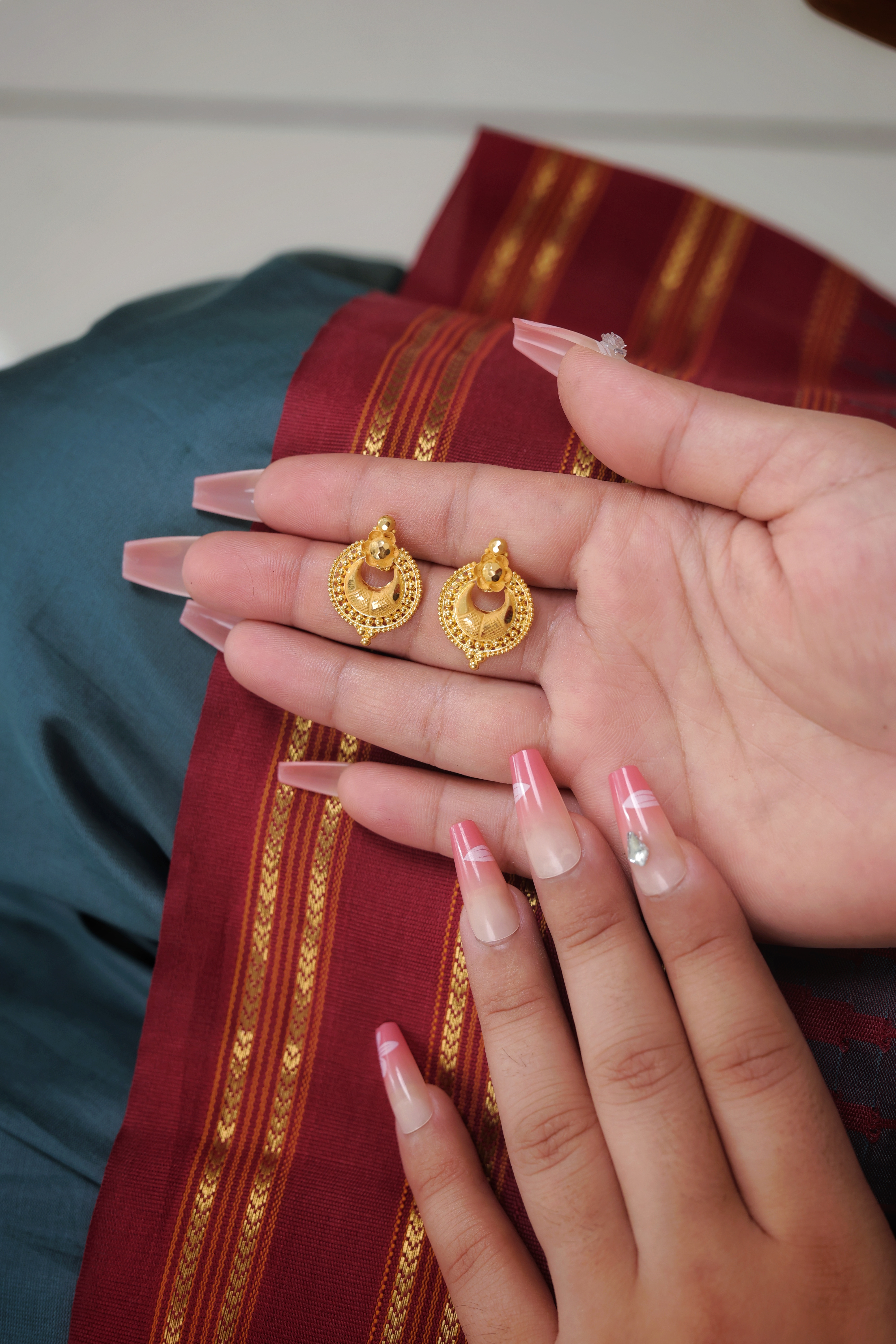 Key Features:Design: Stylized curved or semi-circular shaped stud. Embellishments: Features a central dome and detailed gold granulation. Craftsmanship: Detailed traditional gold metalwork. Metal Purity: Assumed 22 Carat Yellow Gold (916 purity). Usage: Ideal for daily wear, small ceremonies, or as a distinct gold accessory.