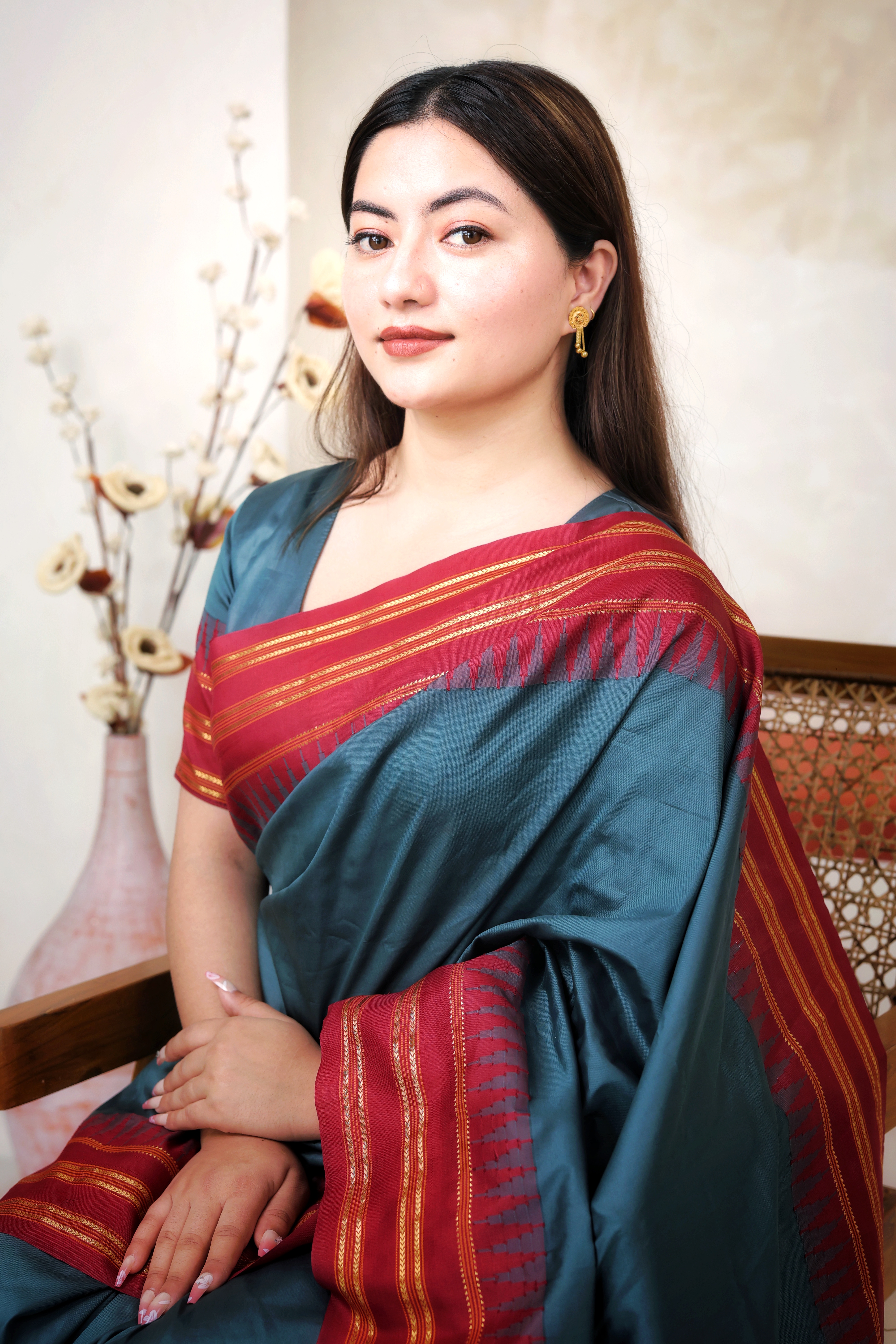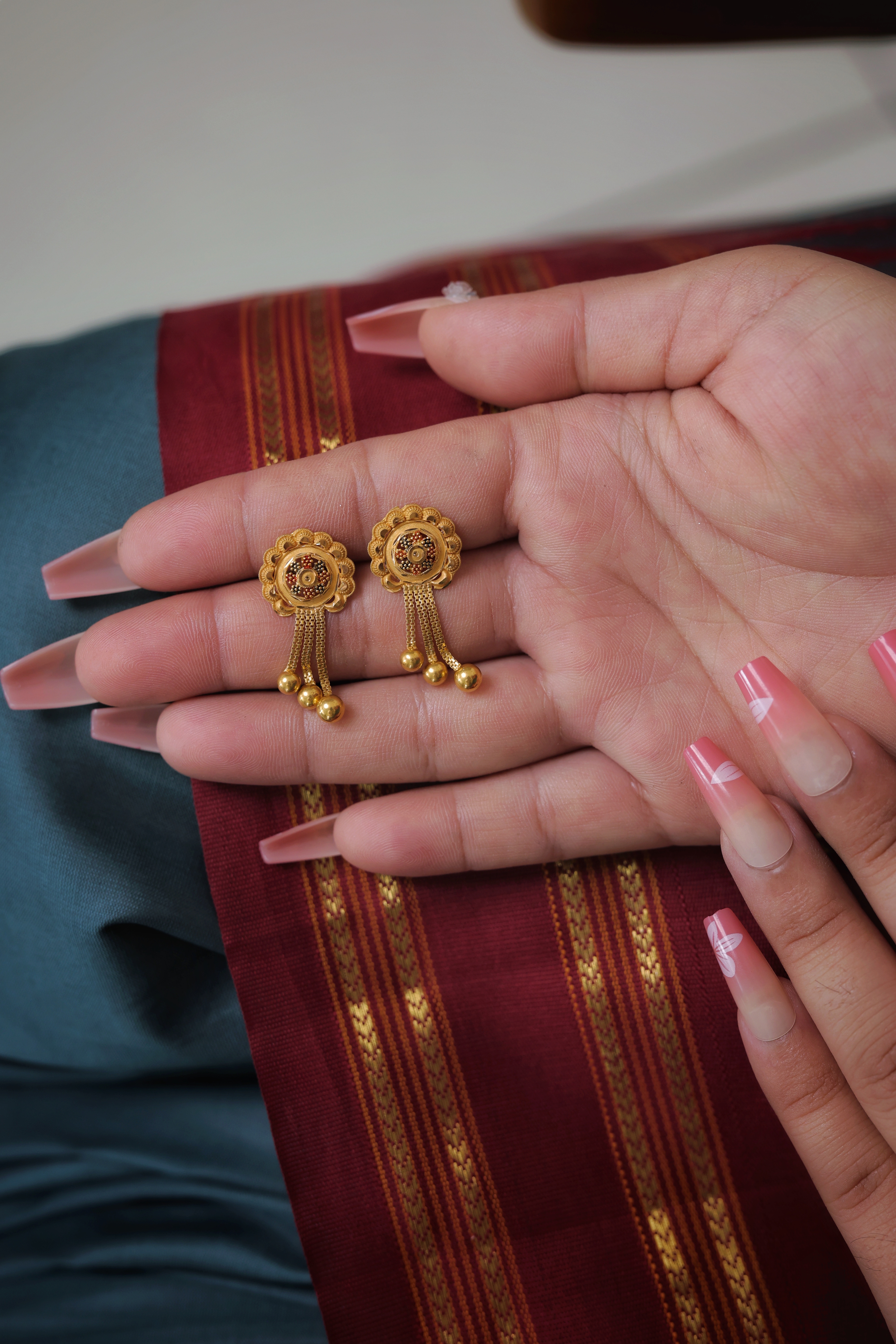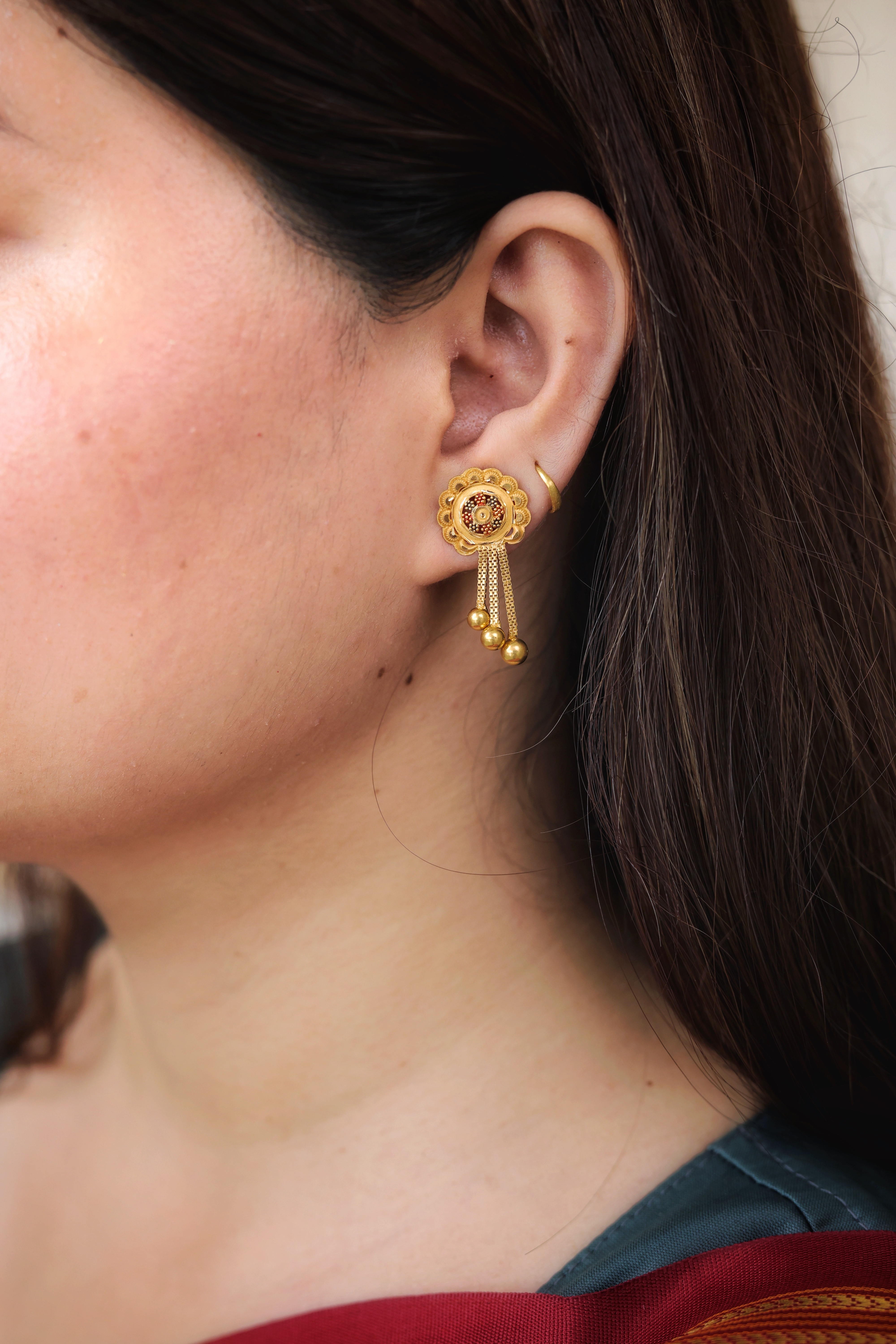Key Features:Design: Circular floral stud with a prominent hanging element. Embellishments: Features red accents and dangling gold balls attached by short chains. Craftsmanship: Detailed traditional gold filigree and granulation. Metal Purity: Assumed 22 Carat Yellow Gold (916 purity). Usage: Ideal for daily wear, small ceremonies, or as a distinct gold accessory.