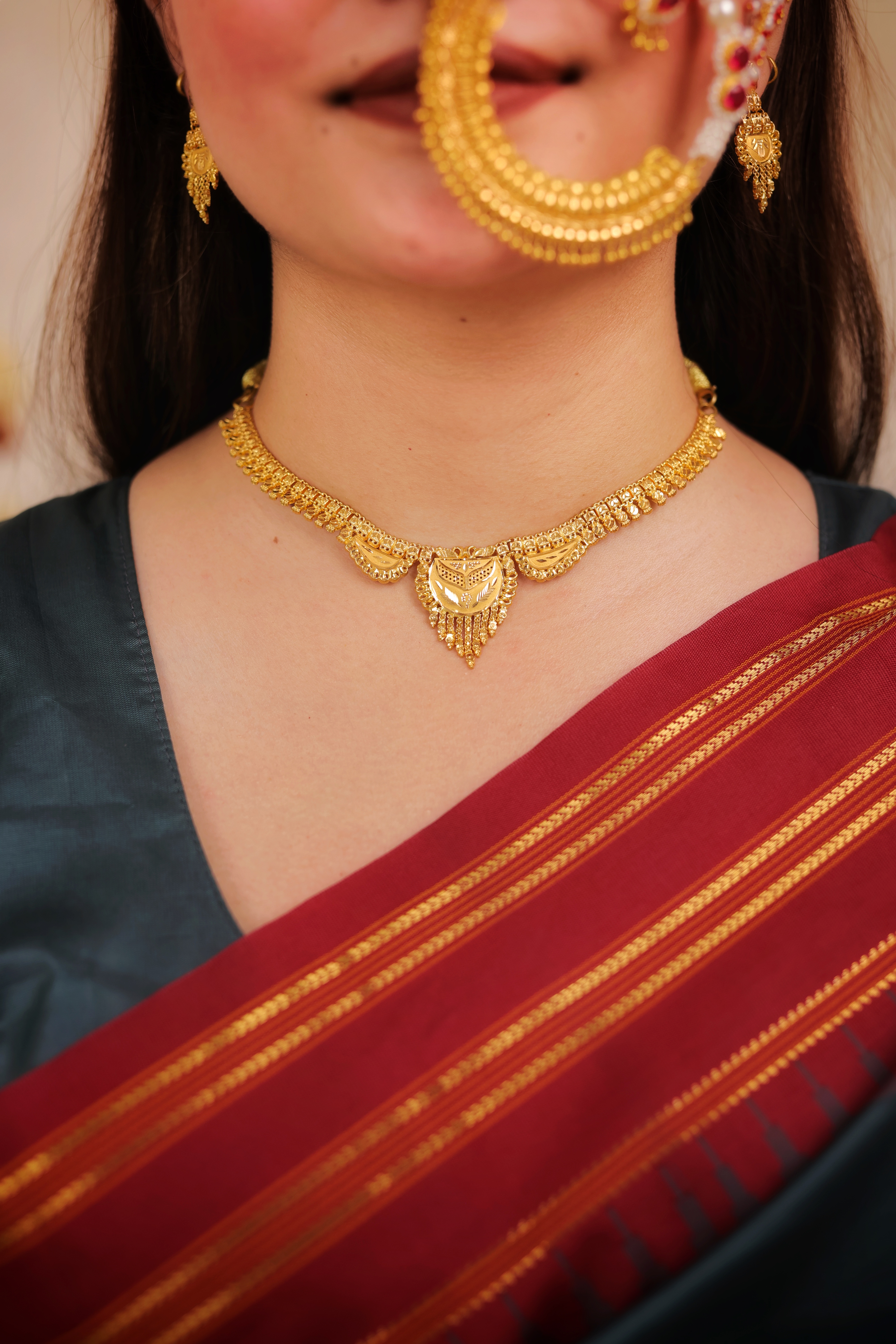 Key Features:Design: Matching set including a collar necklace and substantial drop earrings. Embellishments: Features stylized heart/paisley pendants and a dense fringe of gold drops. Craftsmanship: Highly detailed traditional metalwork emphasizing texture and volume. Metal Purity: 22 Carat Yellow Gold (916 purity). Usage: Ideal for ceremonies, festivals, or traditional styling.