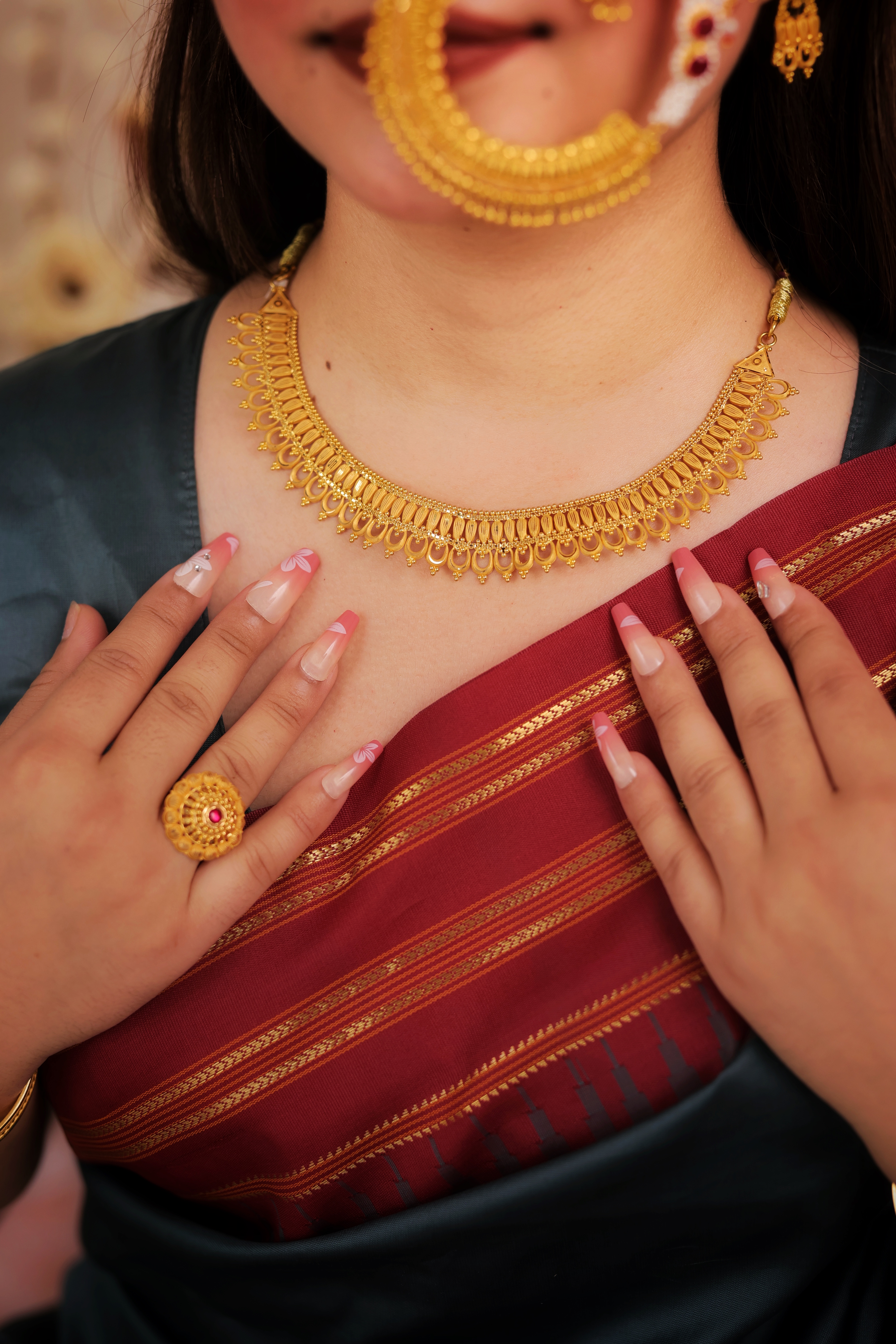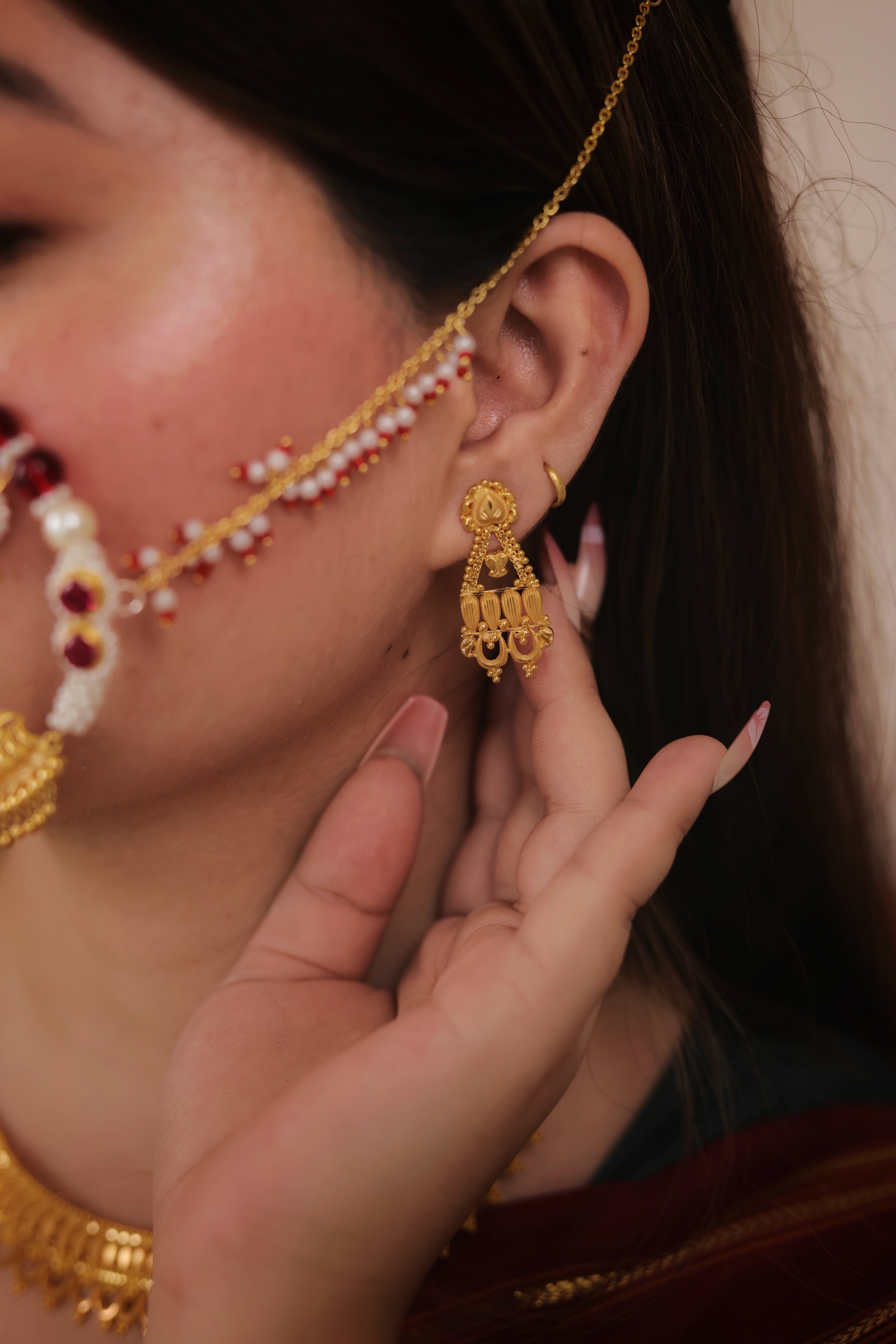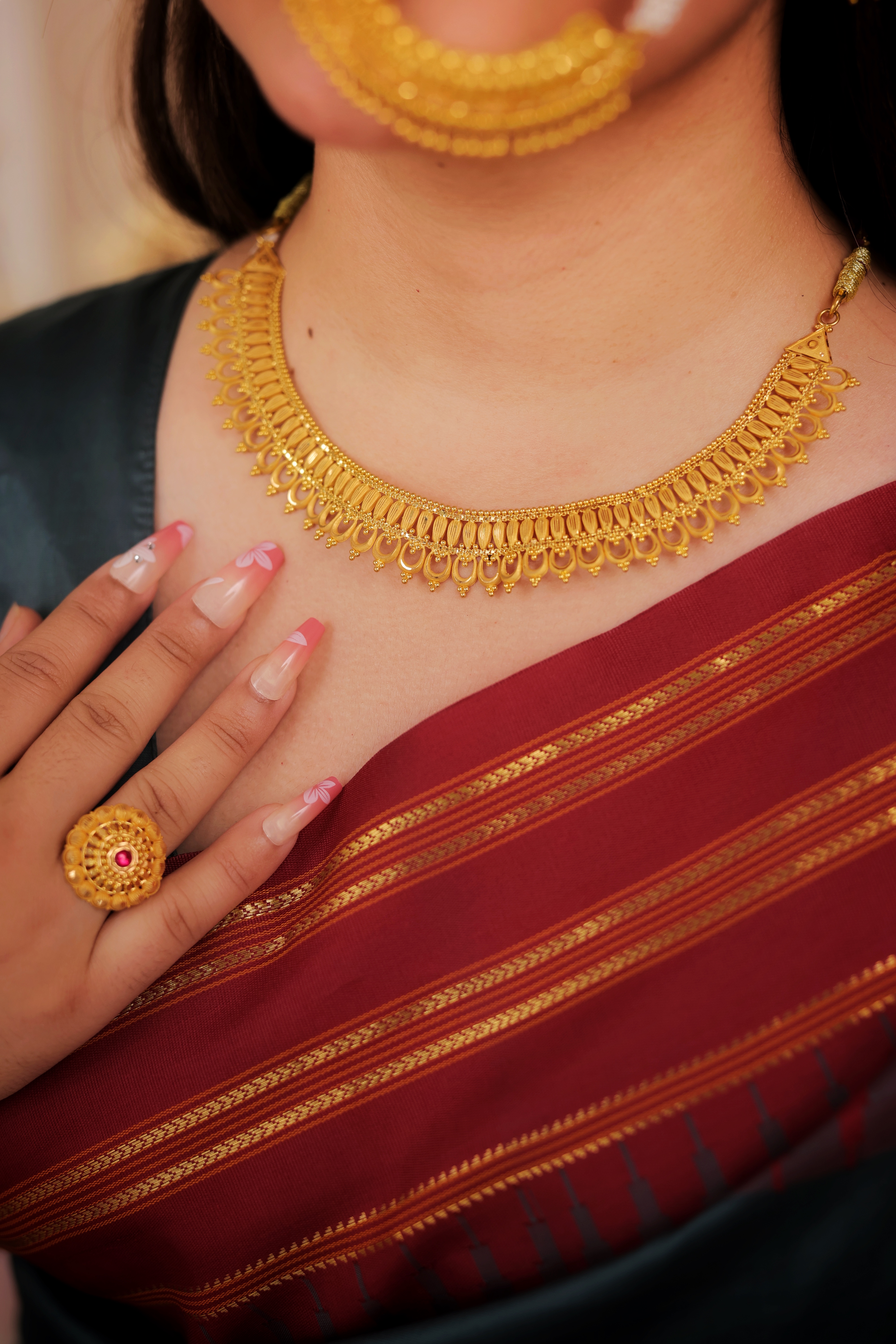 This is an elegant traditional jewelry set, suitable for semi-formal to ceremonial wear, crafted in rich 22-carat yellow gold (916 purity).