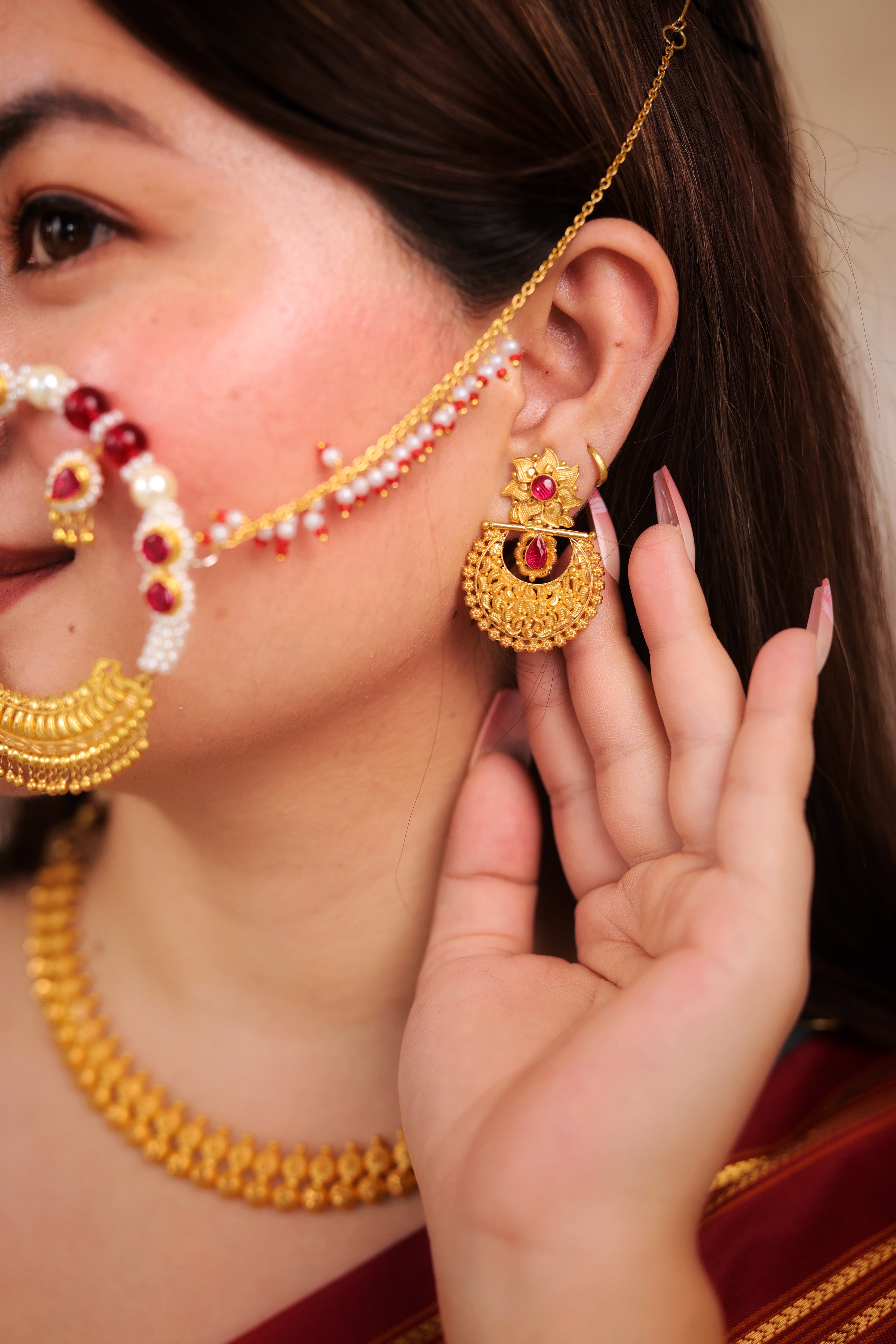 The set includes eye-catching matching earrings. The top stud features a red stone accent (likely ruby or colored CZ) surrounded by goldwork. The main body of the earring is a large, ornate, half-moon or jhumka-style drop with intricate filigree and granulation, finished with a small dangling gold bead. The contrast of the red stone against the gold adds vibrant traditional color.