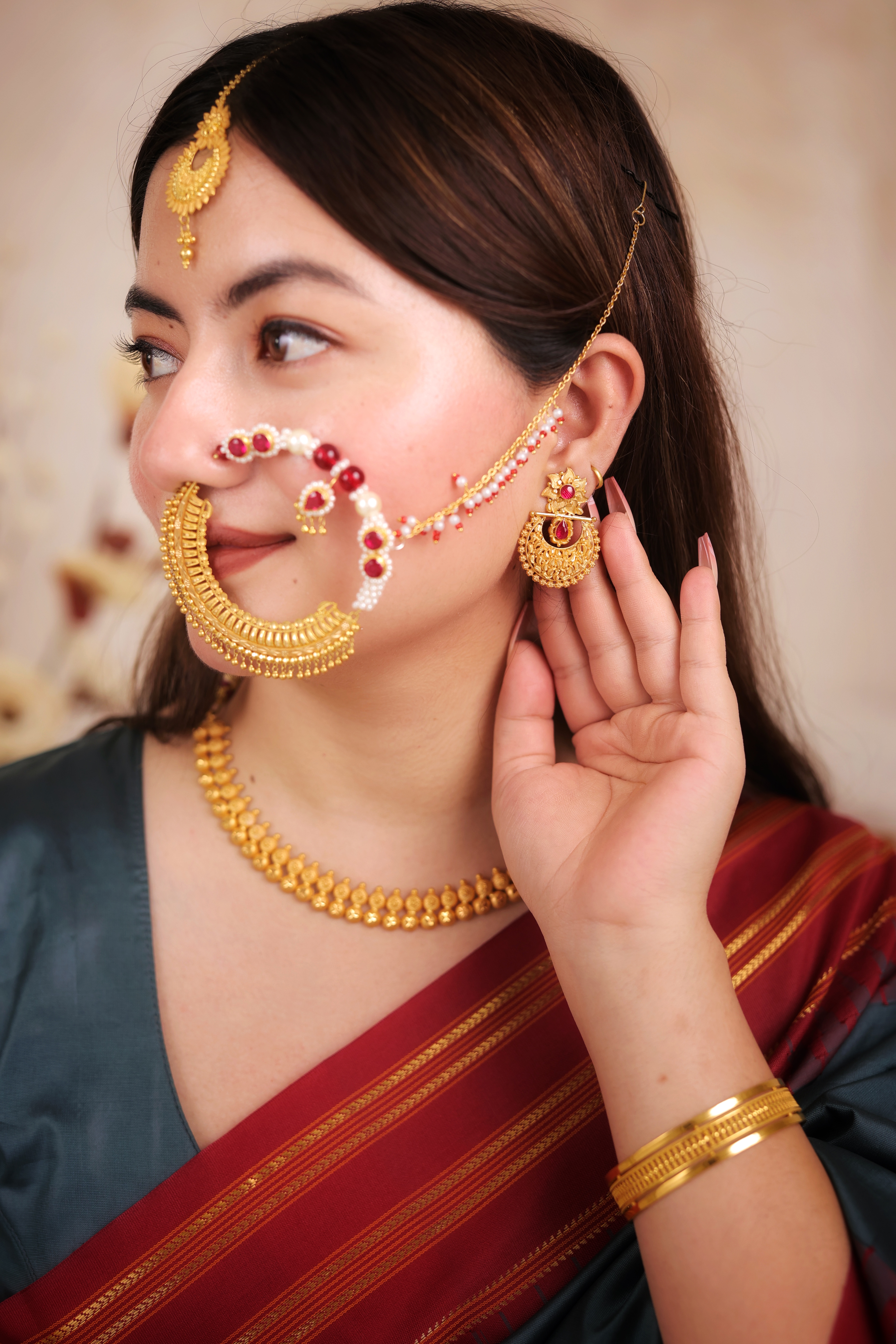 Traditional Textured Bead Necklace Set with Red Stone Jhumka Earrings