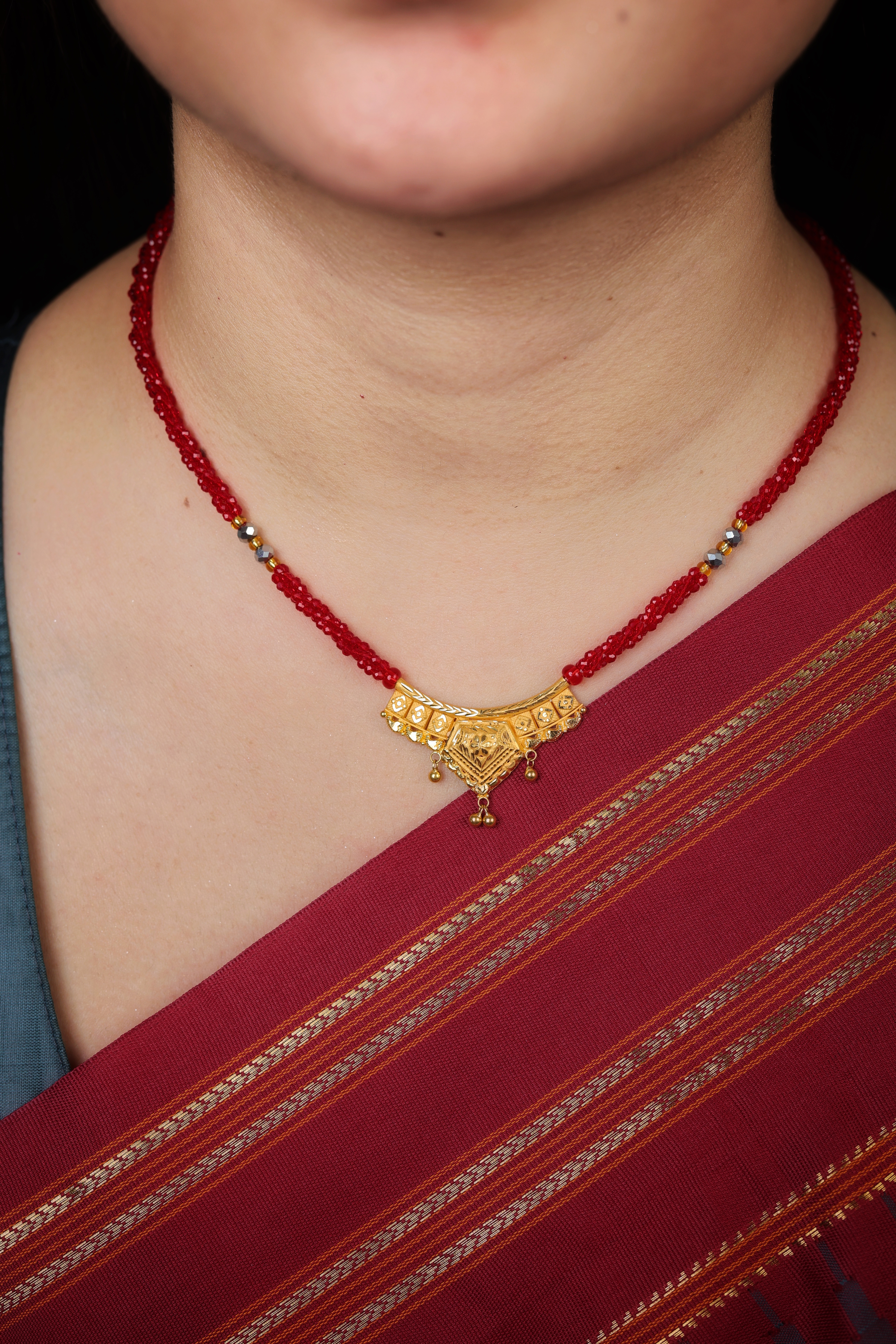 Traditional Curved Gold Pendant Mangal Sutra with Red Beaded Chain