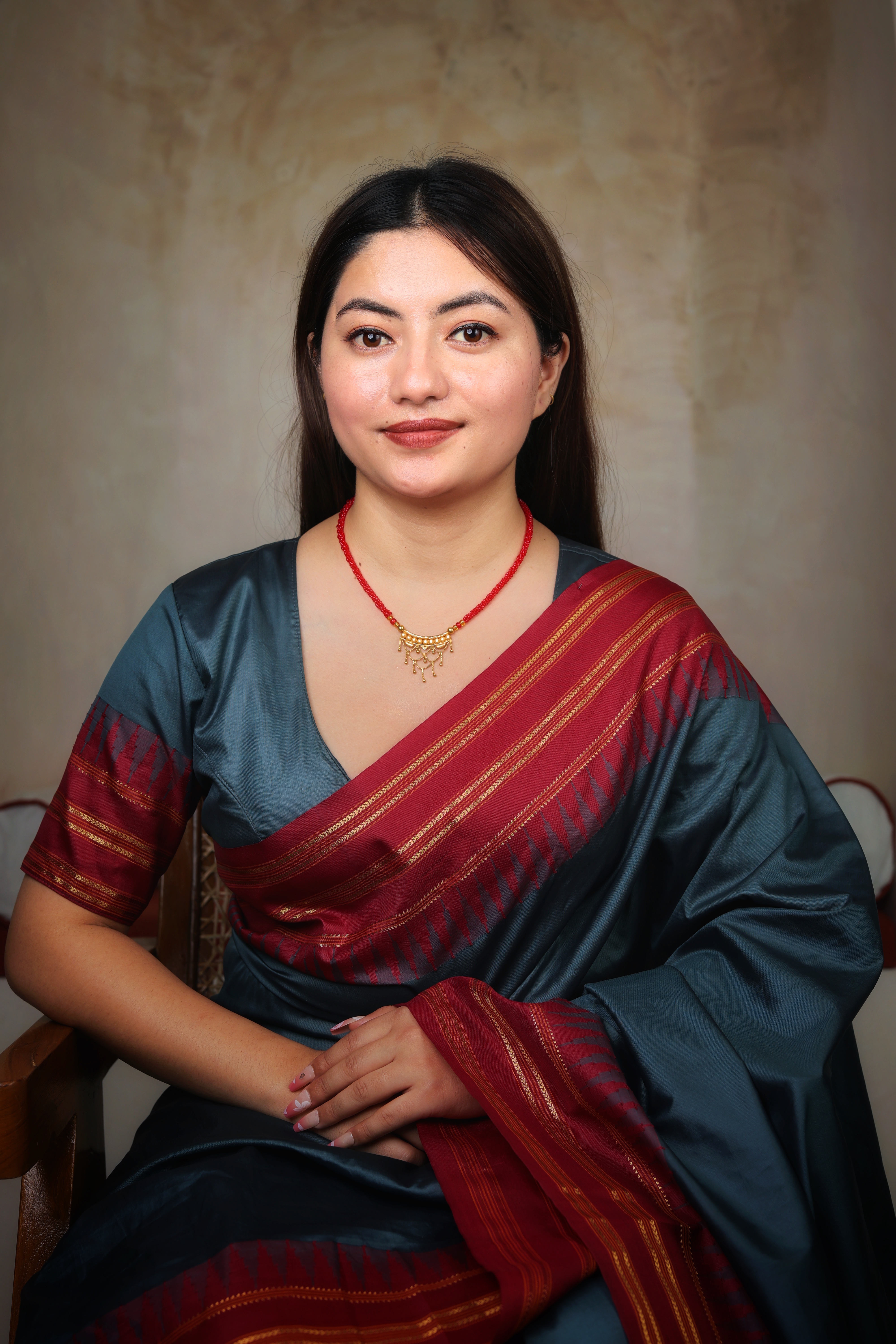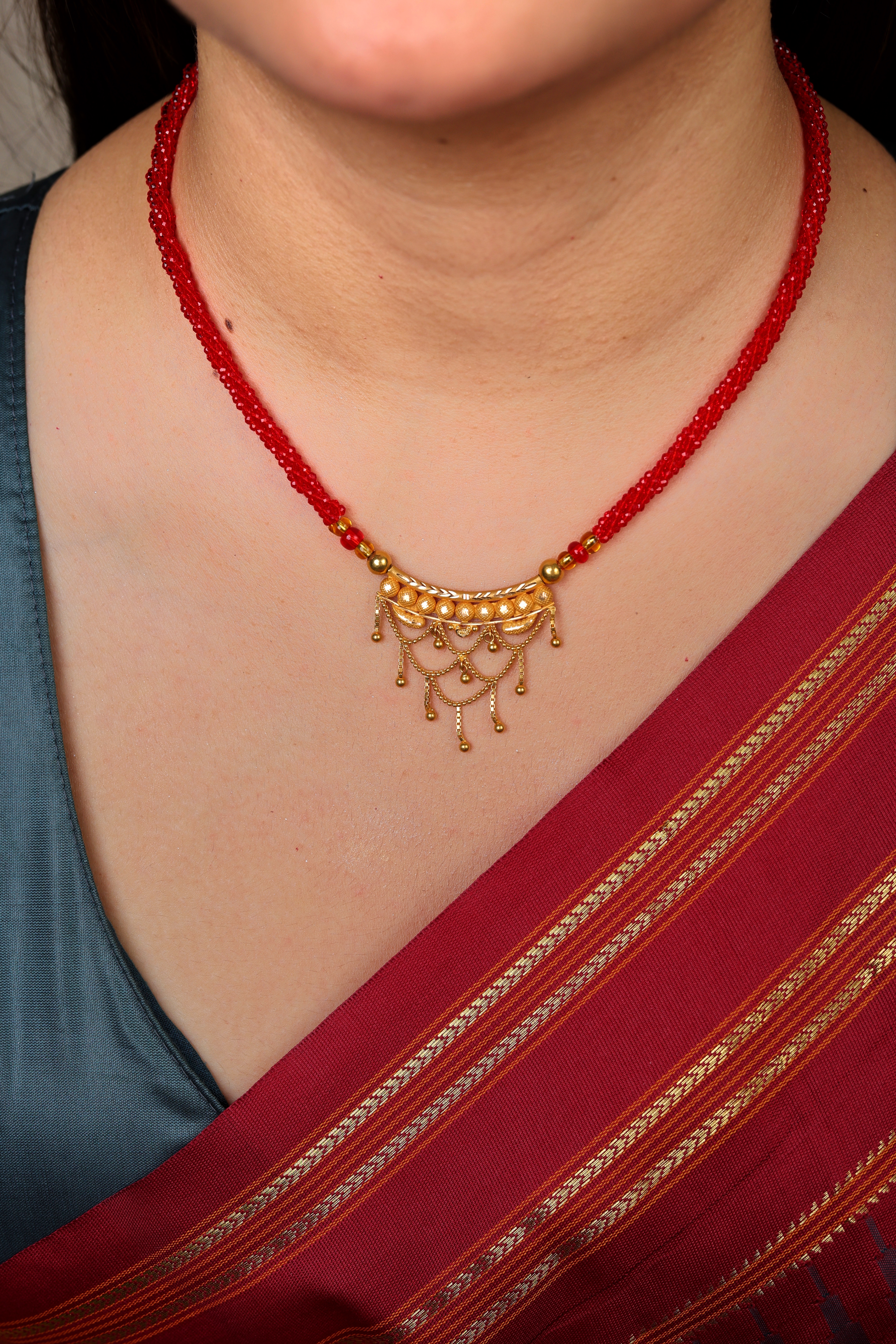 Delicate Tassel Arch Gold Pendant Mangal Sutra with Red Beaded Chain