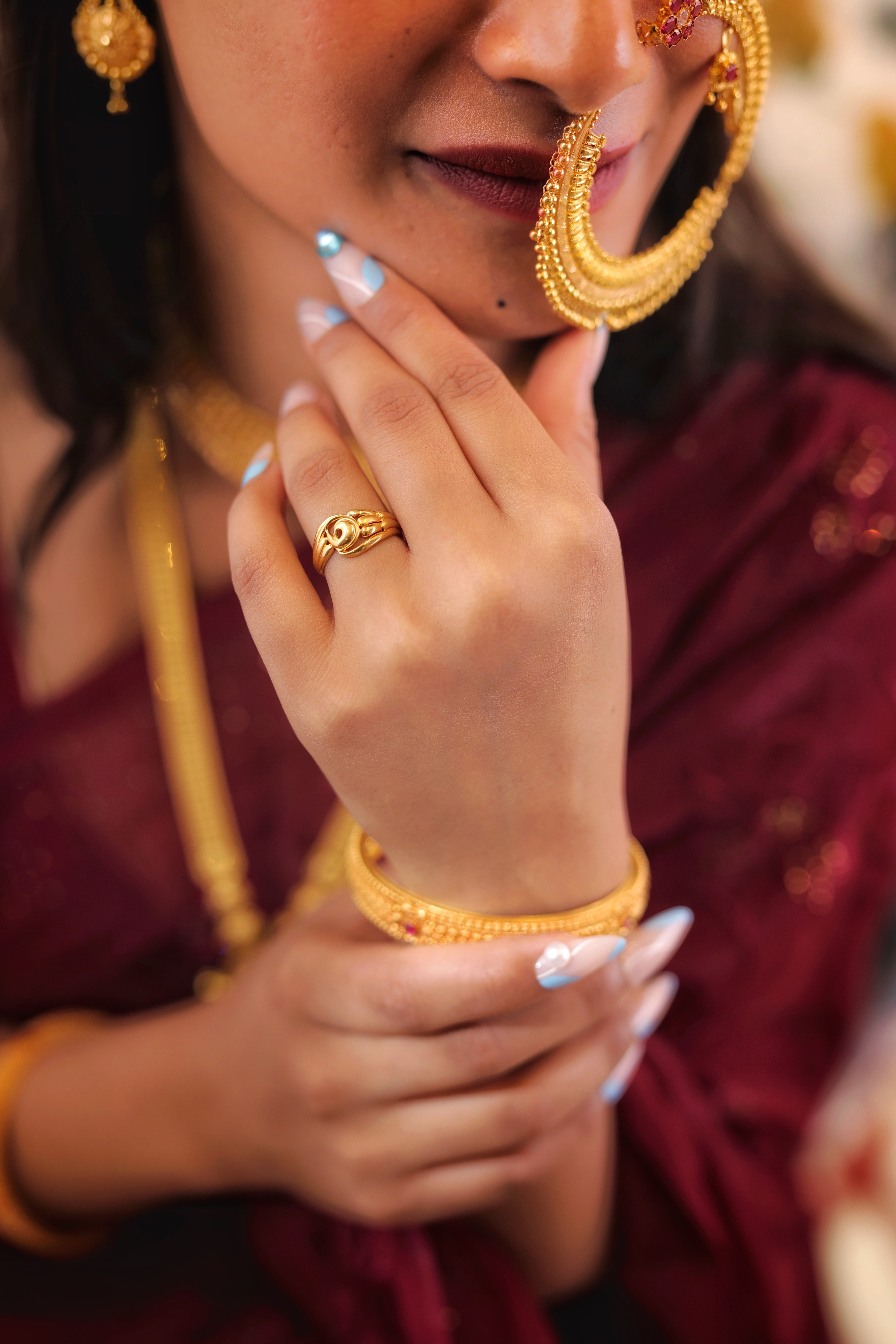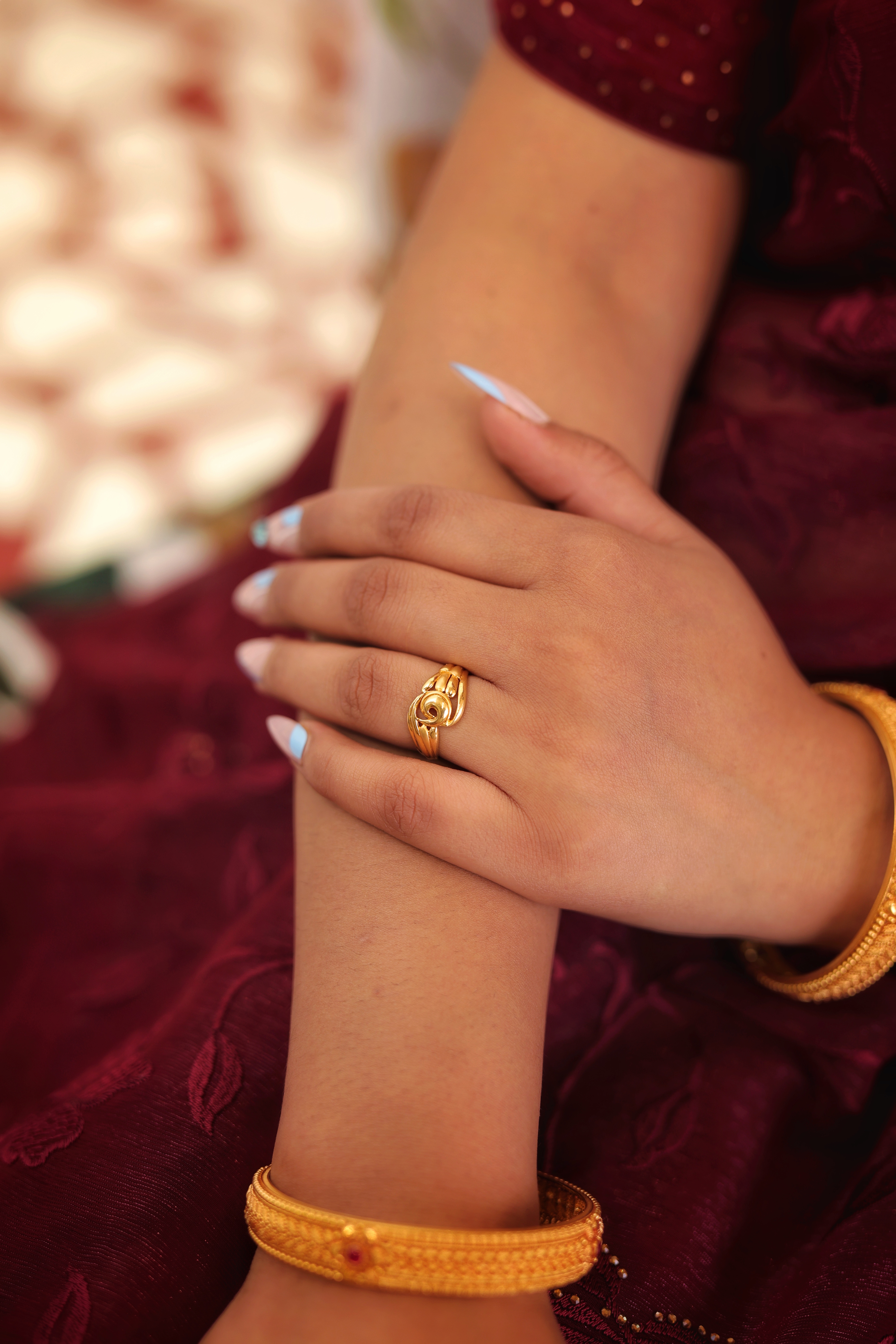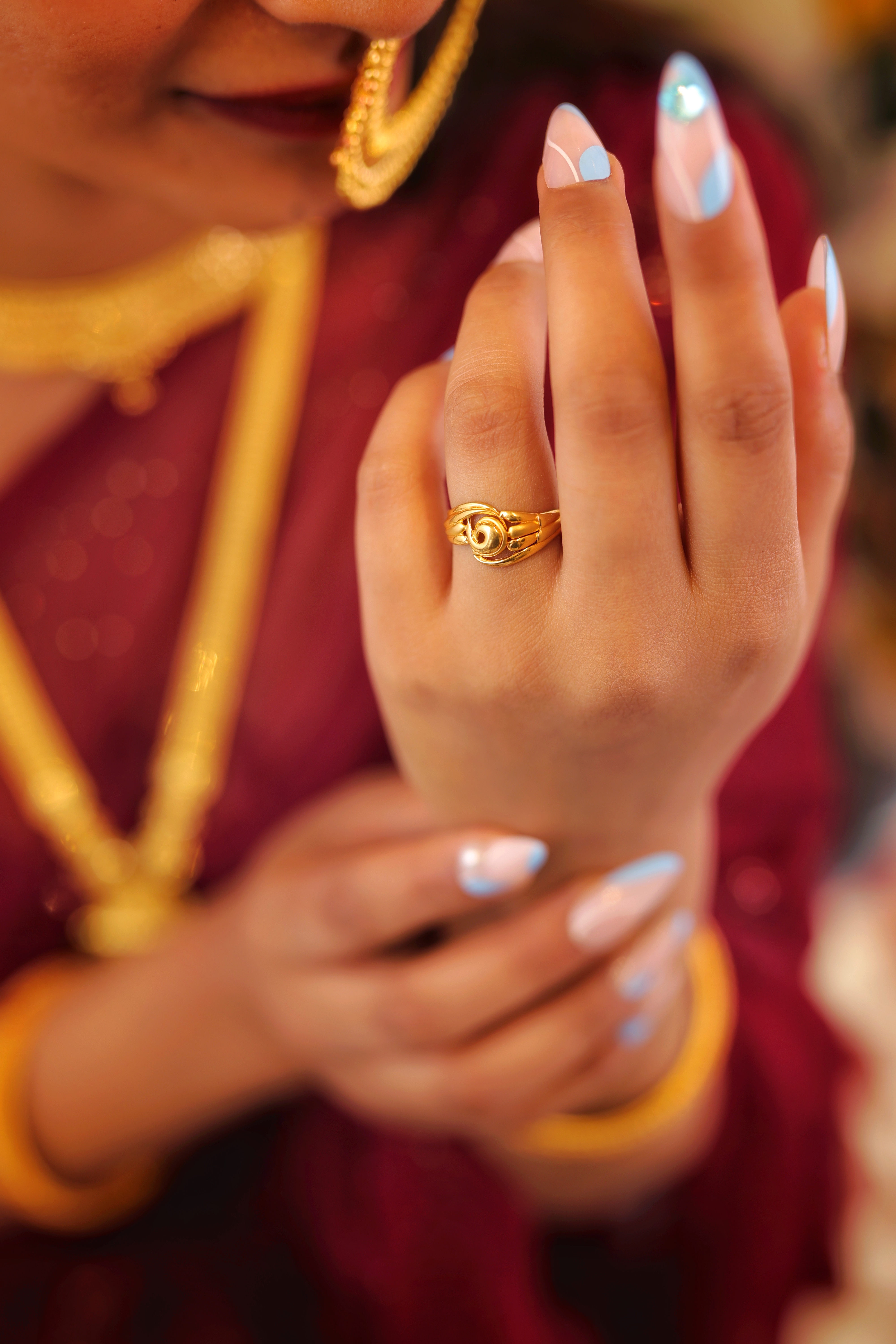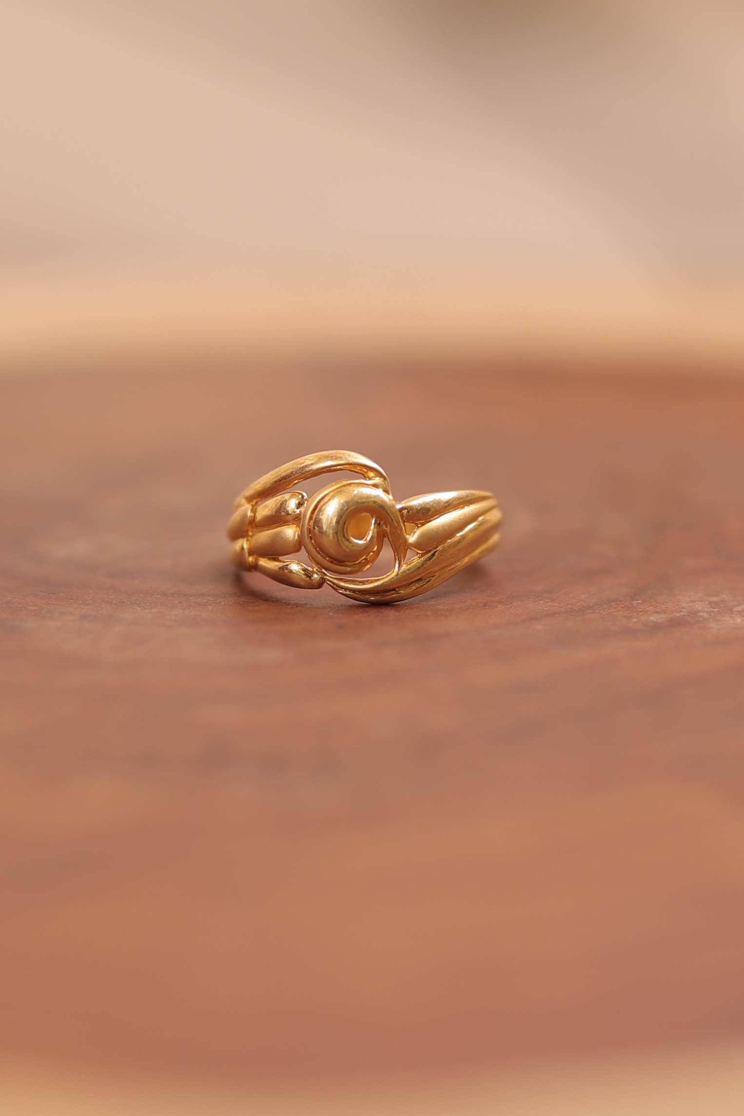 Key Features:Design: Broad, sculptural Ladies Casting Ring with an abstract, swirling motif. Motif: Central polished gold dome or bead surrounded by layered, spiral/wave elements. Finish: Smooth, high-polish finish, creating a bold, contemporary look. Metal Purity: 22 Carat Yellow Gold (916 purity). Usage: Ideal as a distinctive statement ring for festive occasions or modern traditional wear.