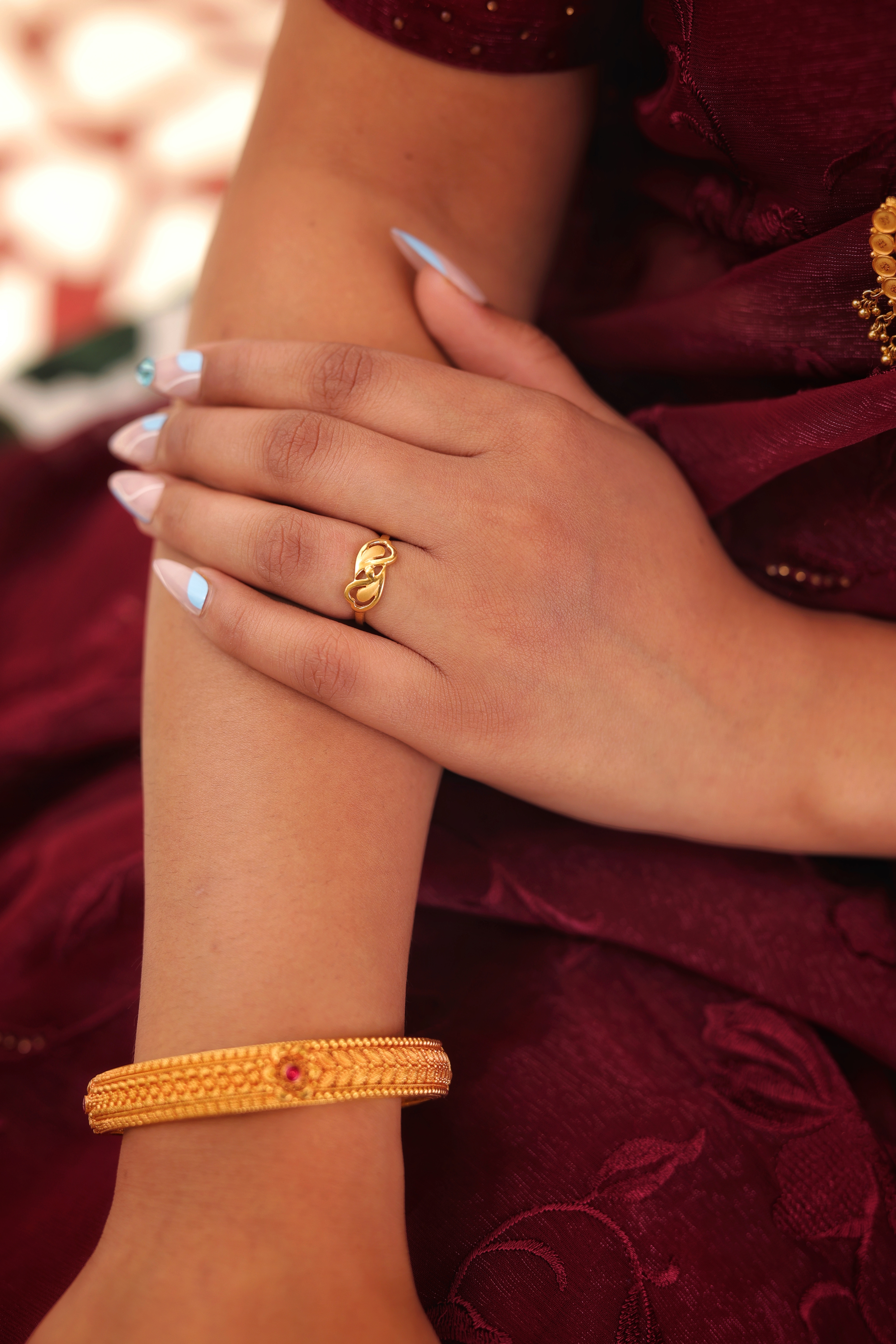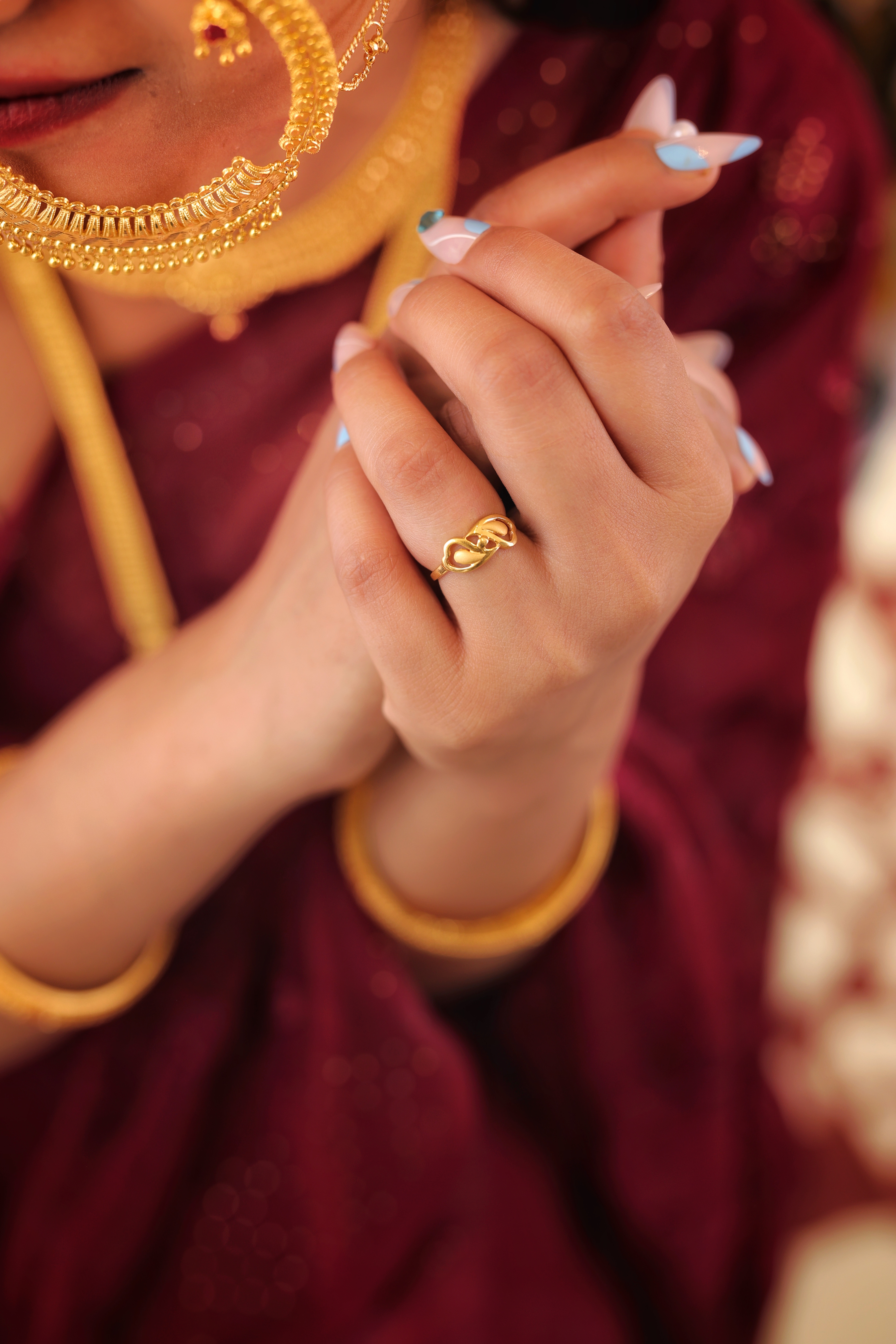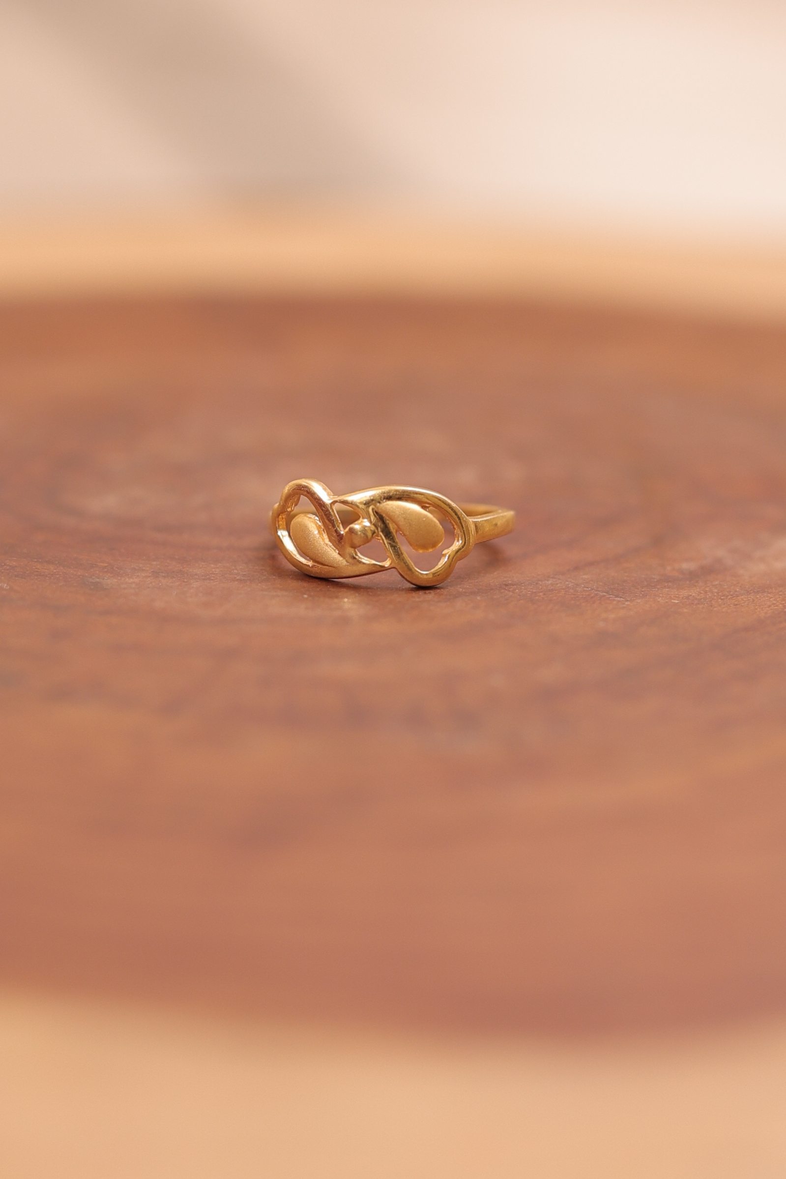 Key Features:Design: Delicate, elongated Ladies Casting Ring with a prominent leaf and loop motif. Motif: Two stylized, interlocking gold leaves framed by two open, polished gold loops. Finish: Smooth, high-polish finish that enhances the light, openwork structure. Metal Purity: 22 Carat Yellow Gold (916 purity). Usage: Ideal for lightweight daily wear, office wear, or as a graceful traditional accessory.