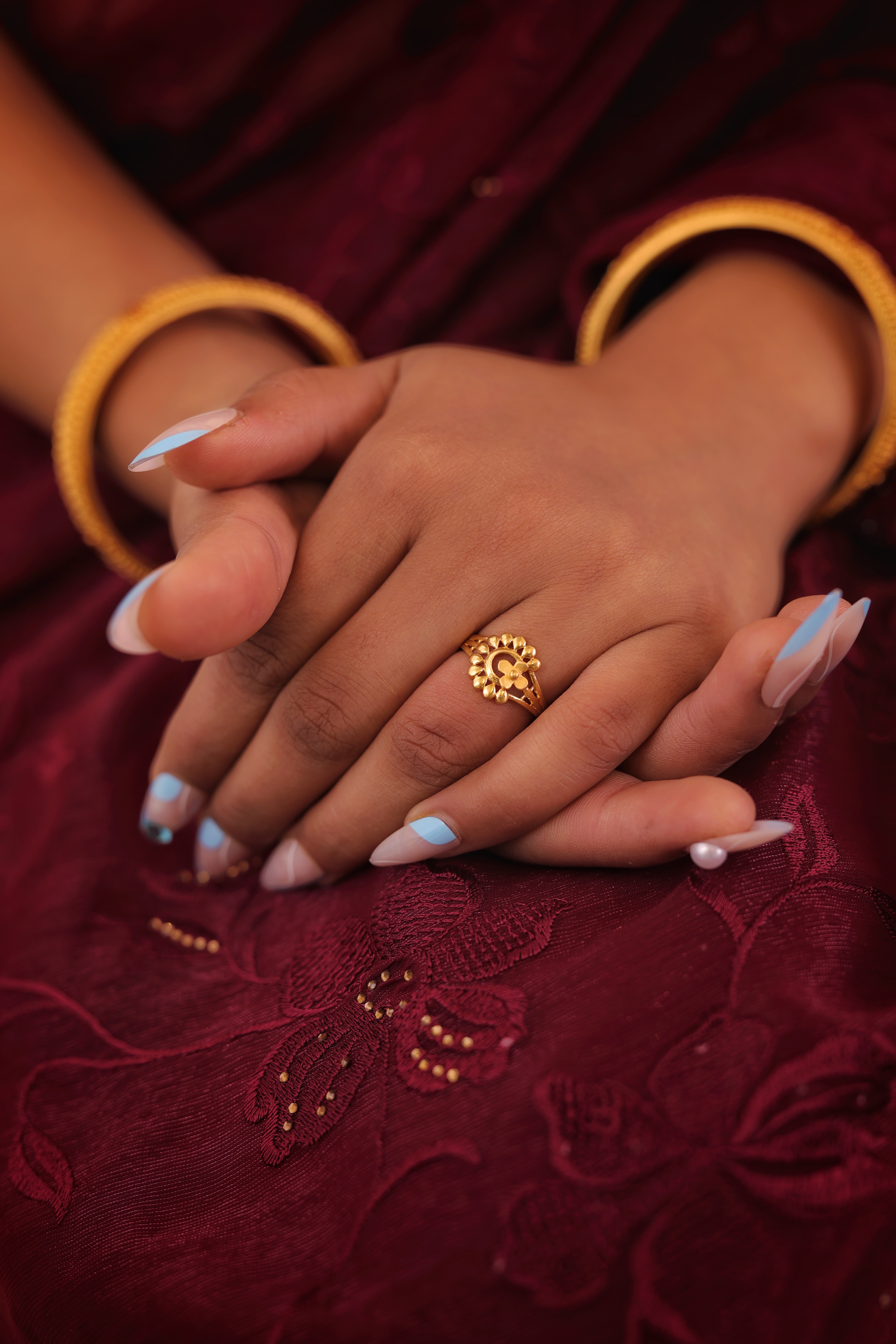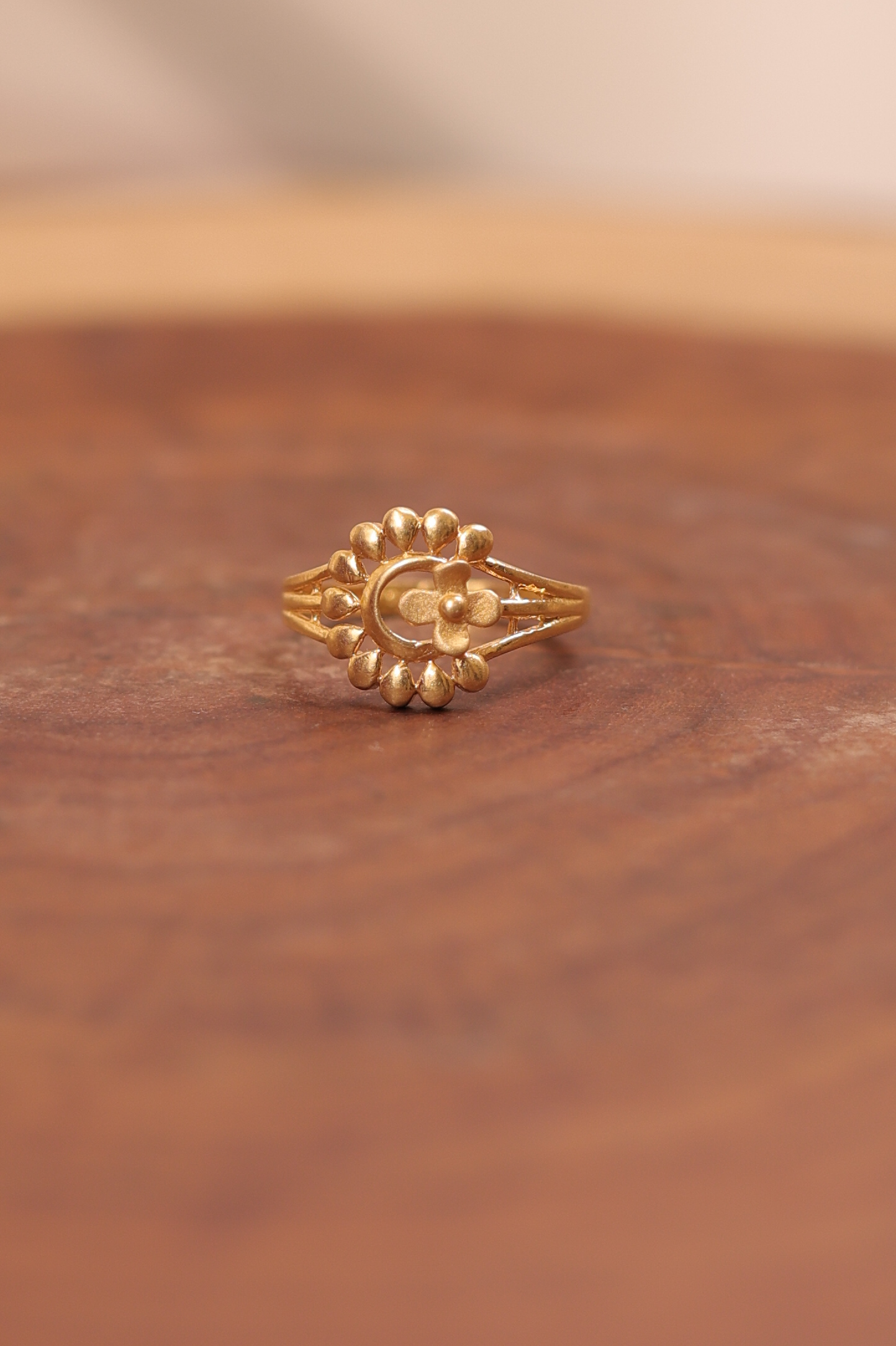 Key Features:Design: Broad, circular Ladies Casting Ring with a sunburst/floral motif. Motif: Central crescent and flower surrounded by a border of teardrop/petal elements. Details: The outer petals feature a subtle textured or matte finish. Metal Purity: 22 Carat Yellow Gold (916 purity). Usage: Ideal for daily wear, festive occasions, or as a graceful statement piece.