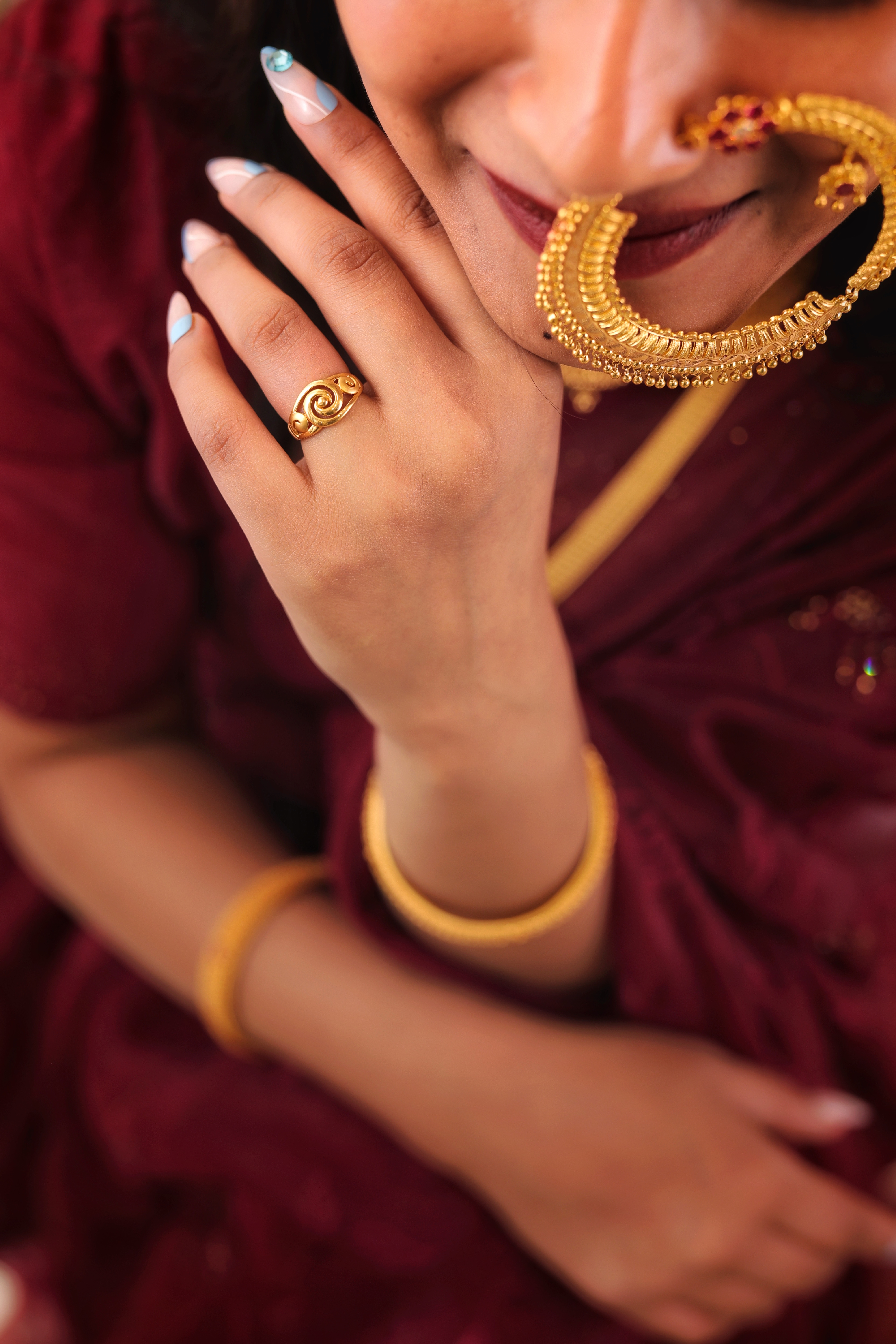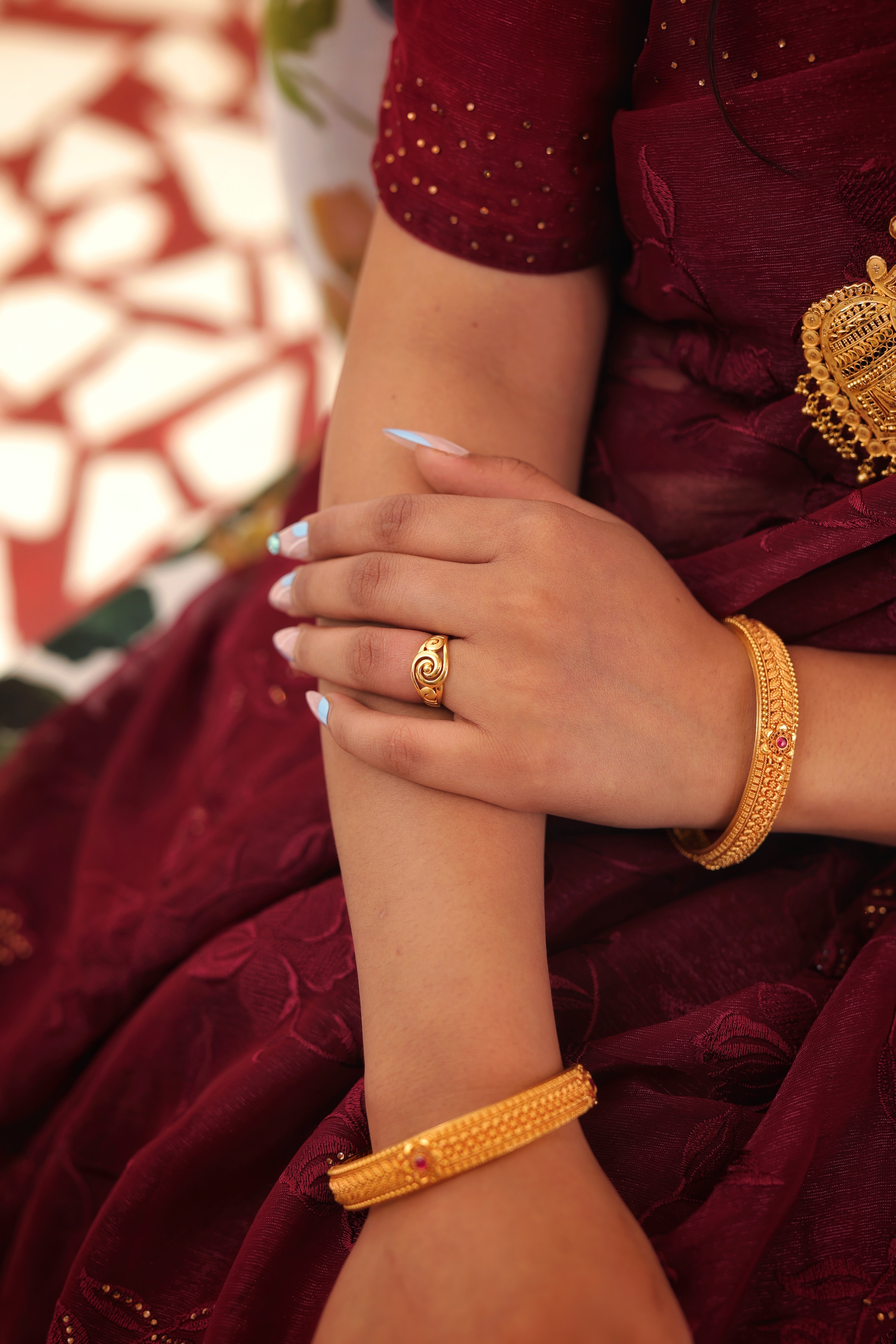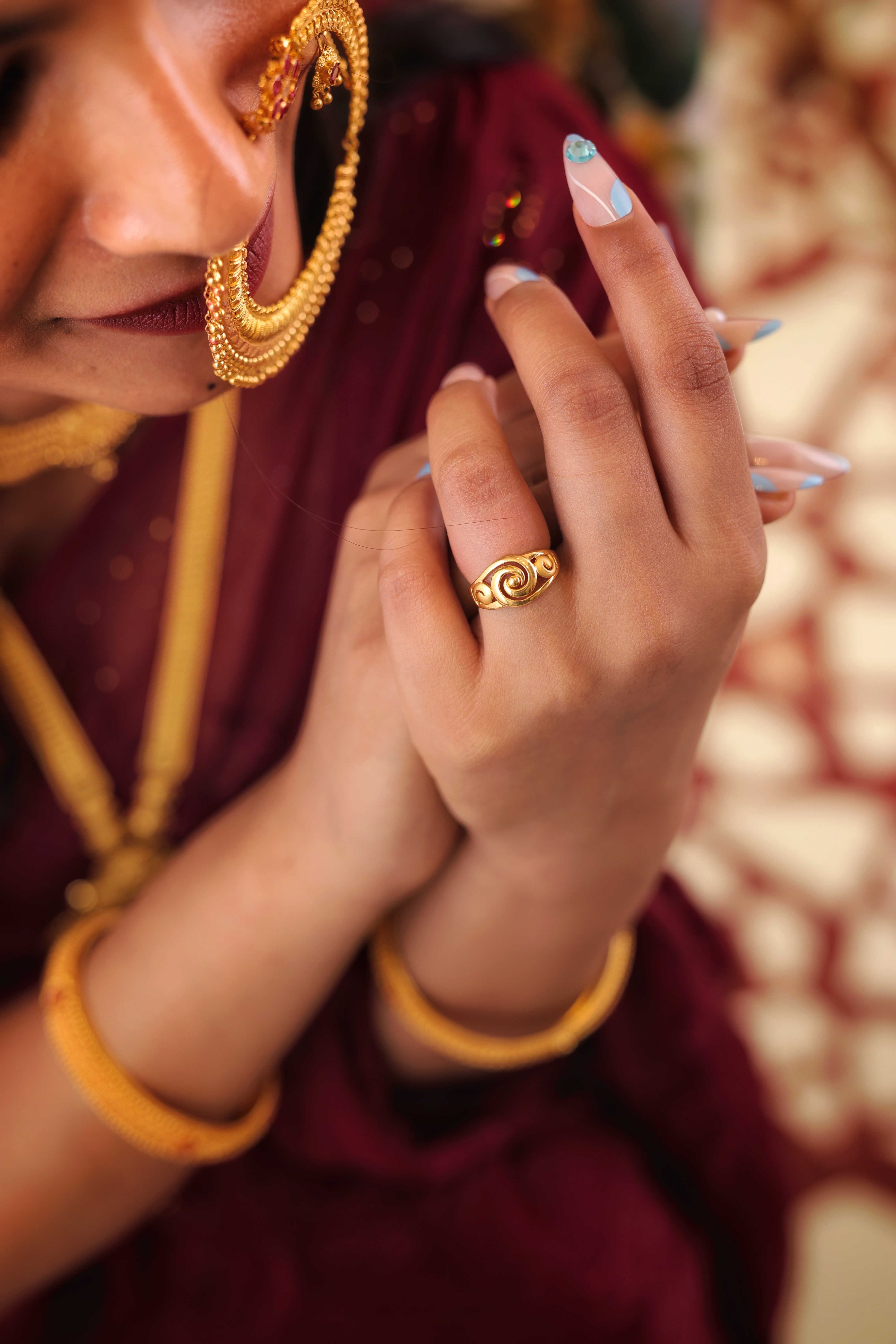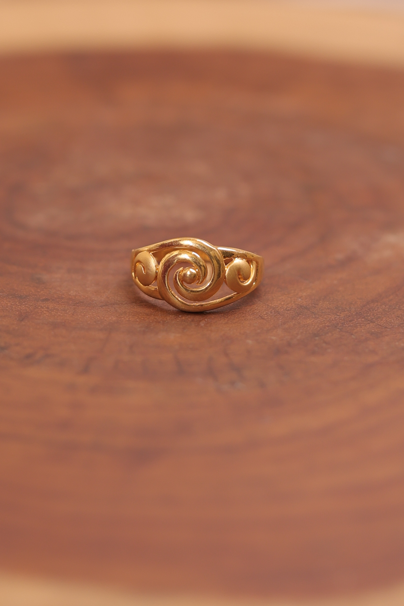 Key Features:Design: Broad, sculptural Ladies Casting Ring with a prominent central double spiral motif. Motif: Two large, smooth gold spirals or swirls flanked by delicate side scrollwork. Finish: Smooth, high-polish finish, creating a bold, contemporary look. Metal Purity: 22 Carat Yellow Gold (916 purity). Usage: Ideal as a distinctive statement ring for festive occasions or sophisticated daily wear.