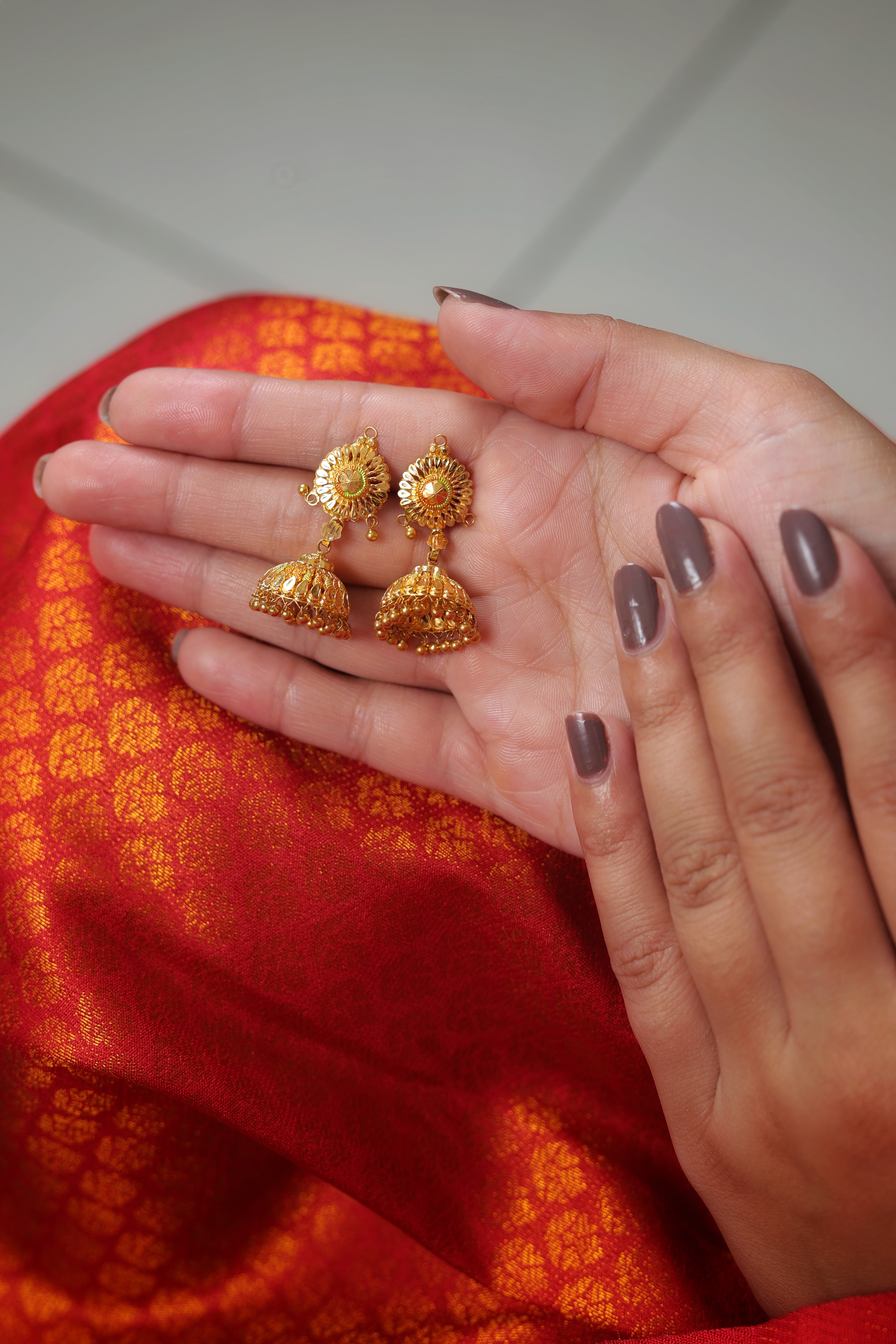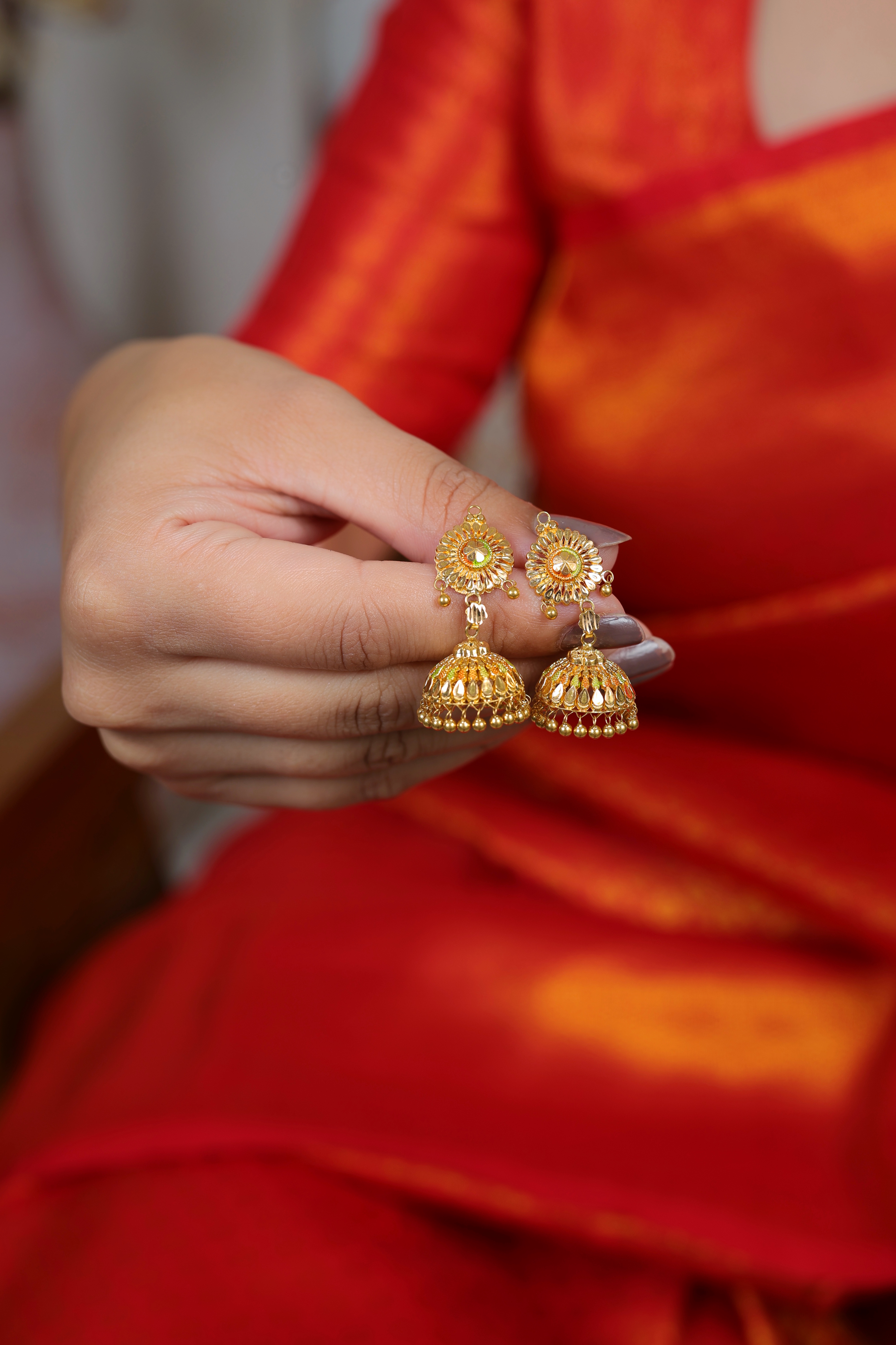 The Bell (Jhumka): The drop is a single, perfectly domed bell with a smooth, polished surface that contrasts with the detailed work on the top. The base of the bell is edged with a classic row of dangling gold ghungroos (small polished gold beads), which add movement and the characteristic jingle.