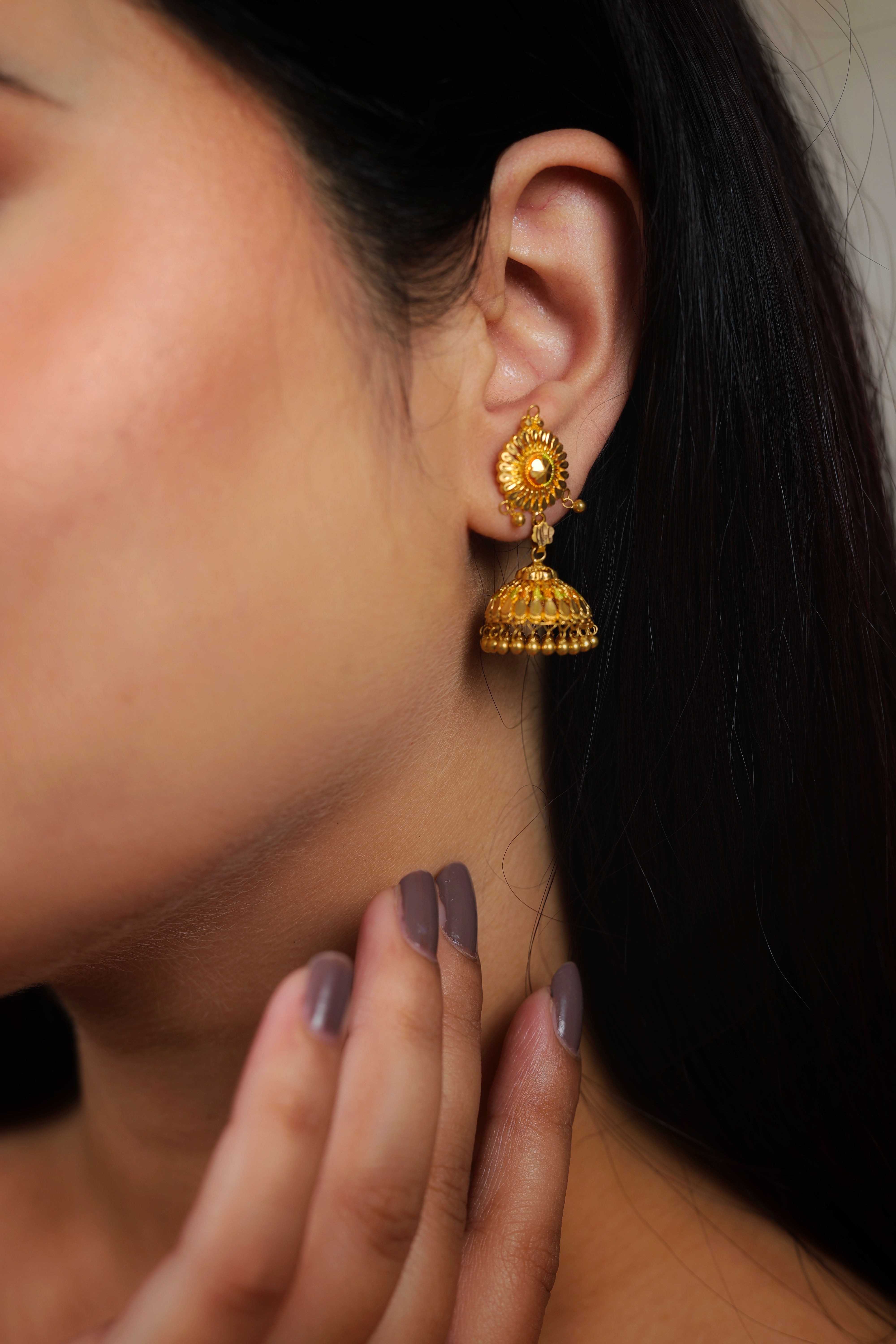 These elegant earrings are a refined and traditional take on the timeless Jhumki style, crafted in rich 22-carat yellow gold (916 purity). They are designed for a look that is both ornate and wearable.