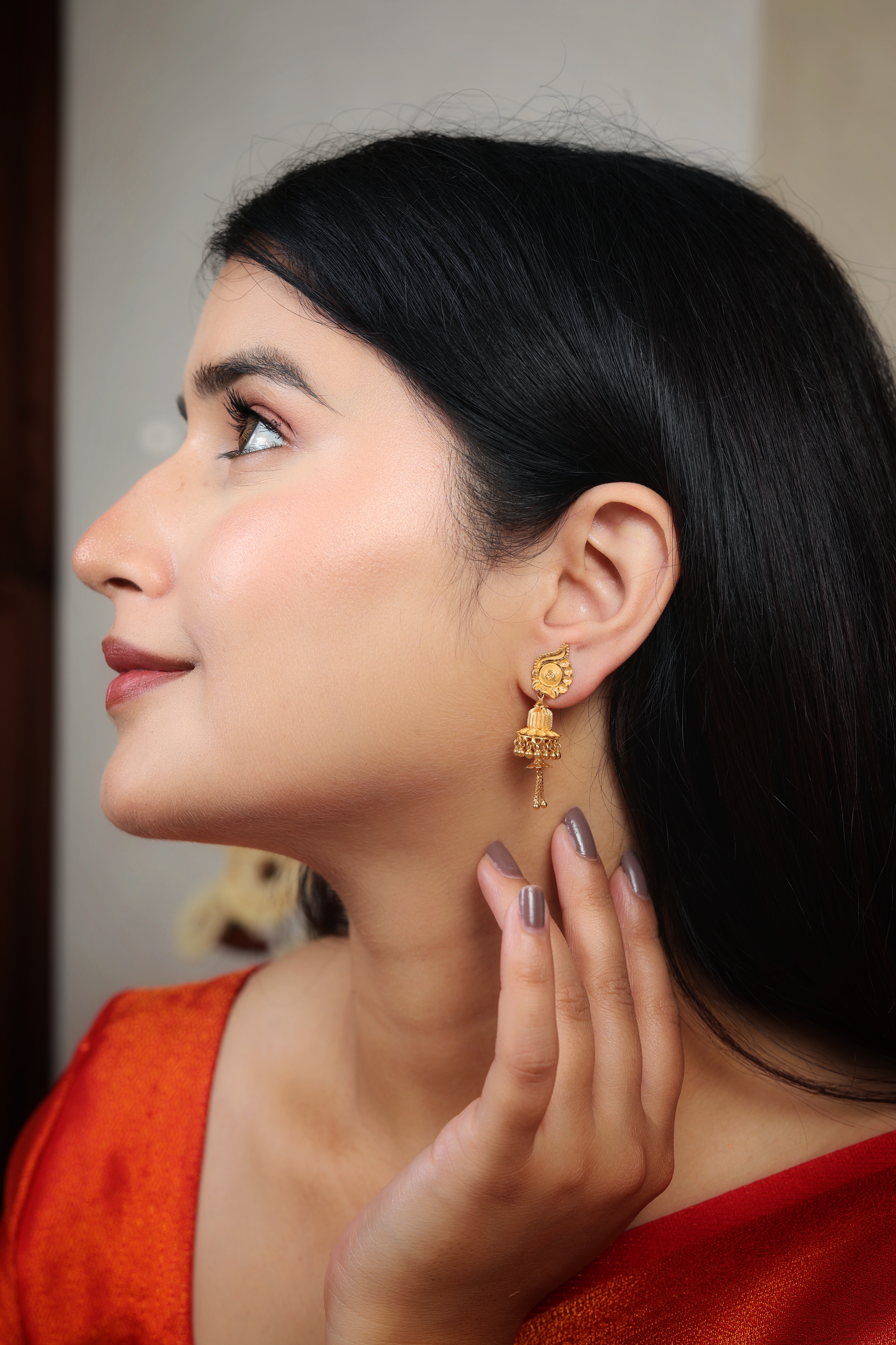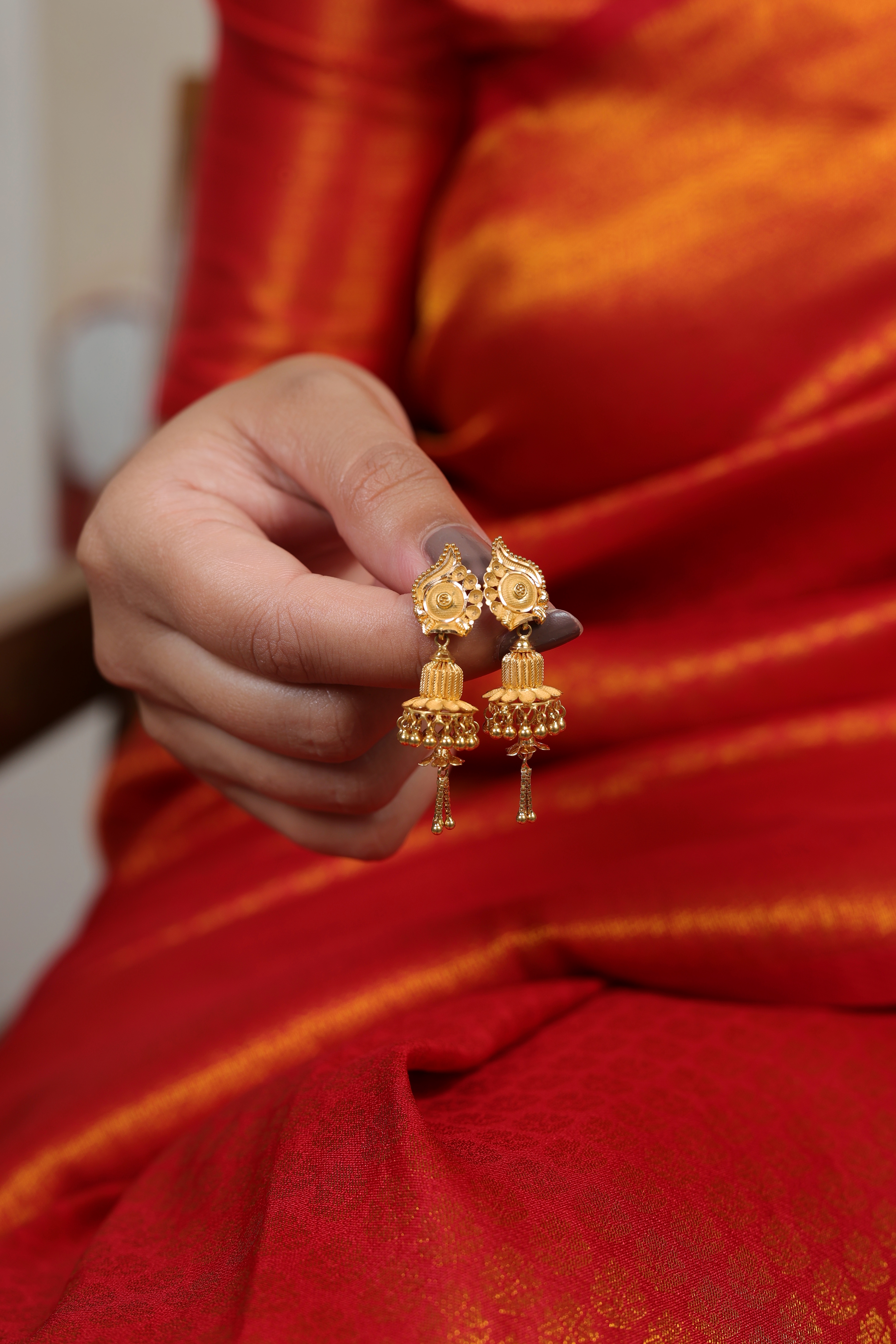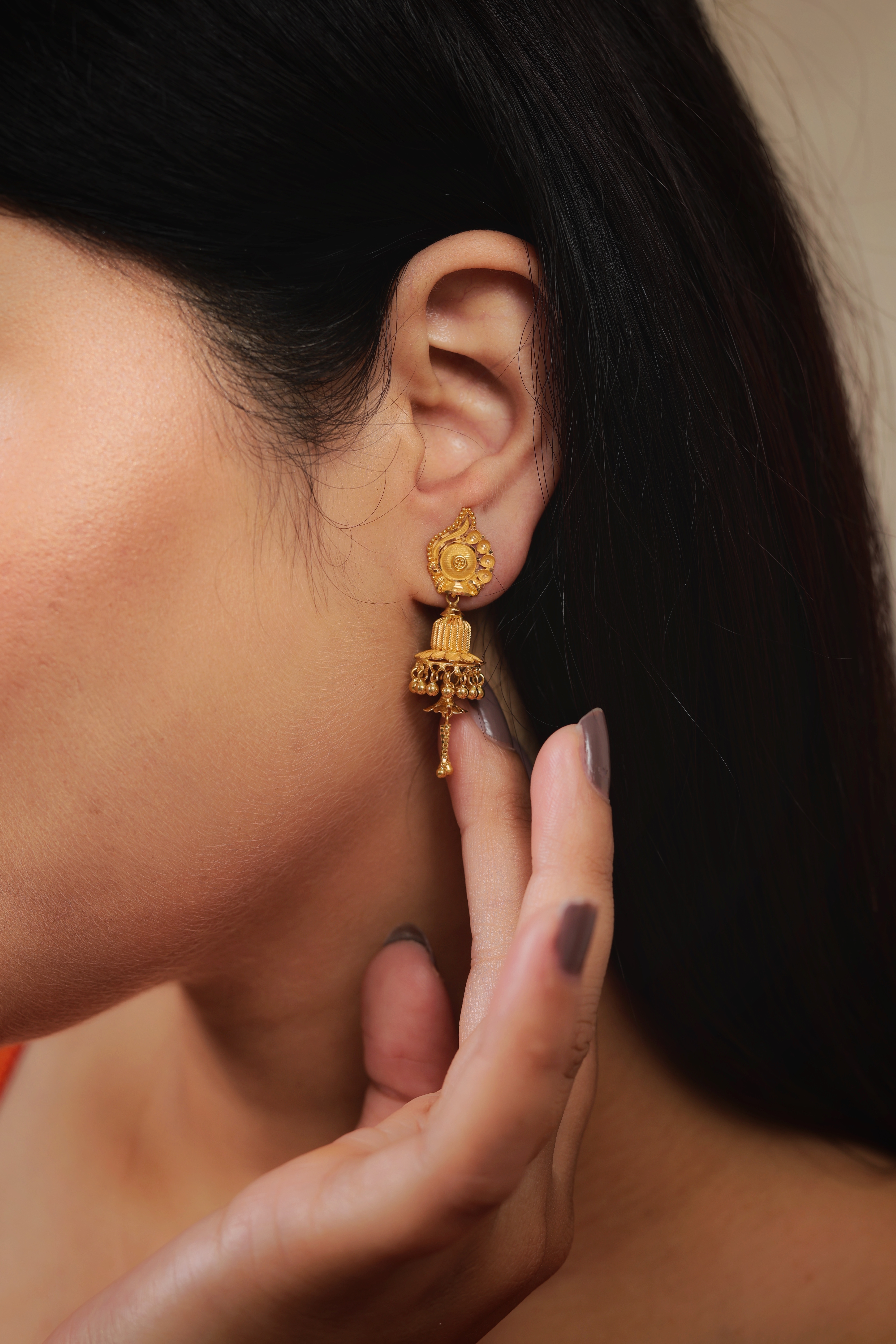 Key Features:Design: Traditional Jhumki style with an elongated stud and a substantial, textured bell drop. Motif: Ornate, sculpted drop-shaped stud with floral detailing. Bell: Features fine texturing/beading and a subtle layered look. Drop: Finished with dangling gold accents and small chain tassels. Metal Purity: 22 Carat Yellow Gold (916 purity). Usage: Ideal for weddings, engagement ceremonies, and major festive gatherings.