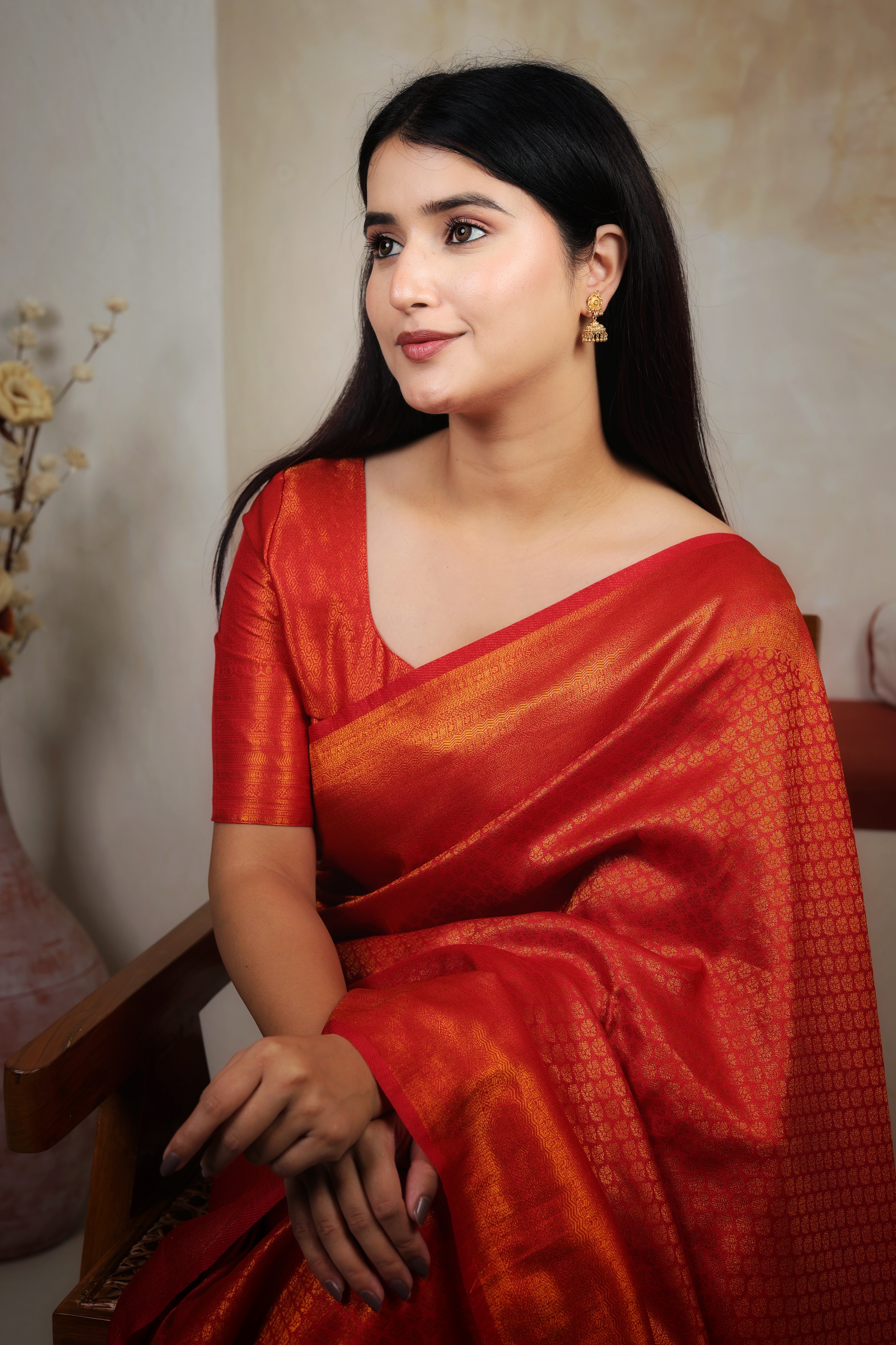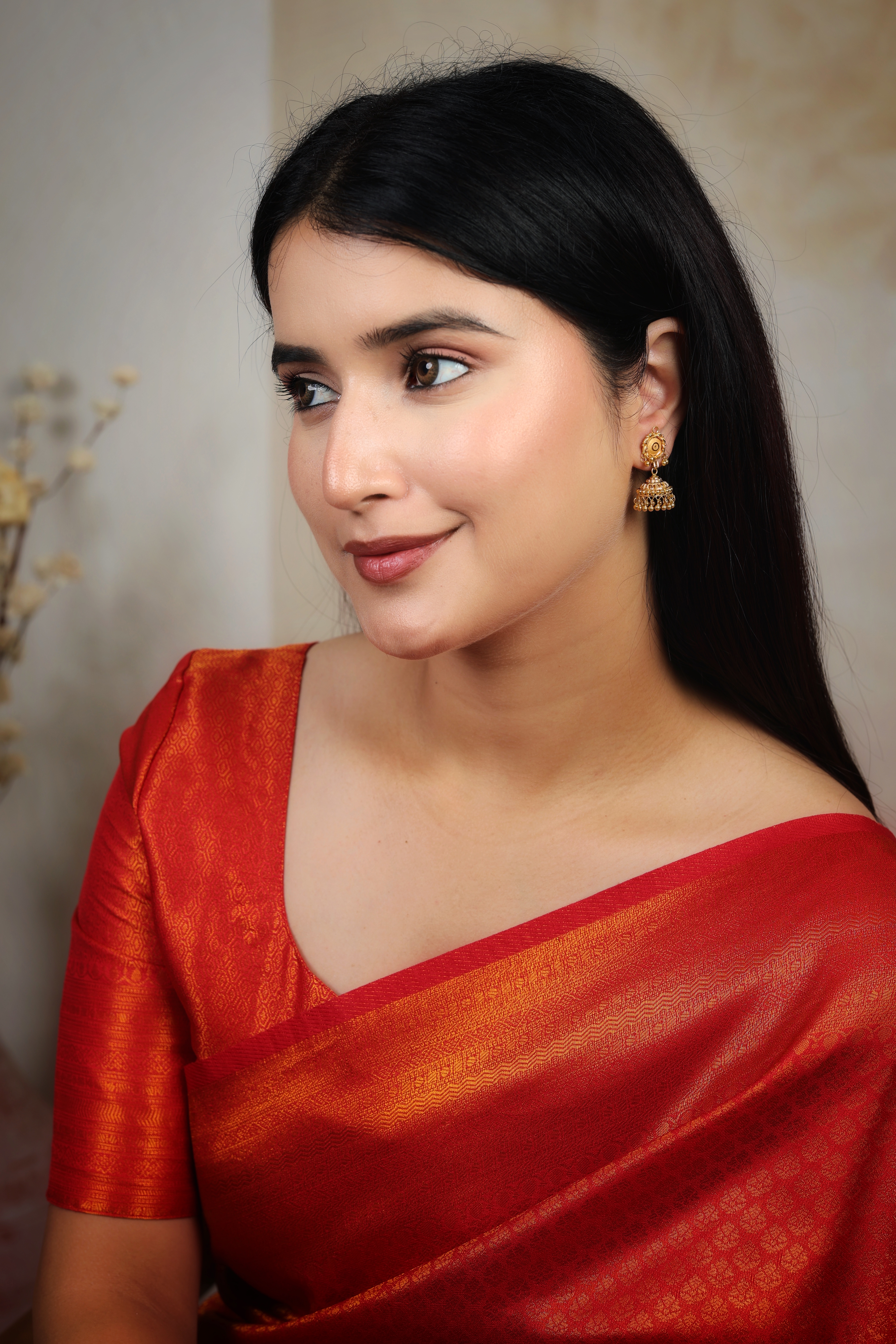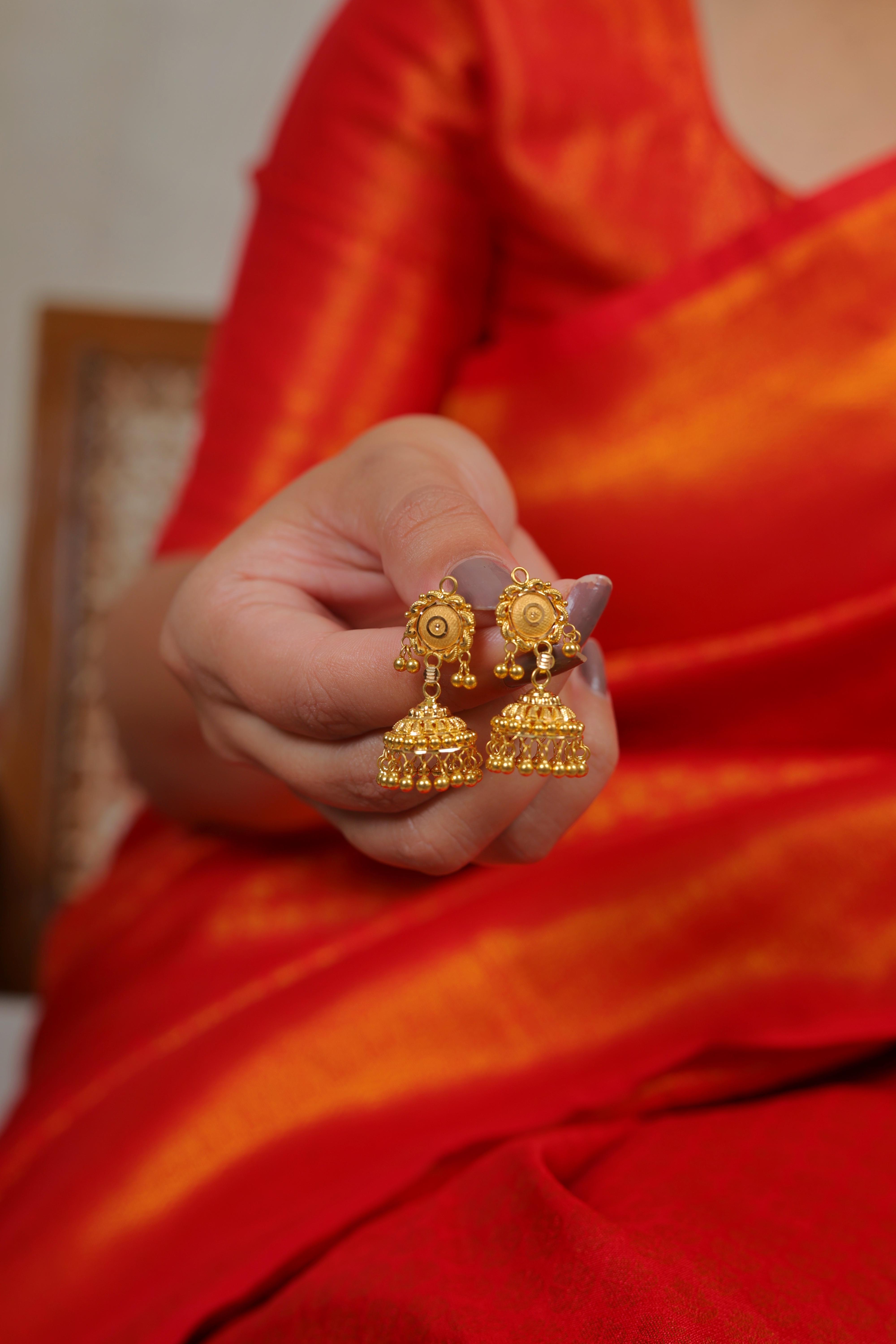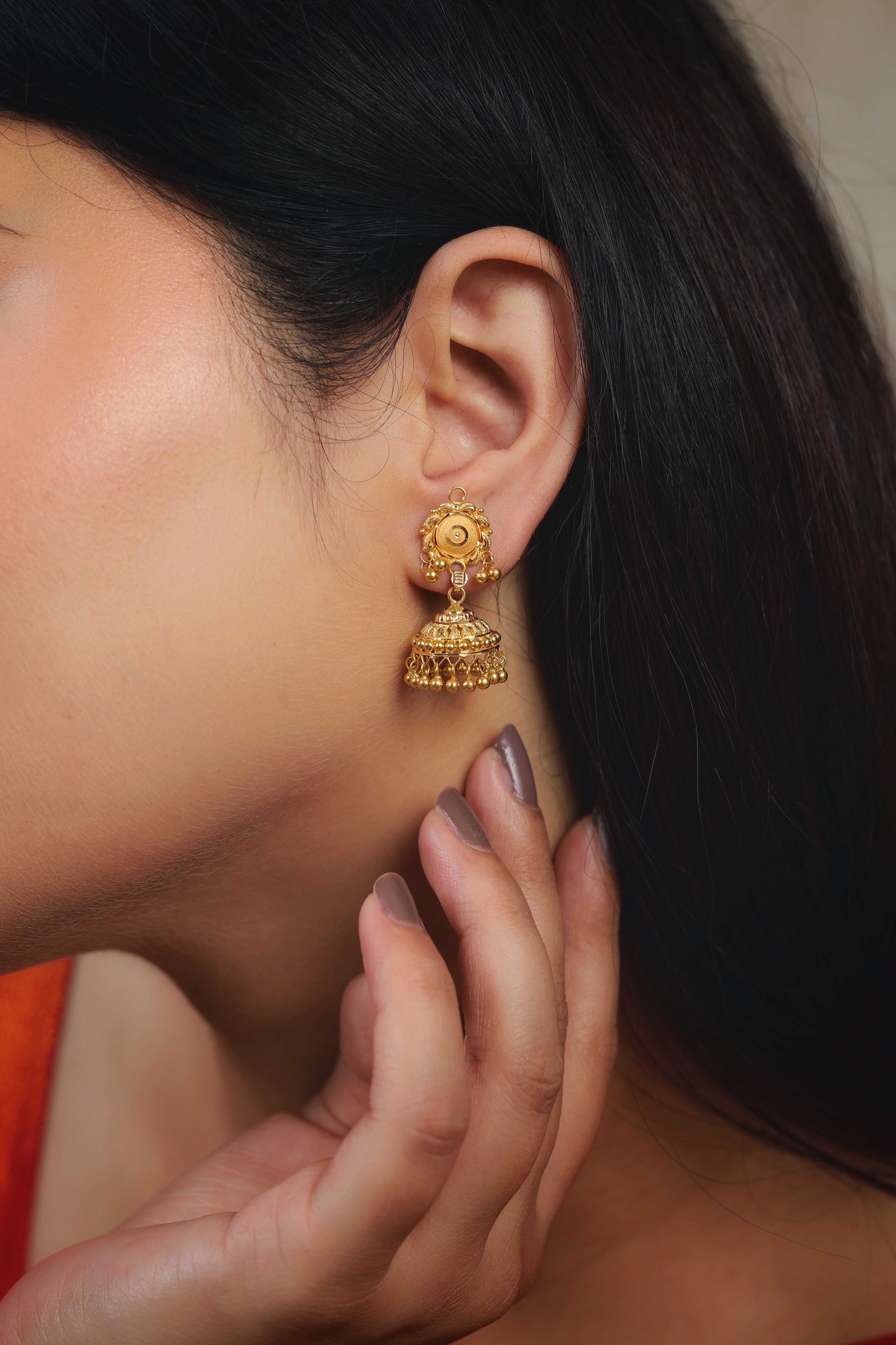 The Bell (Jhumka): The drop is a single, classic inverted bell. The surface of the bell is beautifully finished with vertical ribbing and a fine mesh-like texture, creating a rich, matte-gold shimmer. The bottom edge is finished with a neat row of dangling gold beads (ghungroos) that provide subtle movement and sparkle.