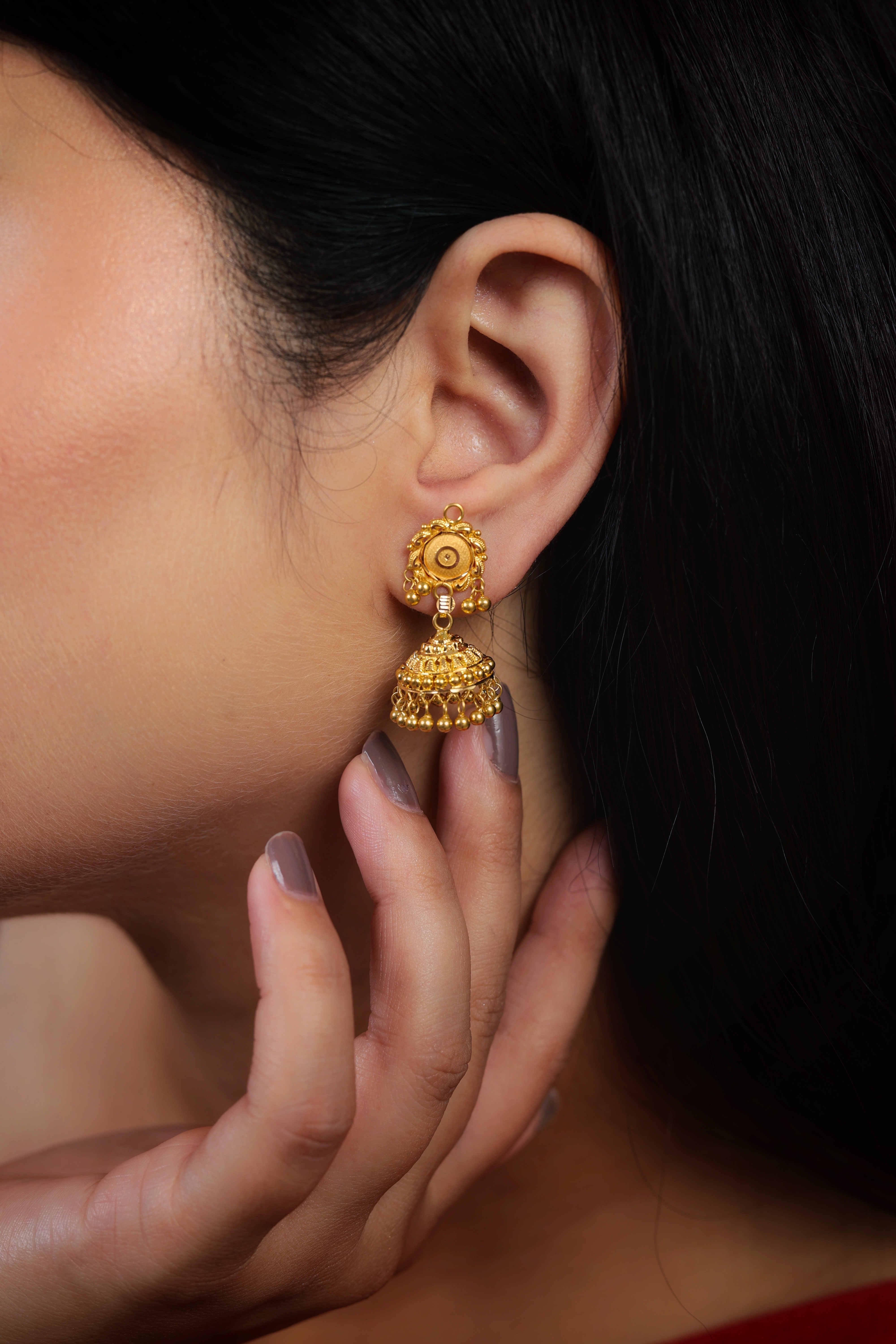 Key Features:Design: Classic traditional Jhumki style with a focus on concentric medallion detailing. Motif: Multi-textured circular stud connected to a finely ribbed bell. Finish: Adorned with a border of polished gold bead accents. Metal Purity: 22 Carat Yellow Gold (916 purity). Usage: Ideal for festive occasions, traditional family gatherings, or as an elegant addition to bridal jewelry.