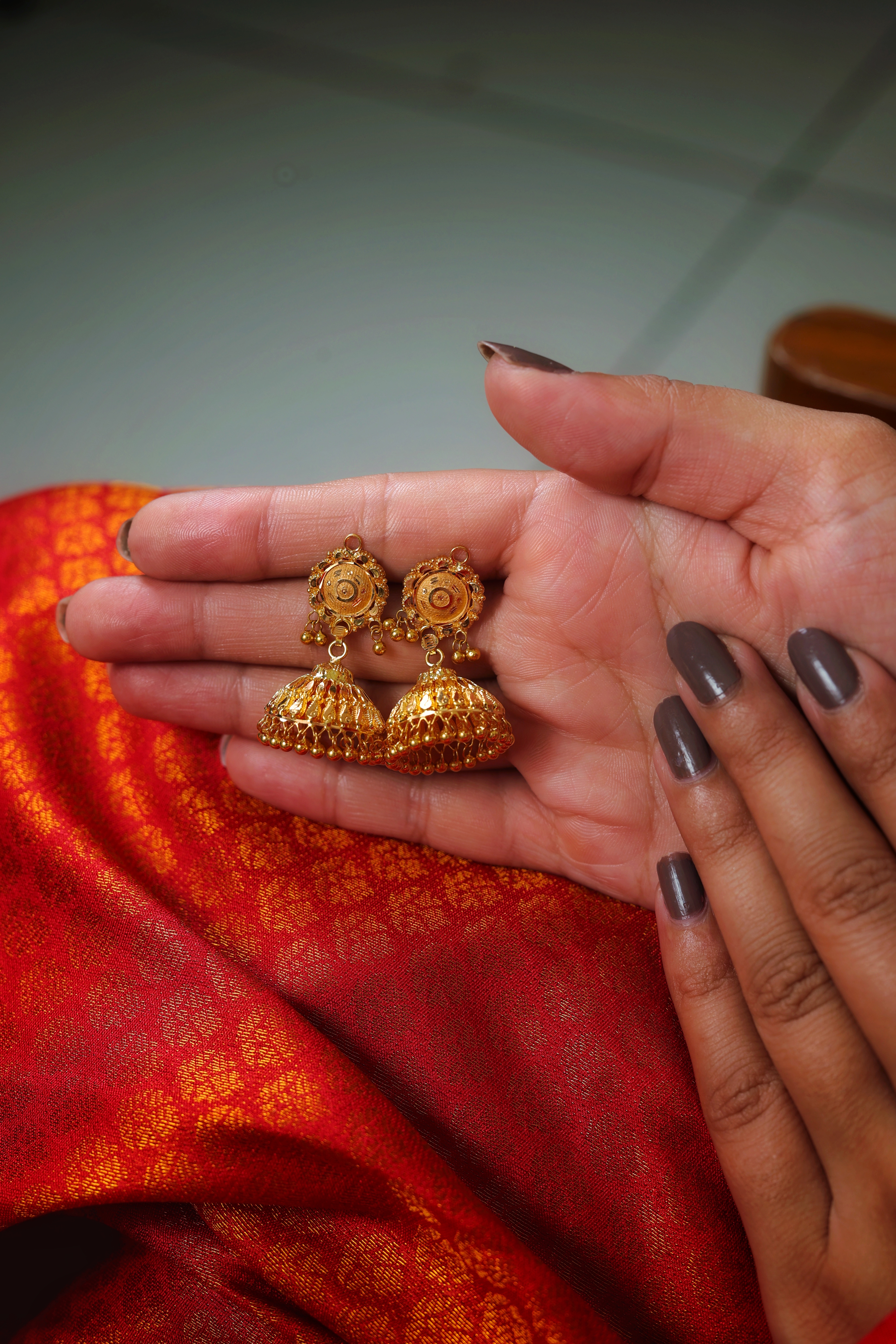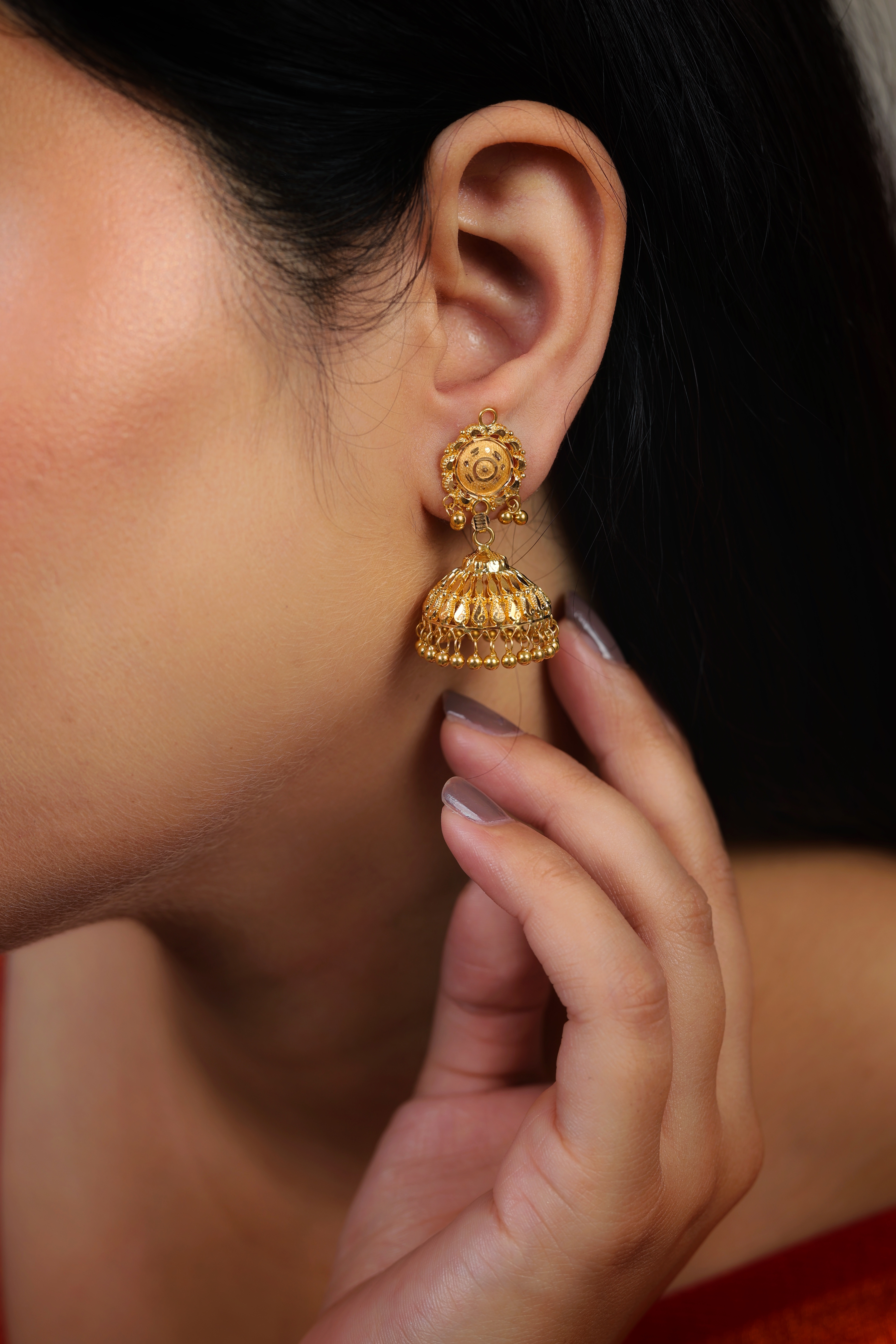 Key Features:Design: Statement traditional Jhumki style with a grand, wide-profile silhouette. Motif: Detailed sunburst medallion stud paired with a filigree bell drop. Details: Features high-quality openwork gold patterns and multiple dangling bead accents. Metal Purity: 22 Carat Yellow Gold (916 purity). Usage: A regal choice for bridal wear, grand weddings, and formal traditional celebrations.