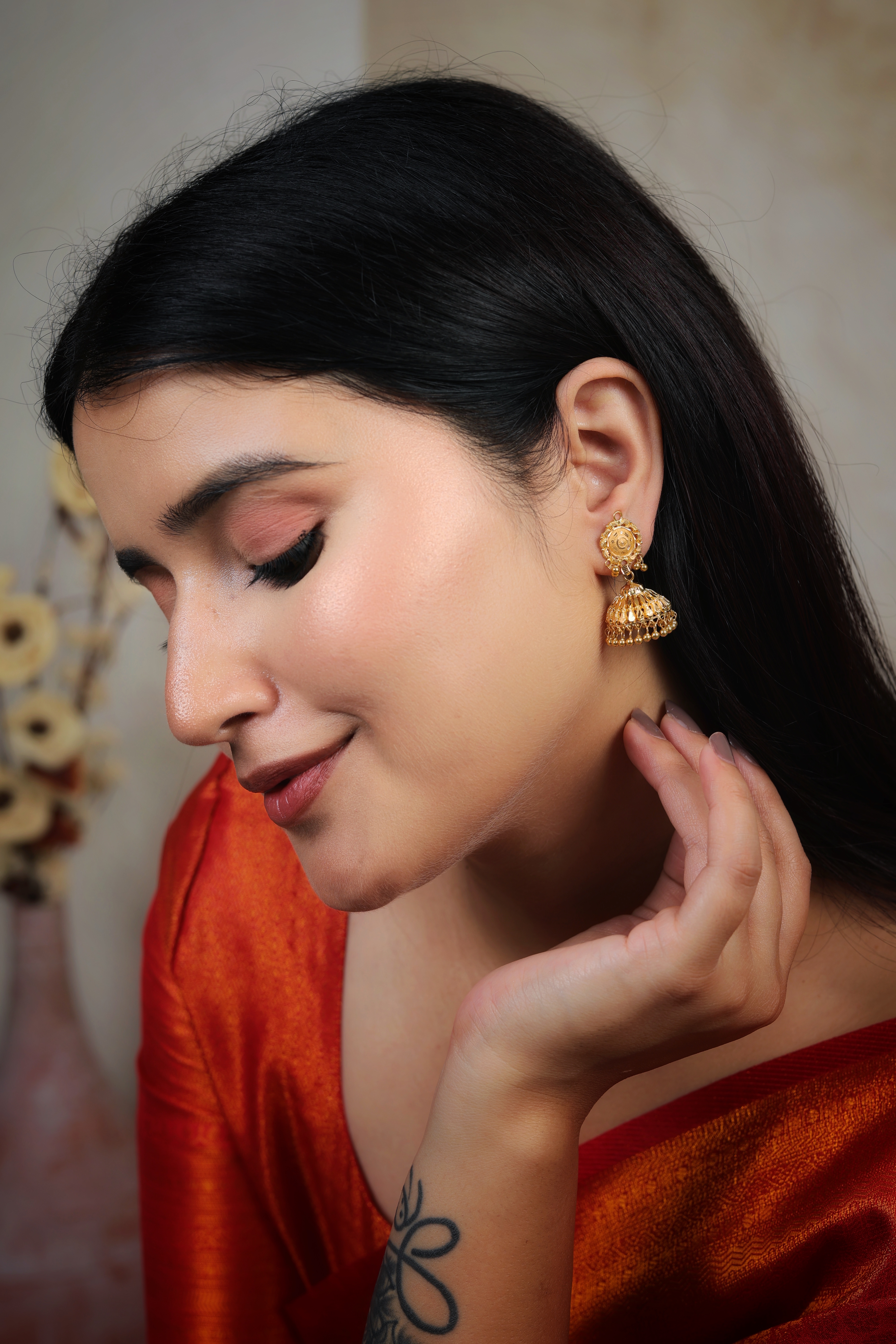 The Bell (Jhumka): The drop is a single, large inverted bell. The surface is exceptionally detailed, featuring a combination of vertical ribbing on the upper half and an intricate open-frame filigree pattern on the lower half. This openwork allows light to pass through, highlighting the delicate lace-like gold structures.