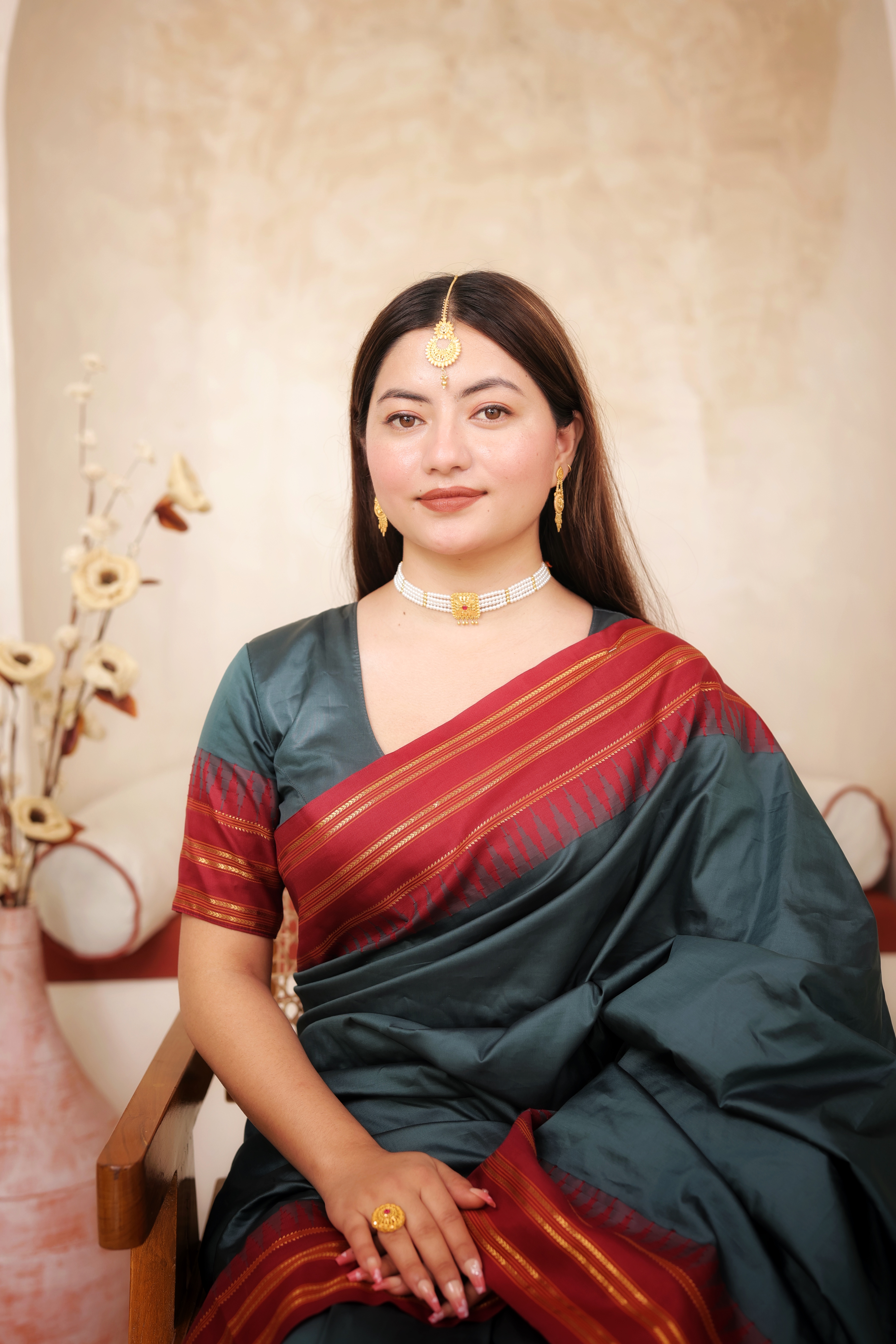 The centerpiece, handcrafted in 22 Karat Gold, features intricate detailing and a stunning ruby-coloured stone at the centre—adding a regal charm to the entire design. Gold bead dividers further enhance the richness, making the piece stand out beautifully against sarees, lehengas, and cultural attire.
