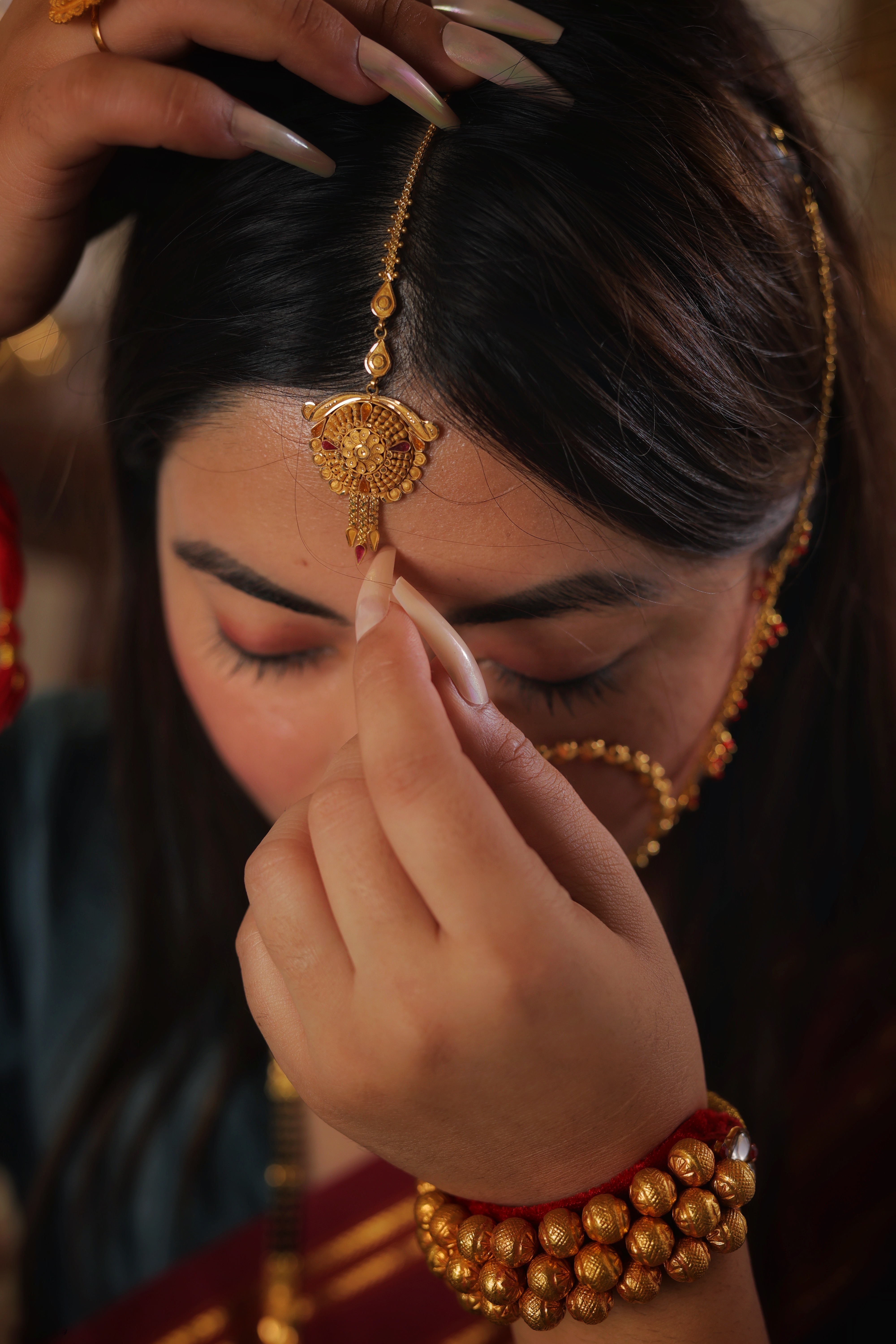 This exquisite Maang Tika is a masterful blend of classic motifs and detailed craftsmanship, meticulously rendered in rich 22-carat yellow gold (916 purity). The design focuses on a singular, highly textured medallion that serves as a radiant focal point.