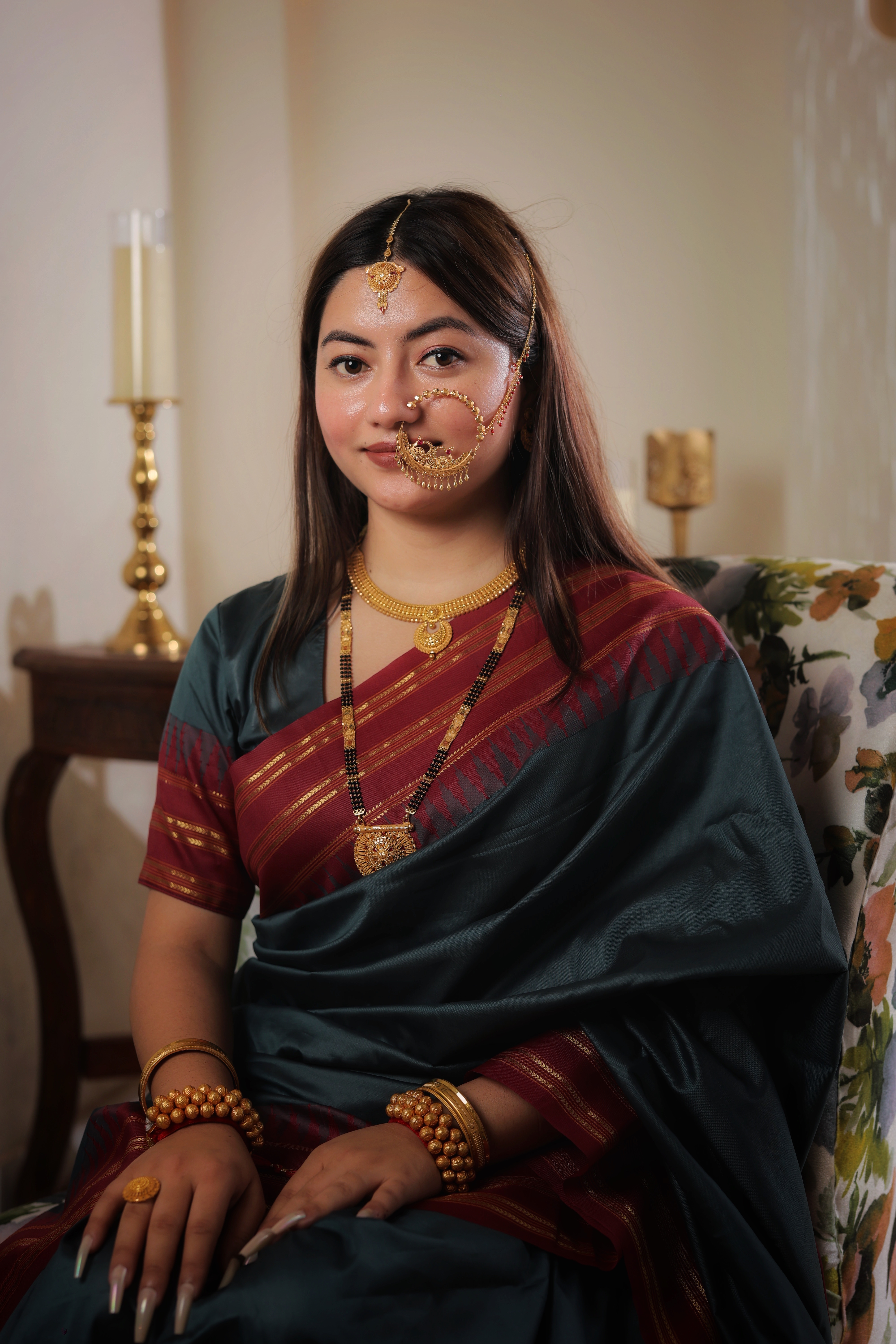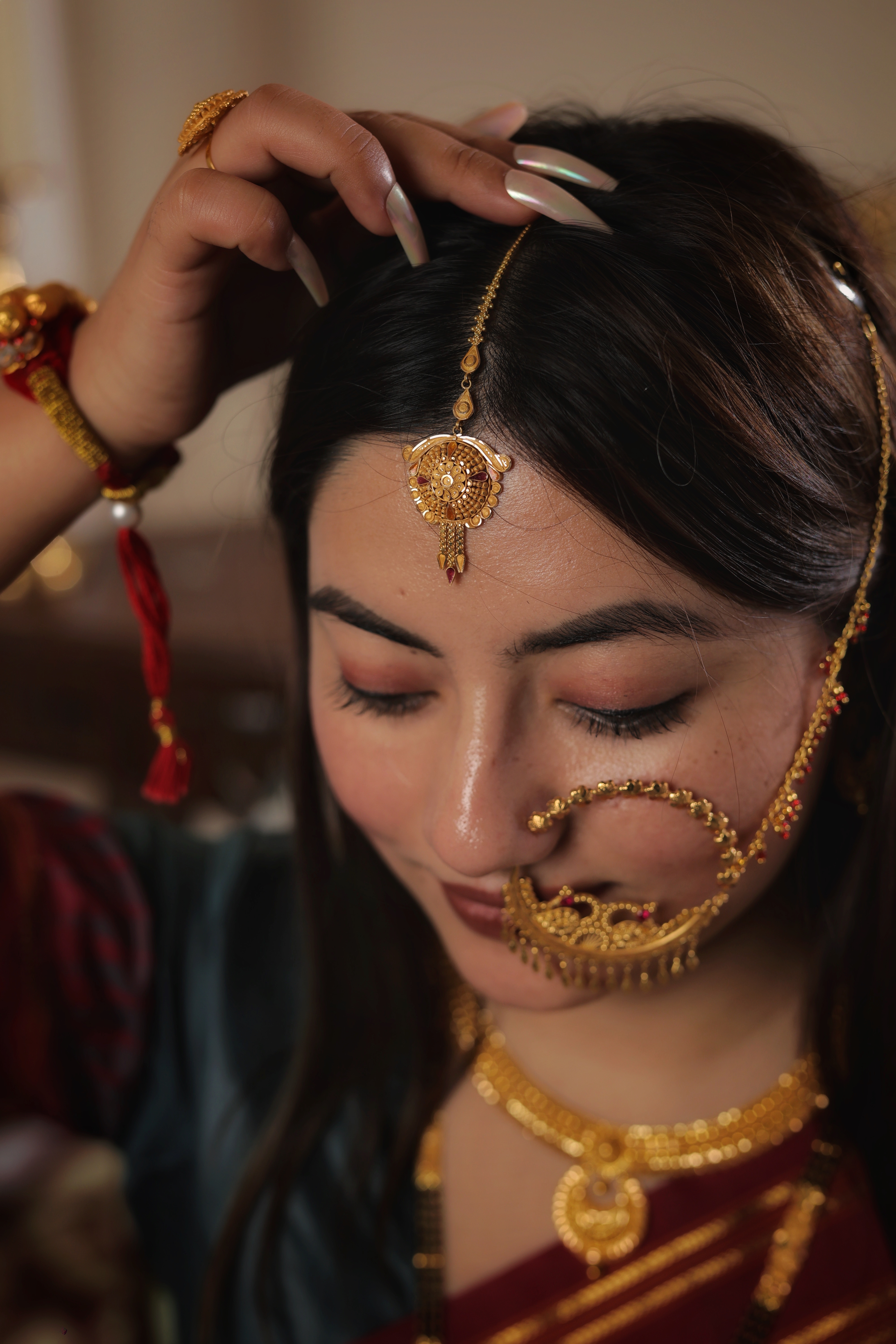 The Chain (Primary): The pendant is held by a slender gold chain with small, beaded link details. This design allows the headpiece to sit securely and gracefully along the hair parting, enhancing the wearer's facial features.
