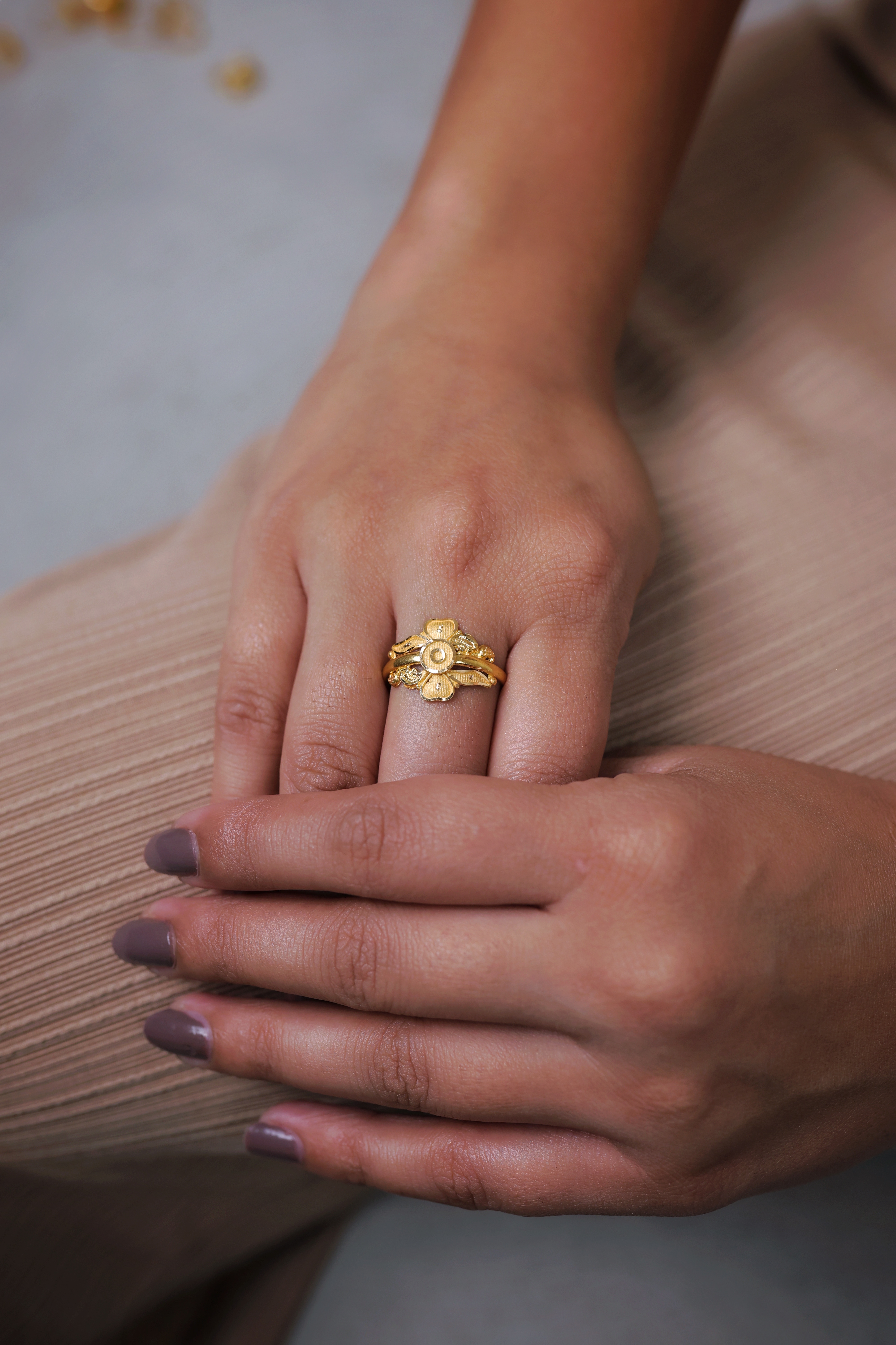 This exquisite ring is a celebration of nature-inspired artistry, masterfully crafted in 22-carat yellow gold (916 purity). The design features a bold, dimensional floral centerpiece that sits prominently on the hand, offering a regal and feminine aesthetic.