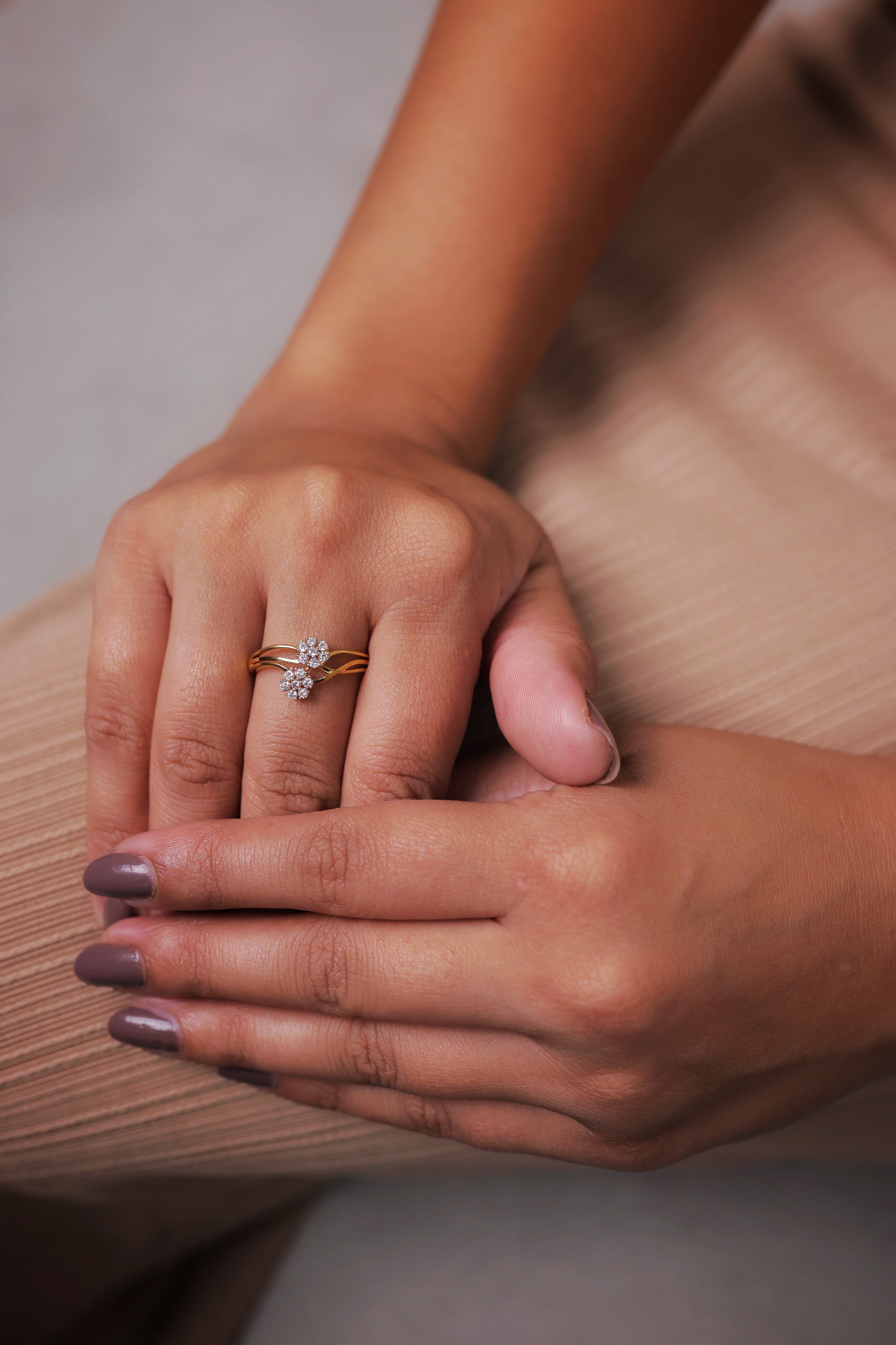 Key Features:Design: Dainty Dual-Bloom motif with a sophisticated split-shank profile. Gemstones: Lavishly set with pavé artificial diamonds for refined brilliance. Texture: Features a flawless high-polish finish on a slender gold frame. Metal Purity: 22 Carat Yellow Gold (916 purity). Usage: A perfect choice for daily luxury, engagement celebrations, or as a meaningful gift for someone special.
