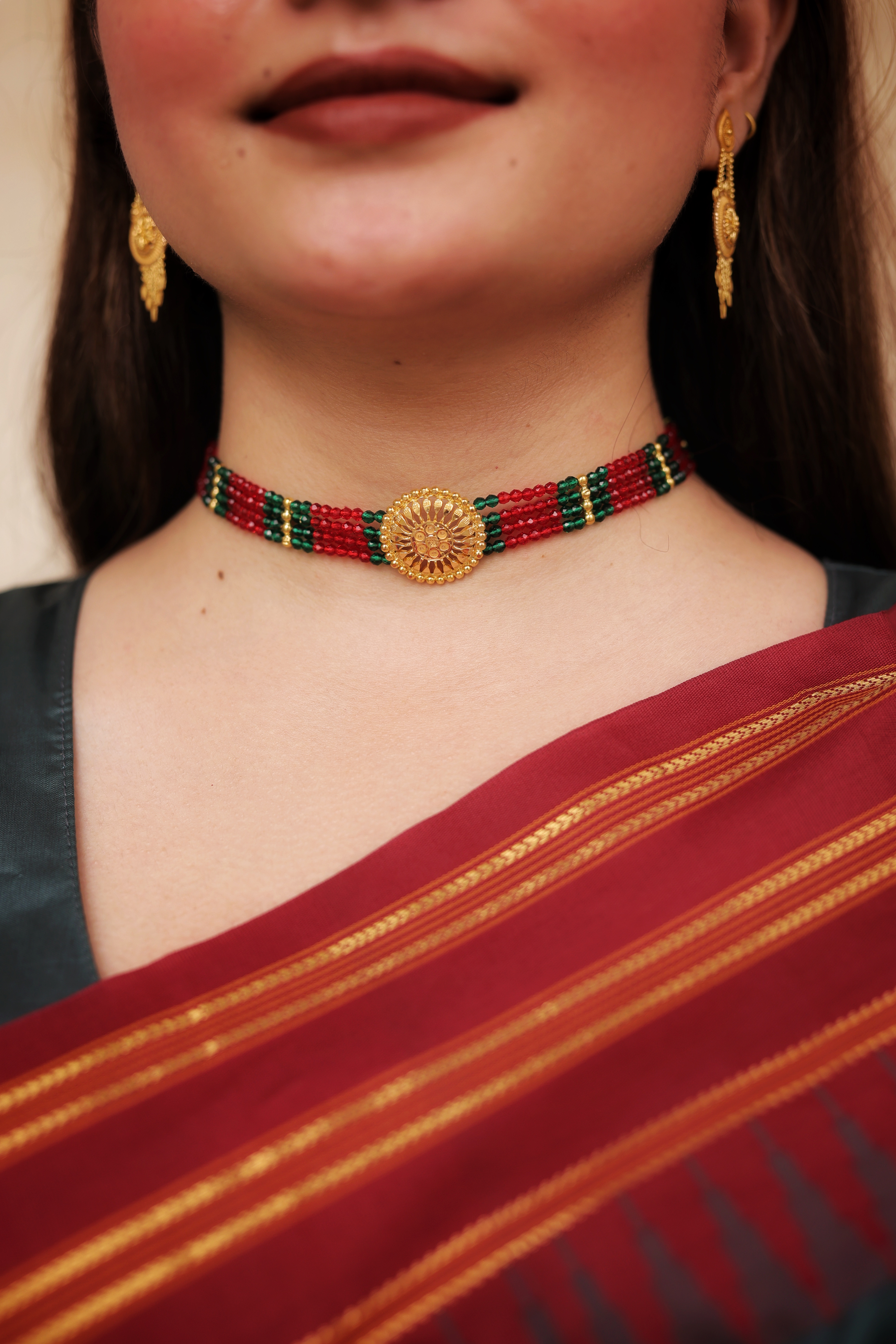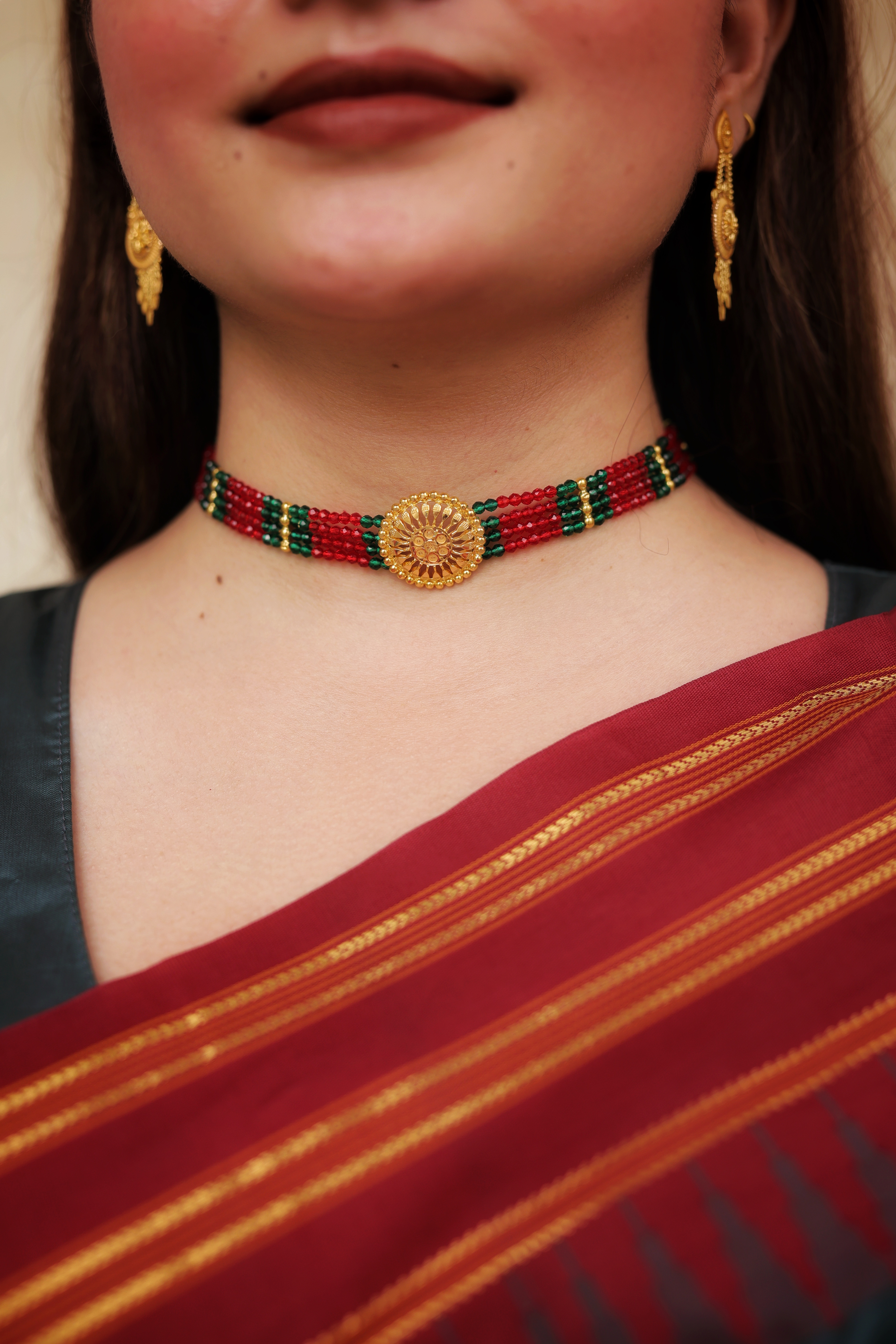 A handcrafted Chokhar featuring vibrant red and green crystal beads, gold bead spacers, and a beautifully engraved 22K gold round centerpiece. Perfect for weddings, festive occasions, and traditional ethnic wear.