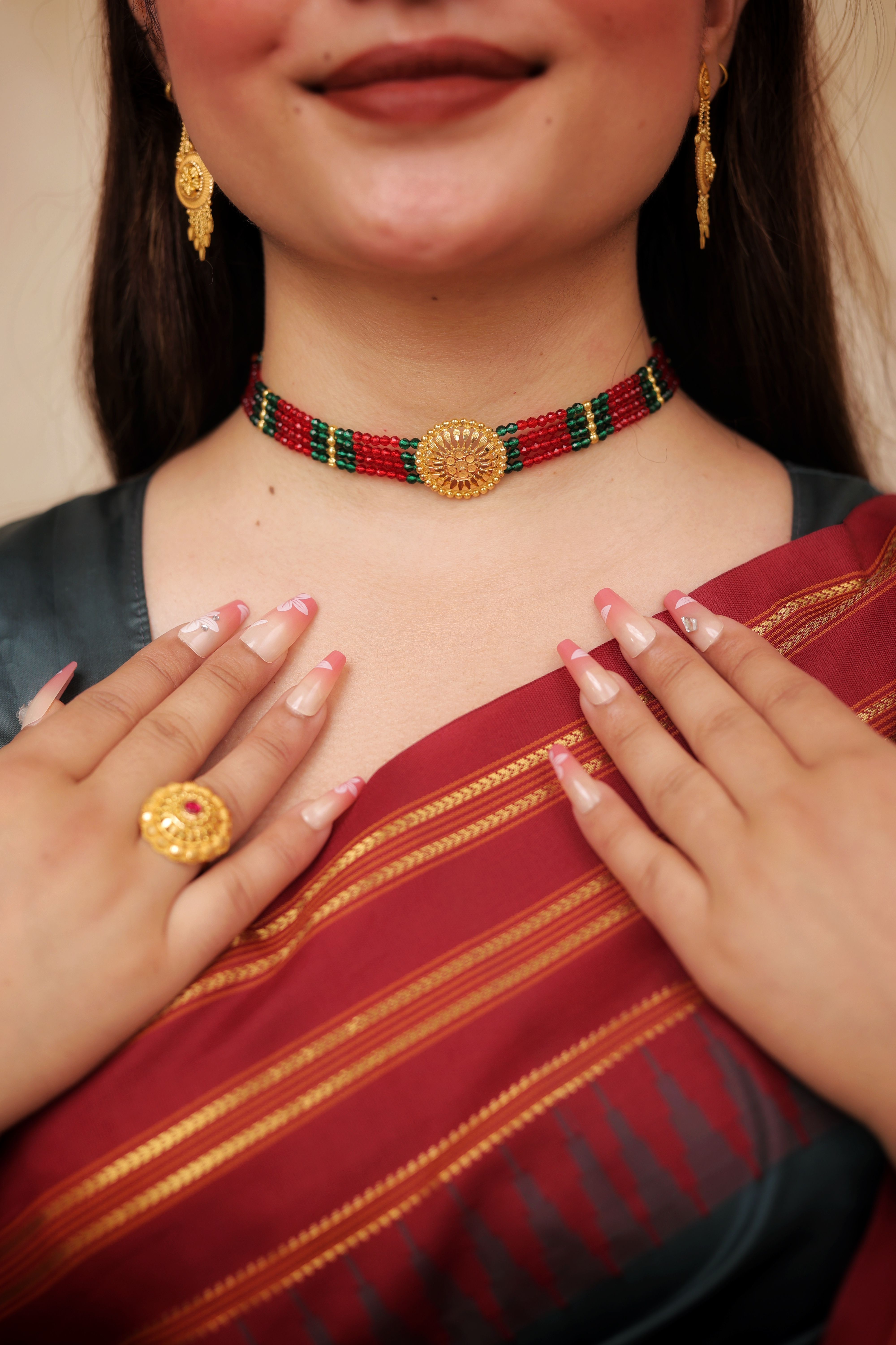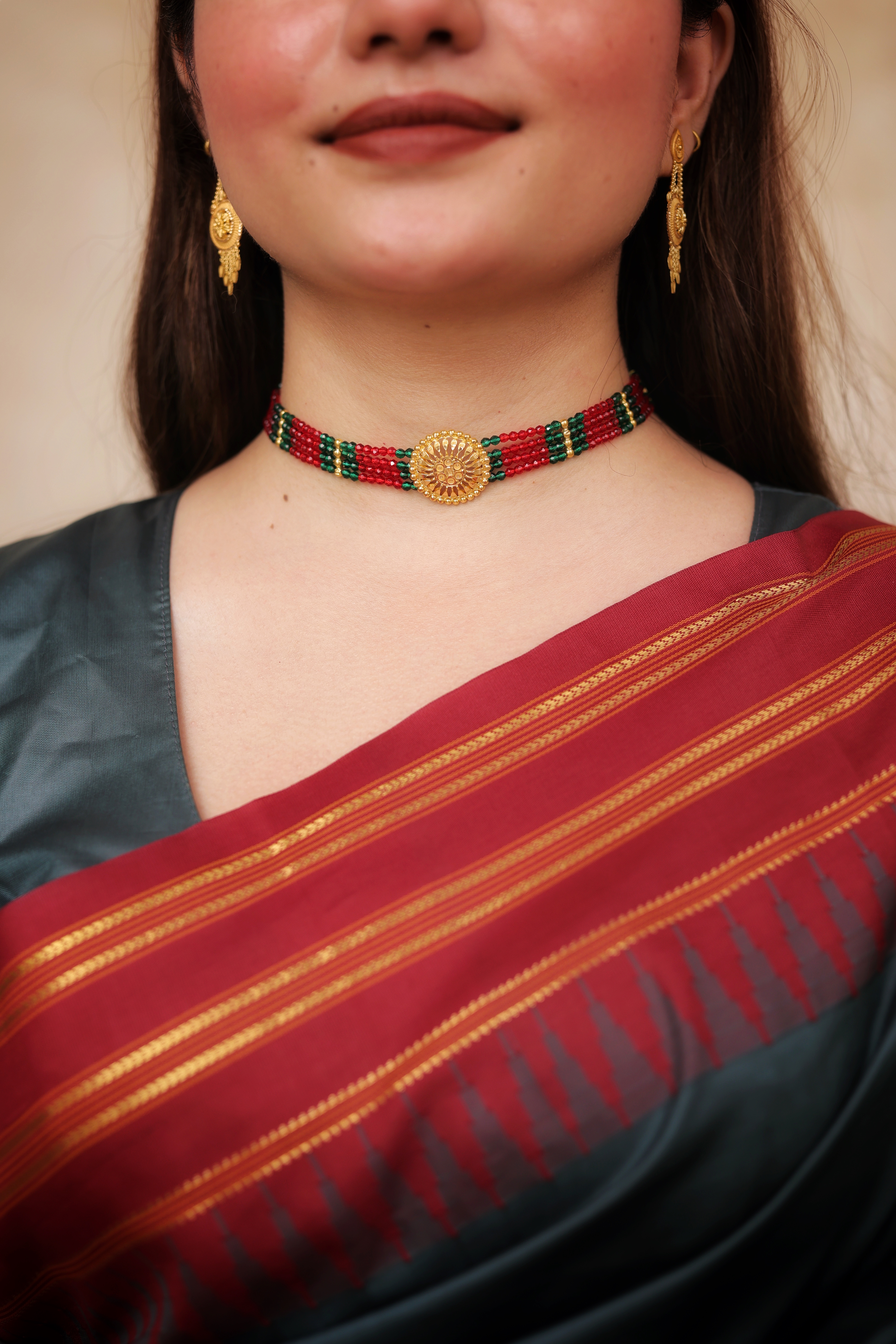 Red–Green Multi-Layer Beaded Chokhar with 22K Gold Round Motif | Traditional Rajasthani Choker | Jaishree Jewellers