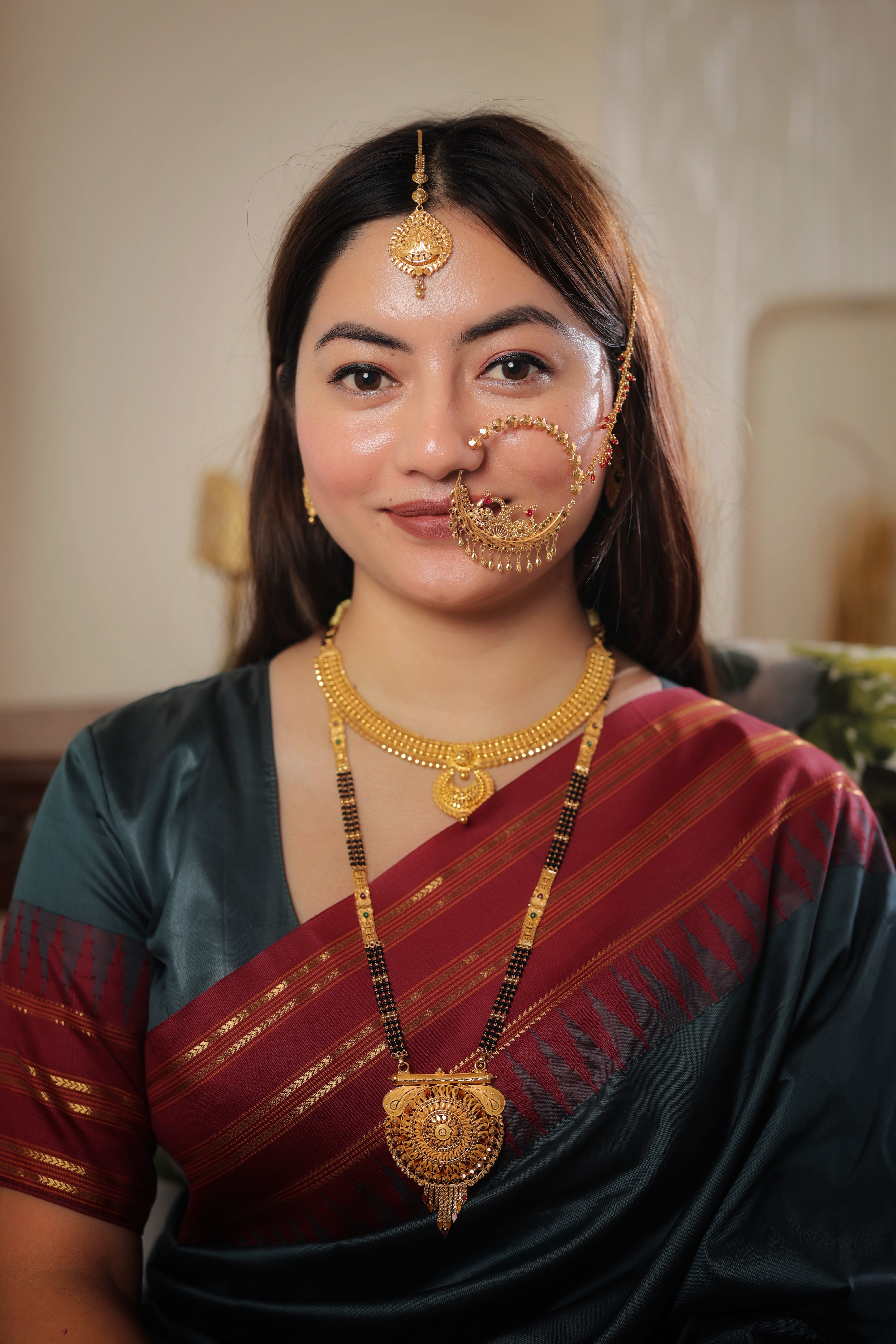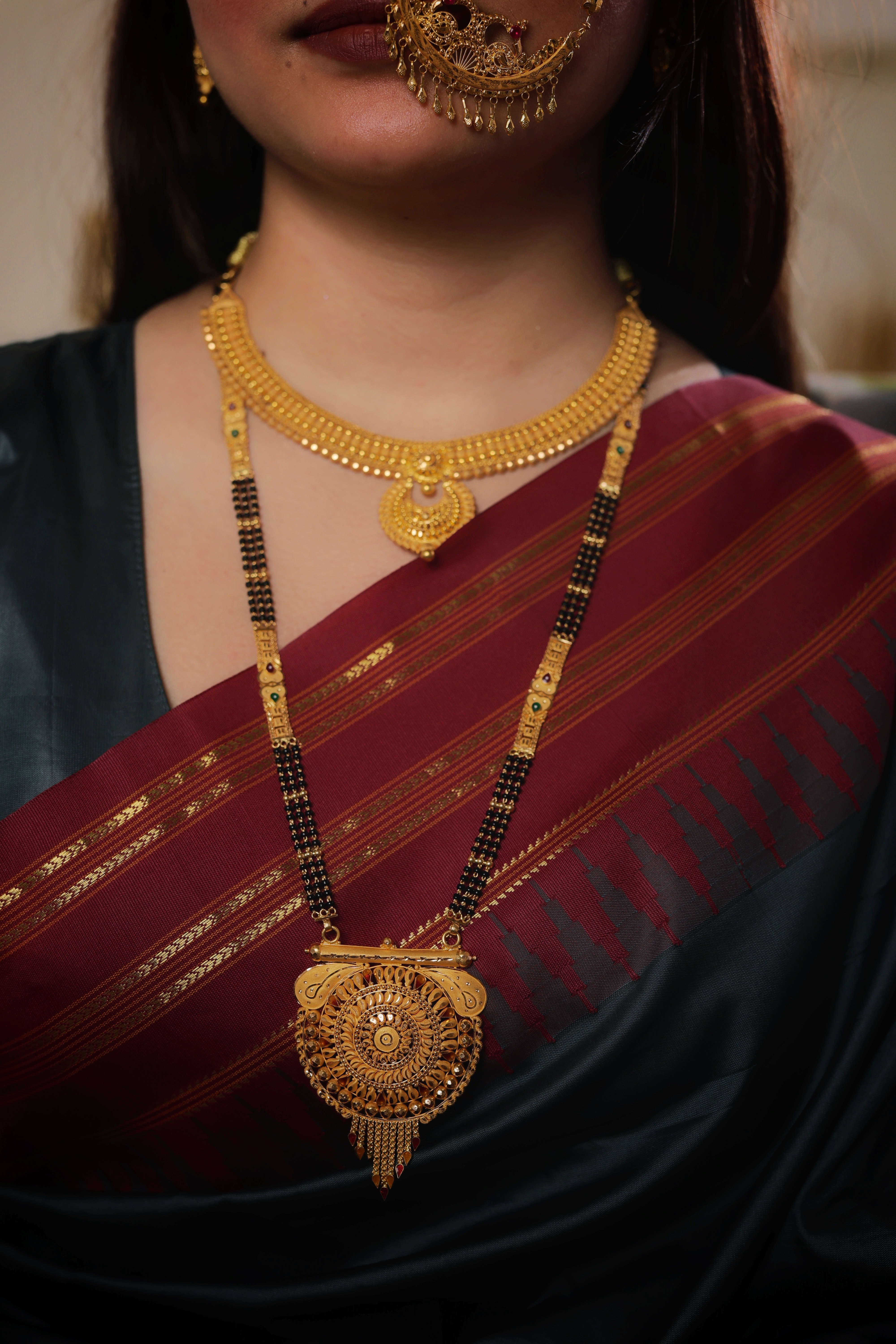 The Chain: The pendant is anchored by four strands of traditional black beads, signifying protection and the sacred bond of marriage. The chain is uniquely embellished with elongated gold spacers featuring enameled accents in red and green, alongside granulated gold beads that lead to a stately traditional length.