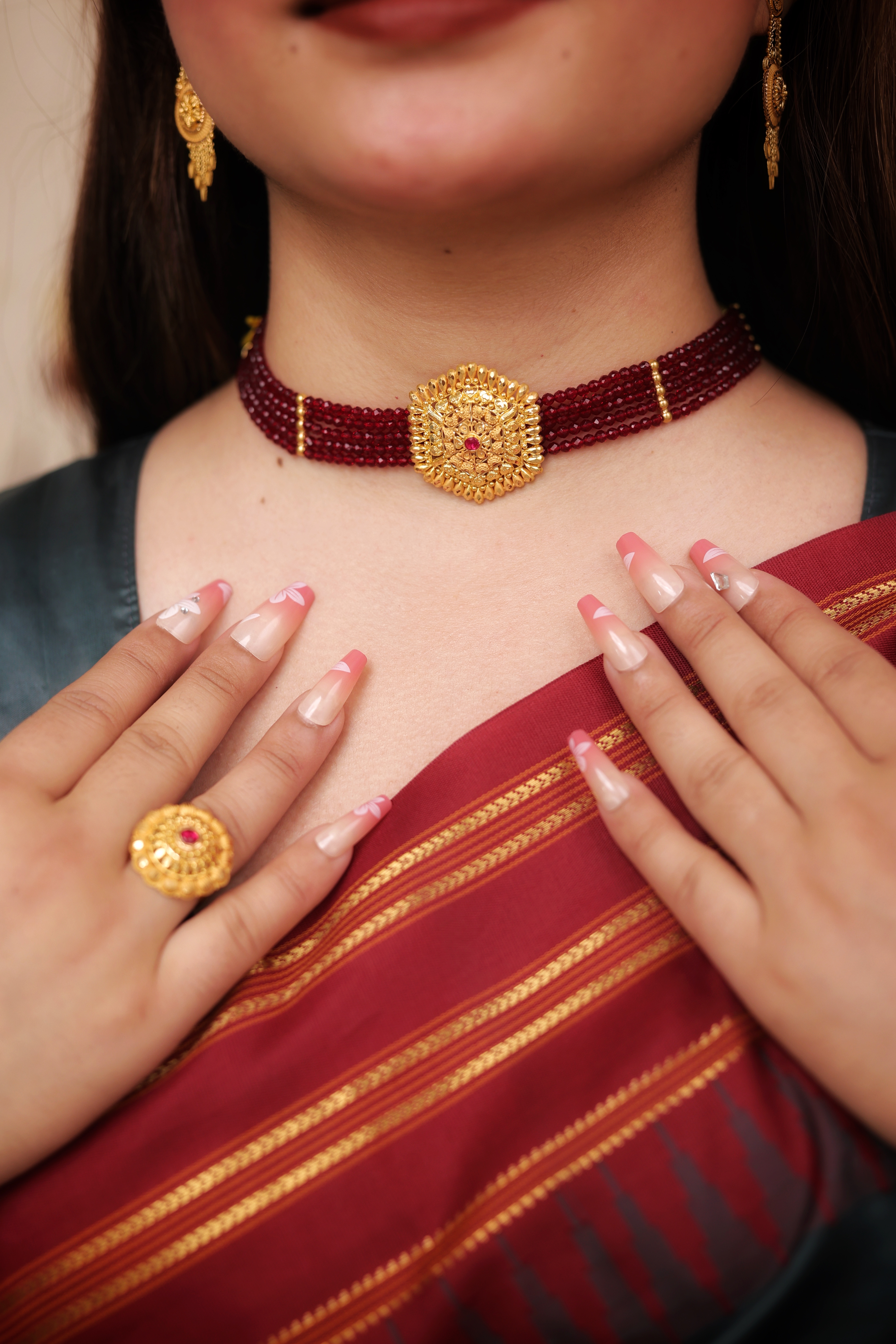 Maroon Multi-Strand Beaded Chokhar with 22K Gold Hexagonal Motif | Traditional Bridal Choker | Jaishree Jewellers