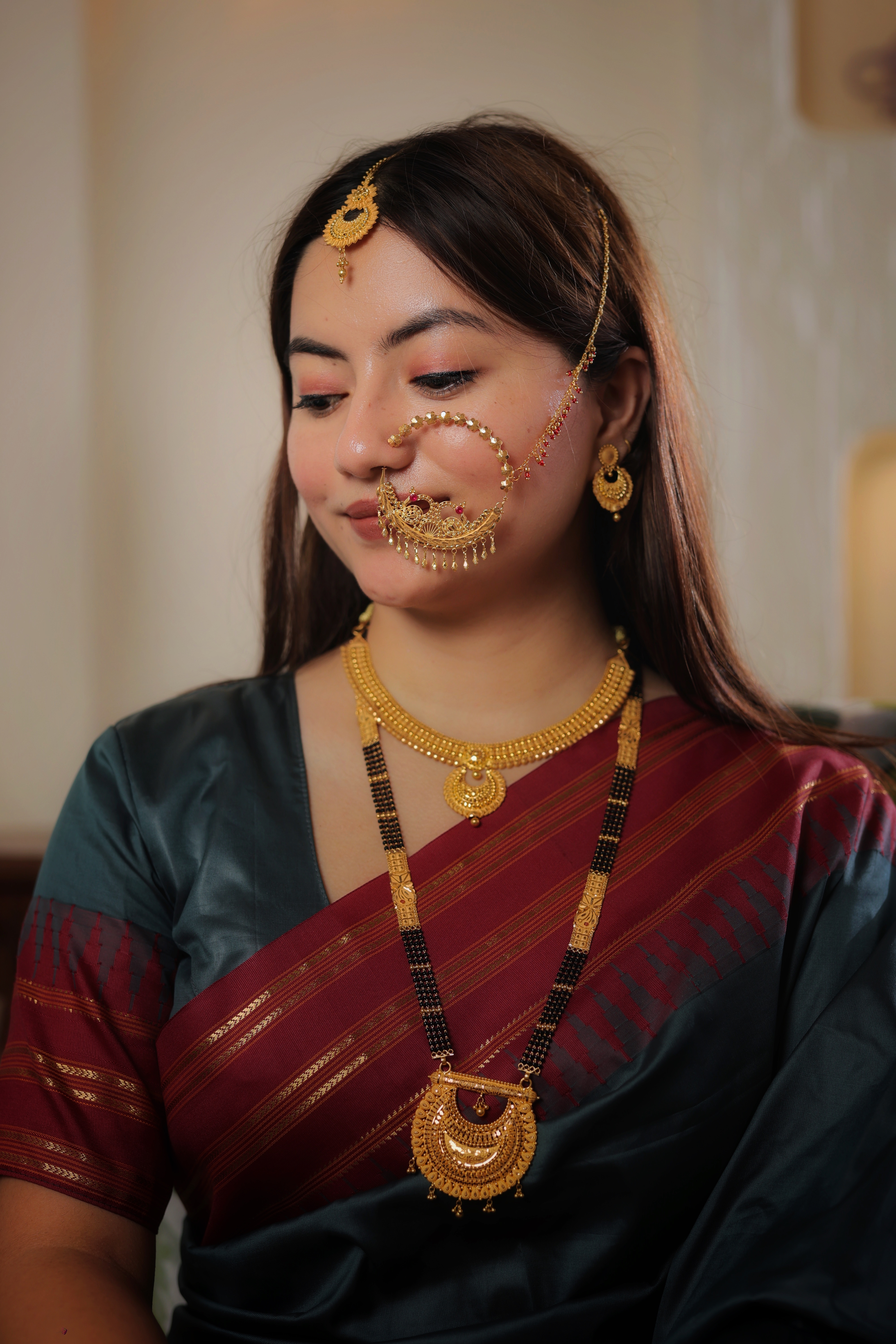 Key Features:Design: Majestic Crescent Chandbali Pendant with multi-layered filigree work. Chain Style: Traditional four-strand black bead configuration with ornate decorative gold spacers. Detailing: Features a dangling gold bead fringe and a central suspended sphere for added elegance. Metal Purity: 22 Carat Yellow Gold (916 purity). Usage: An exquisite statement piece designed for weddings, grand festivals, and important cultural ceremonies.