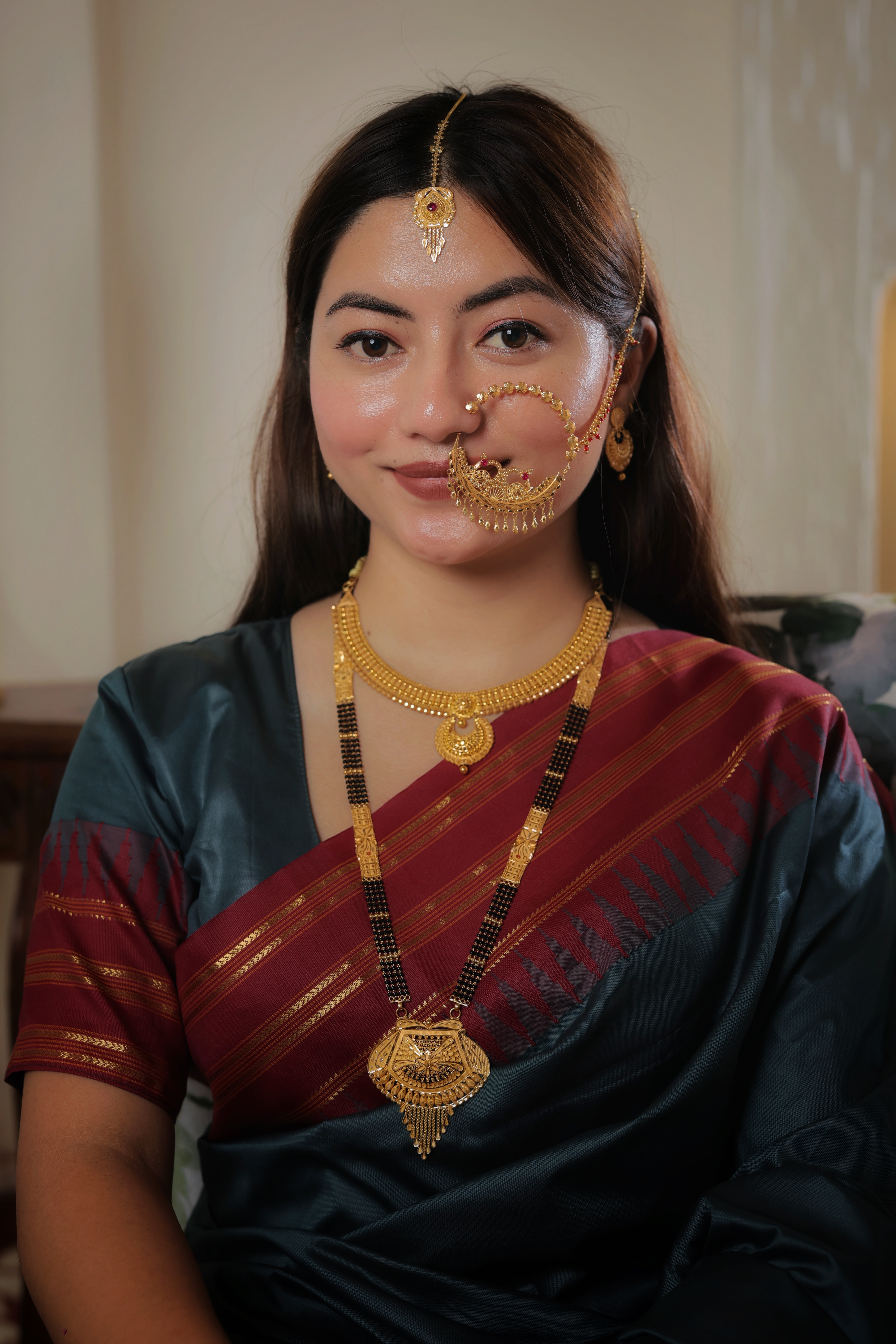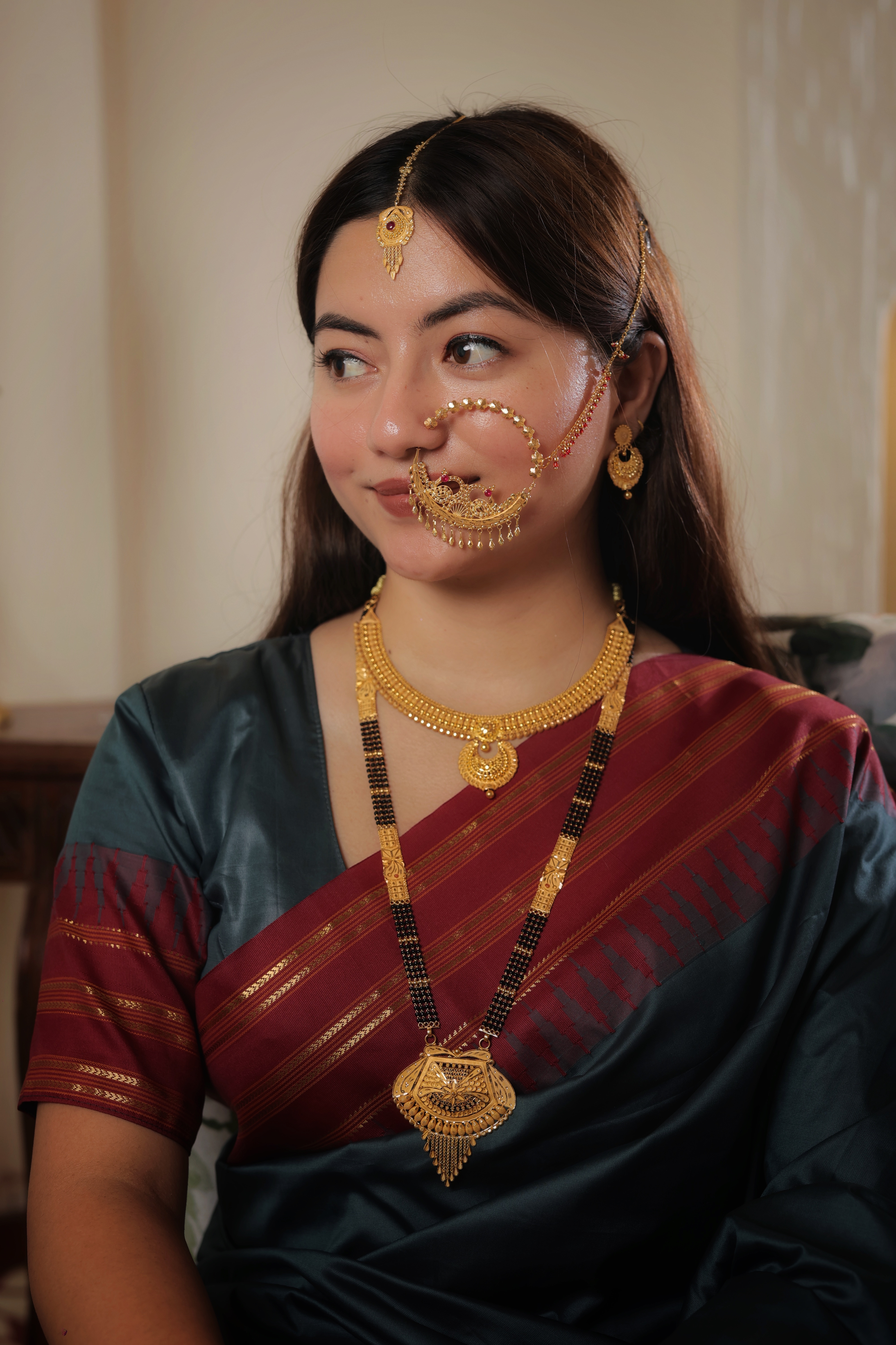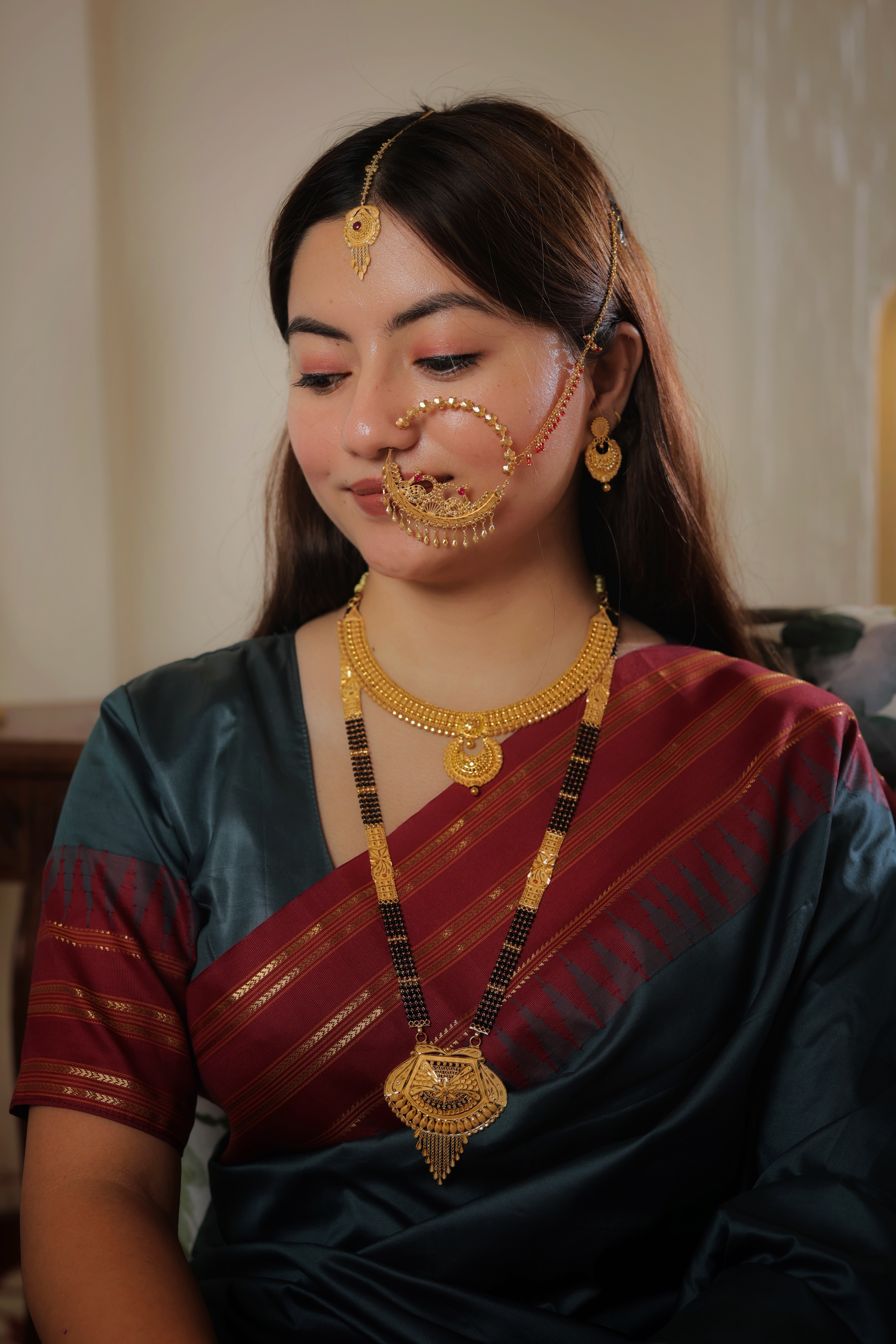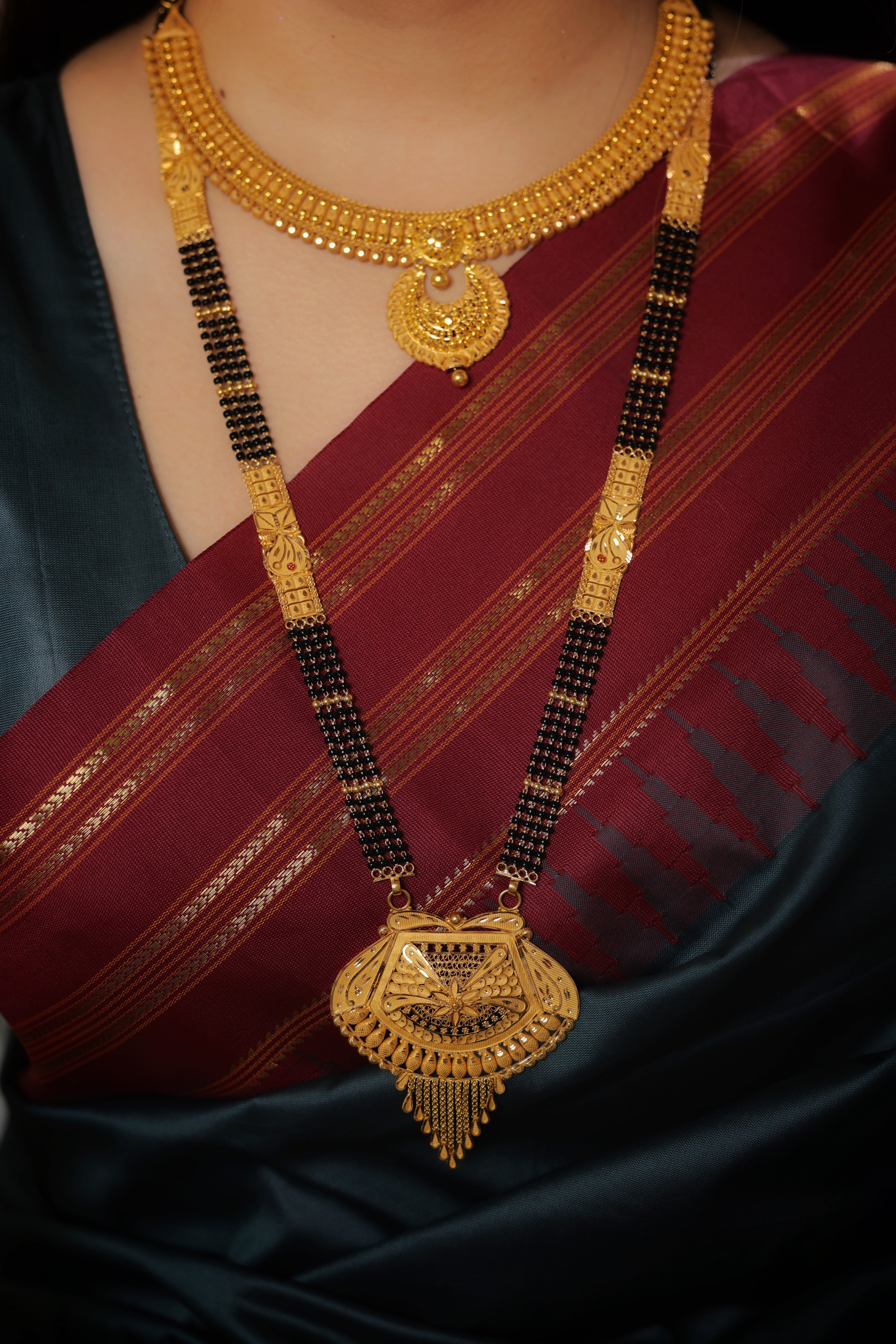 The Chain: The pendant is supported by four parallel strands of traditional black beads, signifying marital protection and strength. The chain is punctuated by ornate gold filigree spacers with delicate floral engravings, leading to a stately traditional length.