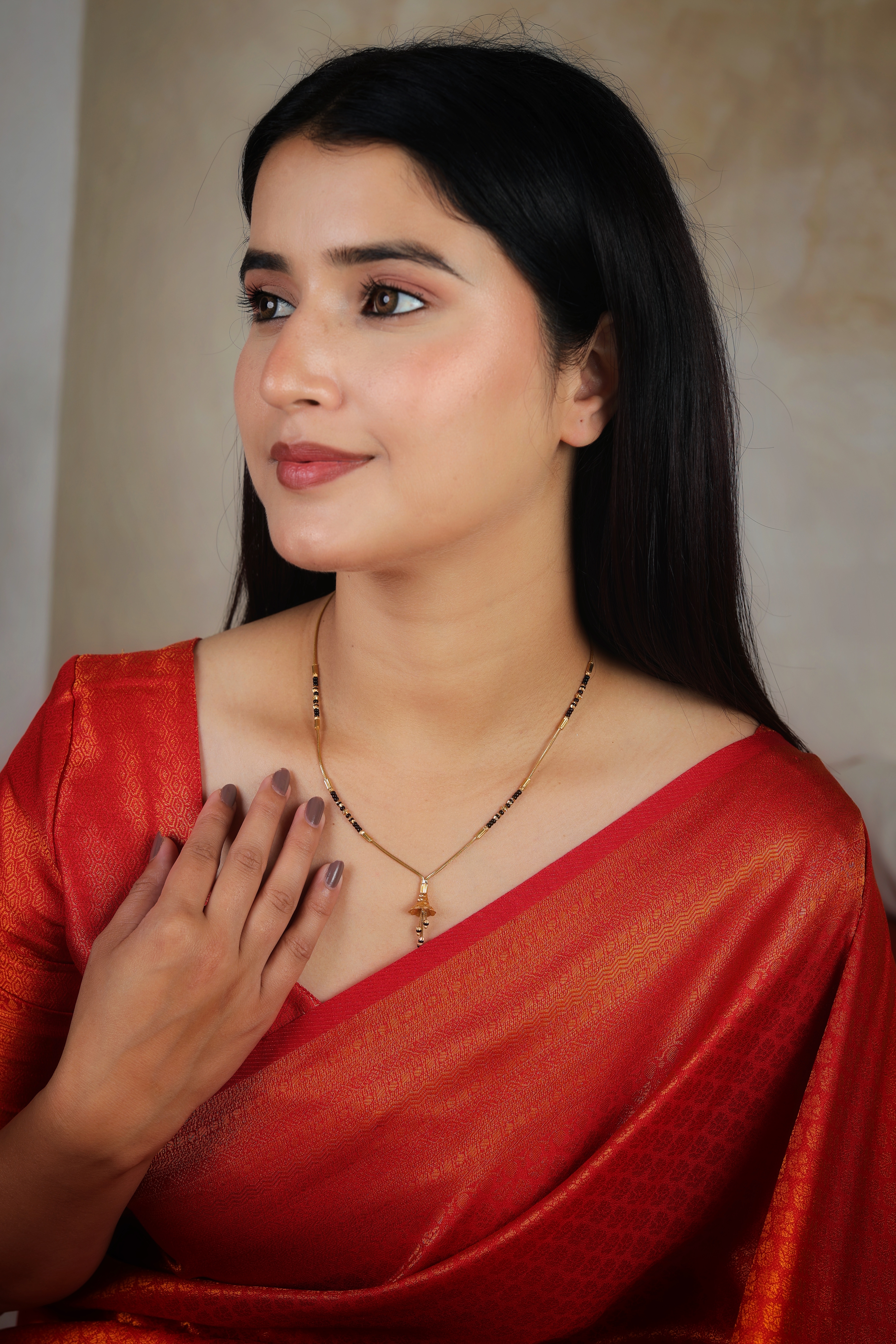 This sophisticated short mangalsutra offers a modern and graceful take on traditional matrimonial jewelry, masterfully crafted in rich 22-carat yellow gold (916 purity). Designed for the contemporary woman, its minimalist and airy silhouette makes it a perfect accessory for daily wear, effortlessly blending sacred tradition with a stylish aesthetic.
