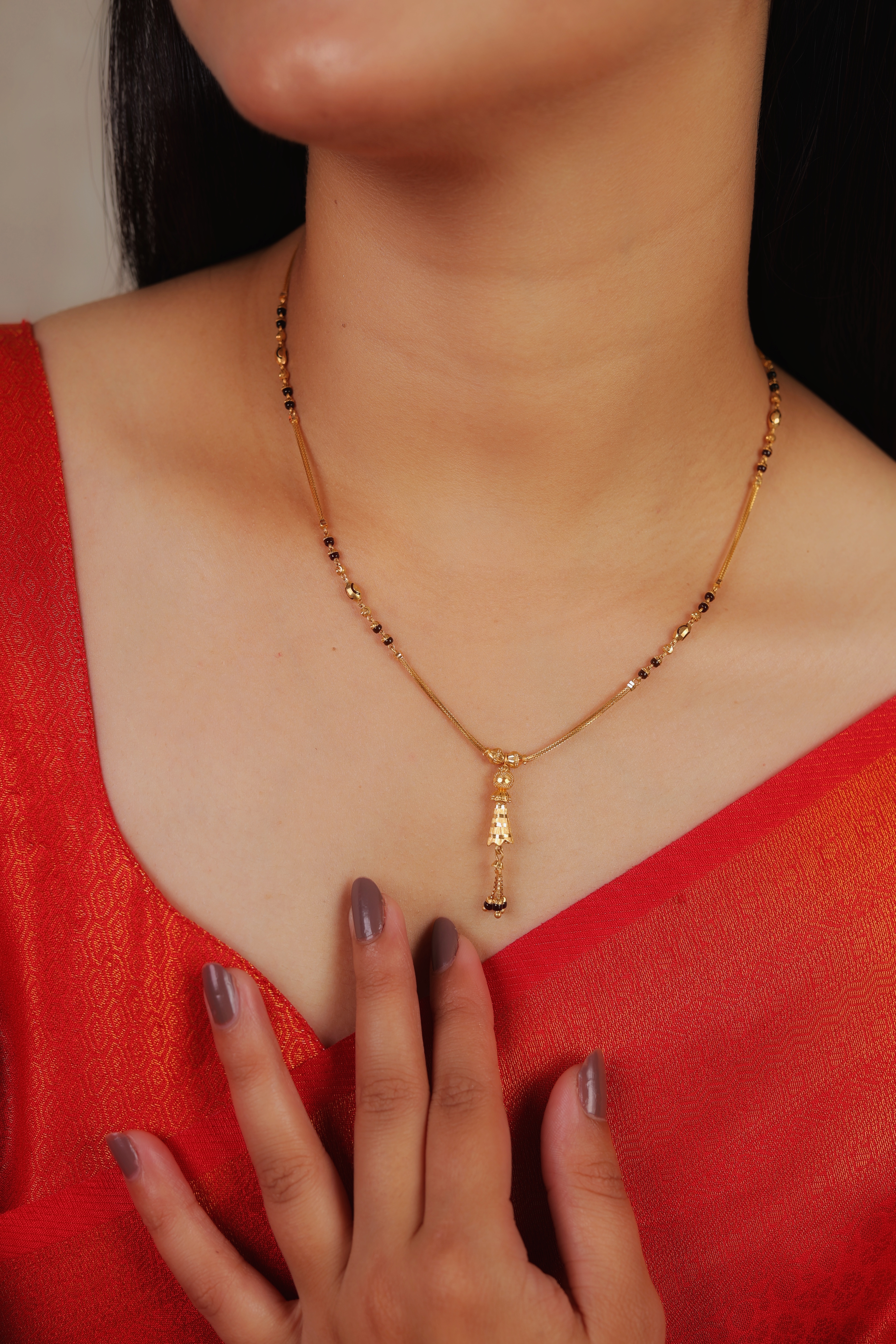 This sophisticated short mangalsutra offers a bold, architectural take on traditional matrimonial jewelry, masterfully crafted in 22-carat yellow gold (916 purity). Designed for the modern woman who seeks a unique aesthetic, this piece balances sharp geometric forms with the delicate, sacred symbolism of the mangalsutra.