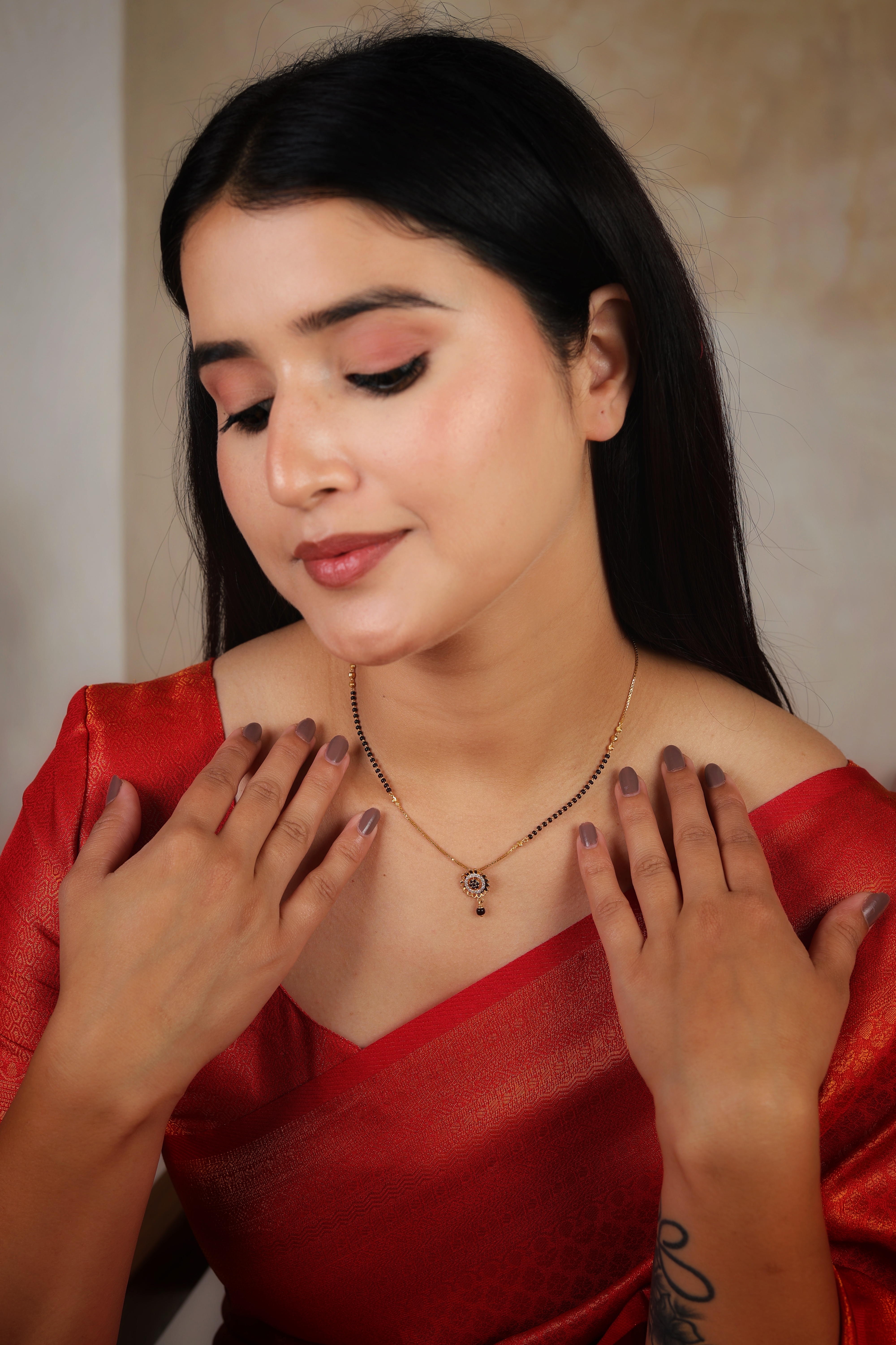 The Accents: The chain is elegantly punctuated with small clusters of traditional black beads and tiny gold spacers. These elements are placed symmetrically to honor the piece’s sacred protective roots while maintaining a refined, minimalist profile.