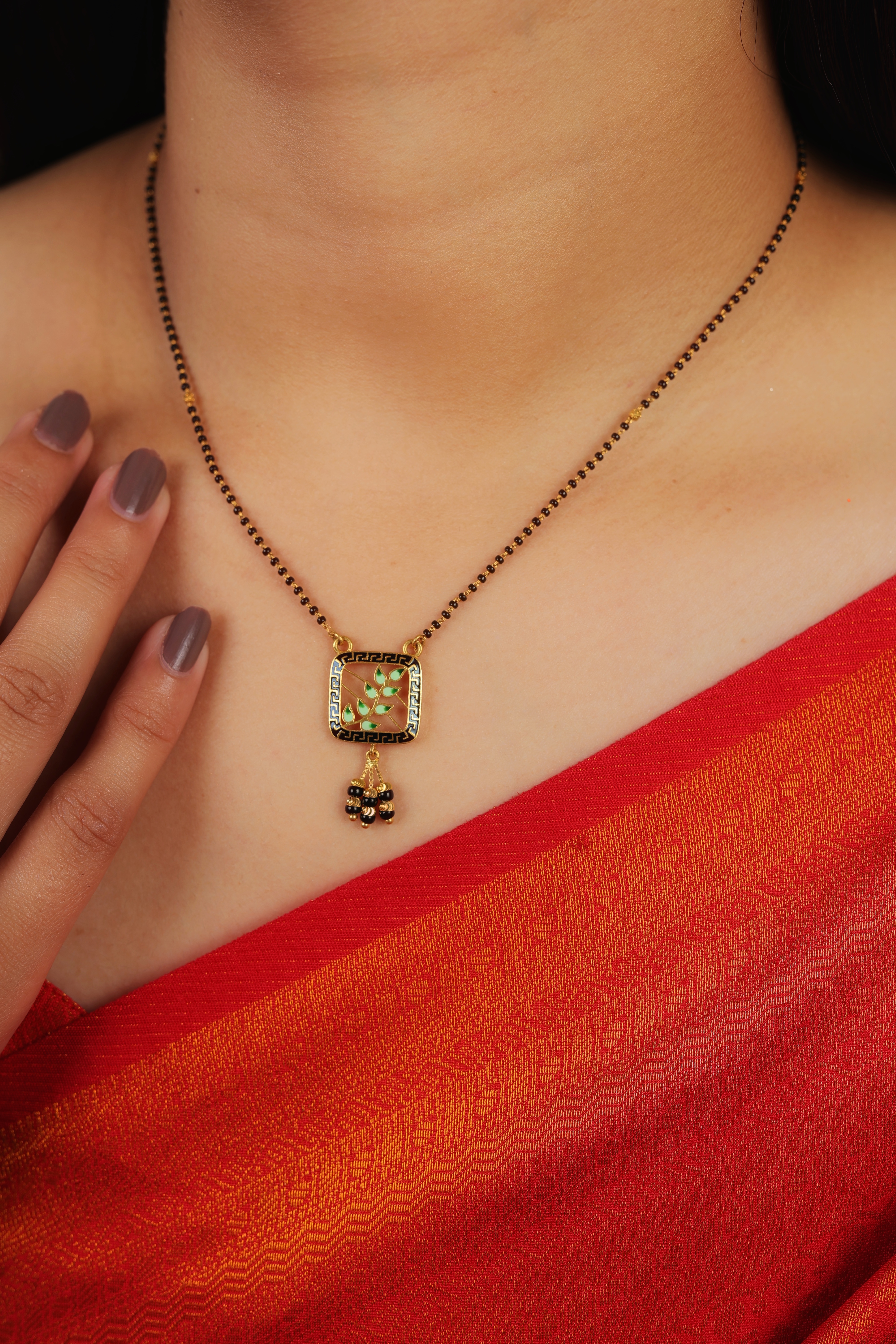 A striking modern short mangalsutra featuring a geometric square pendant adorned with vibrant green enamel leaves and a classic black bead chain.