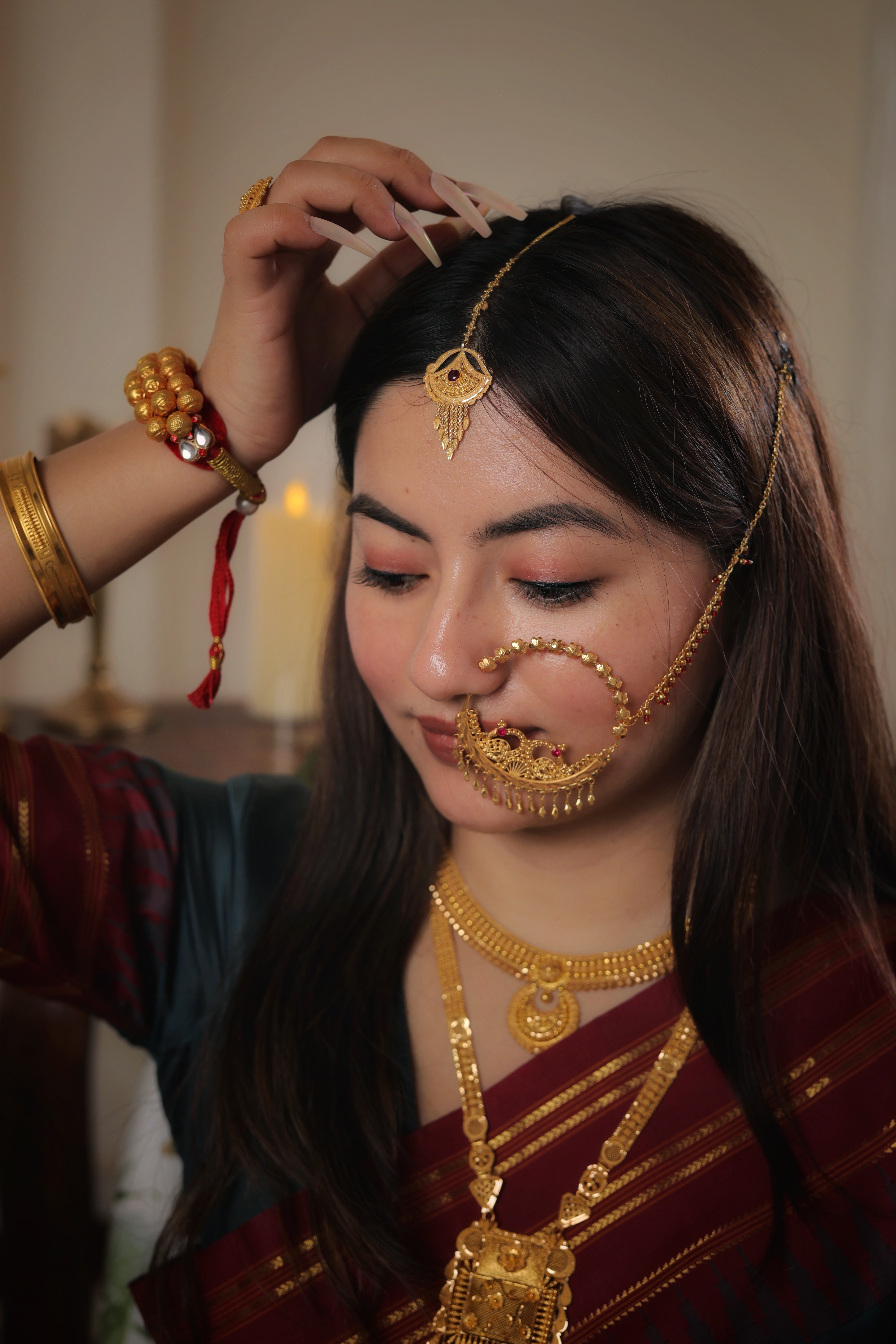 The Medallion: The focal point is a sophisticated crescent-shaped (Chandbali) medallion featuring a vibrant red ruby at its center. The Craftsmanship: The gold surface is adorned with complex filigree, granular textures, and micro-etched patterns that create a radiant sunburst effect. The Tassels: Suspending from the base is a luxurious multi-strand tassel composed of fine gold chains. Artisanal Finish: Each strand terminates in a petite, etched leaf-motif droplet, providing a sense of fluid movement and classic opulence. The Chain: The piece is supported by a slender gold link chain featuring tiny ornamental spacers, ensuring a seamless and luxurious look from the hairline to the forehead.