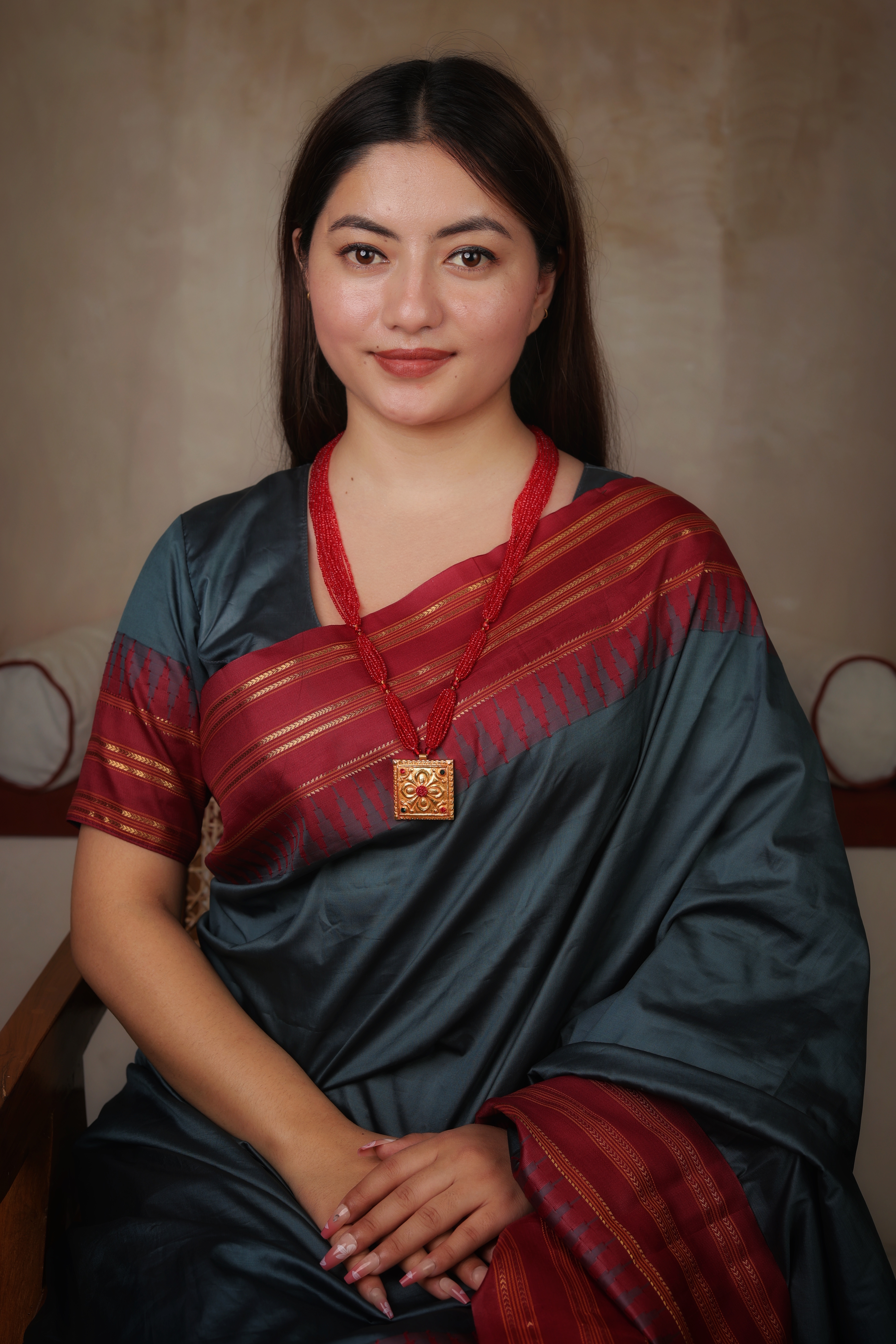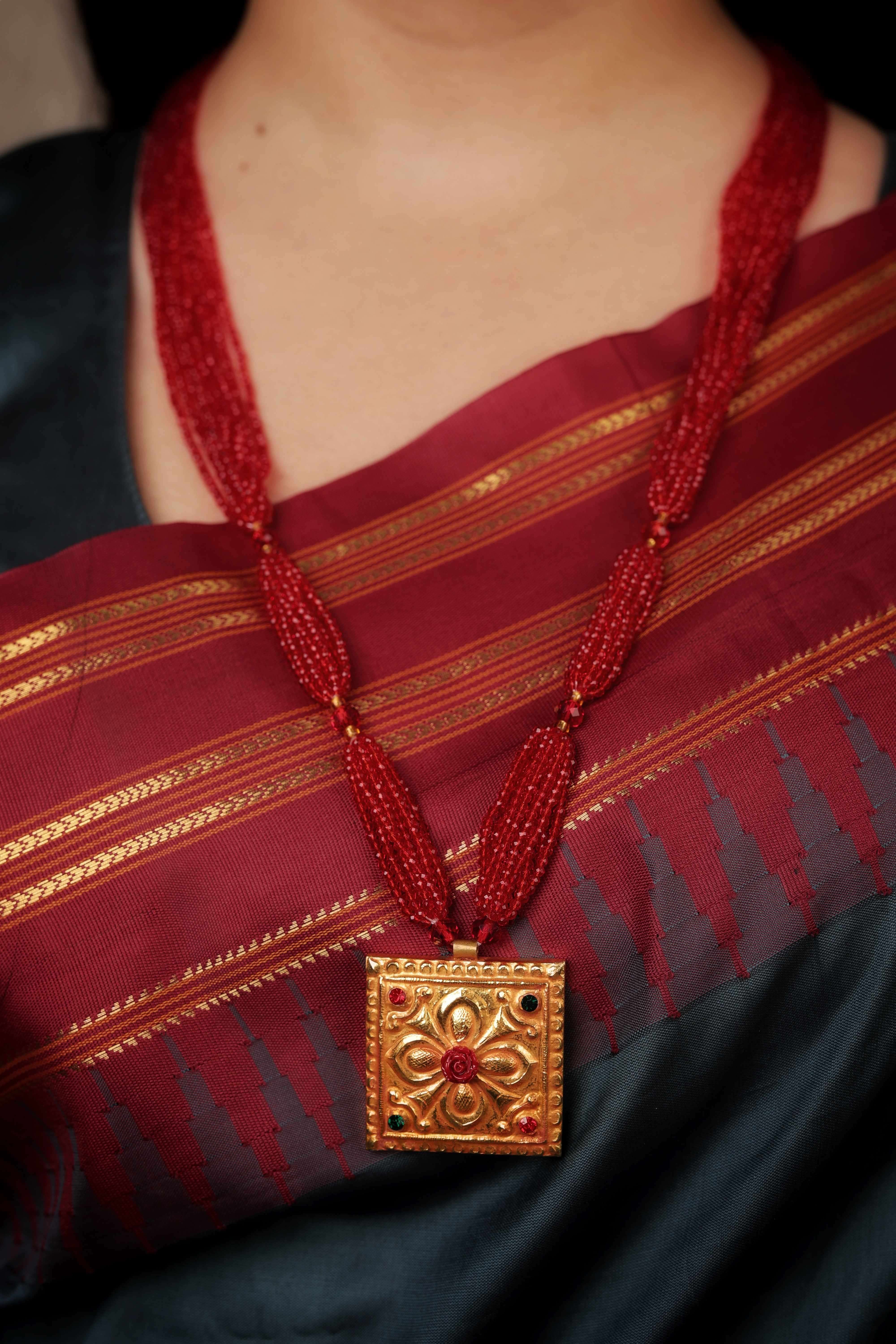 Crafted in pure 24K gold with authentic antique finish Square temple-style pendant with intricate traditional motifs Accented with subtle red and green stone detailing Multi-strand red-bead chain adds richness and grandeur Inspired by classic temple and heritage jewellery designs Ideal for bridal wear, festive occasions, and antique jewellery lovers
