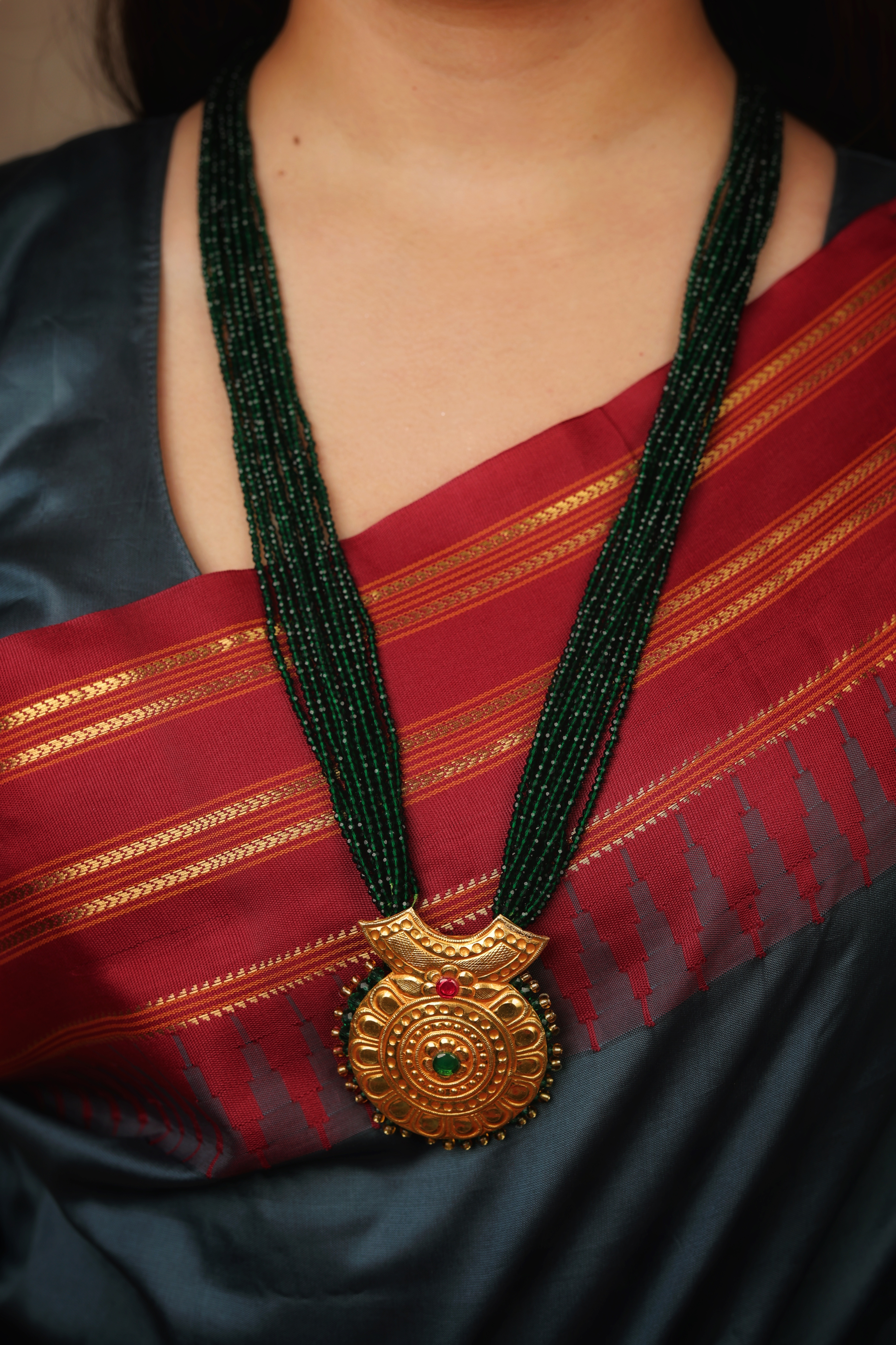 A timeless Antique Jewellery necklace crafted in pure 24K gold, featuring a richly embossed circular pendant paired with elegant multi-strand green beads.